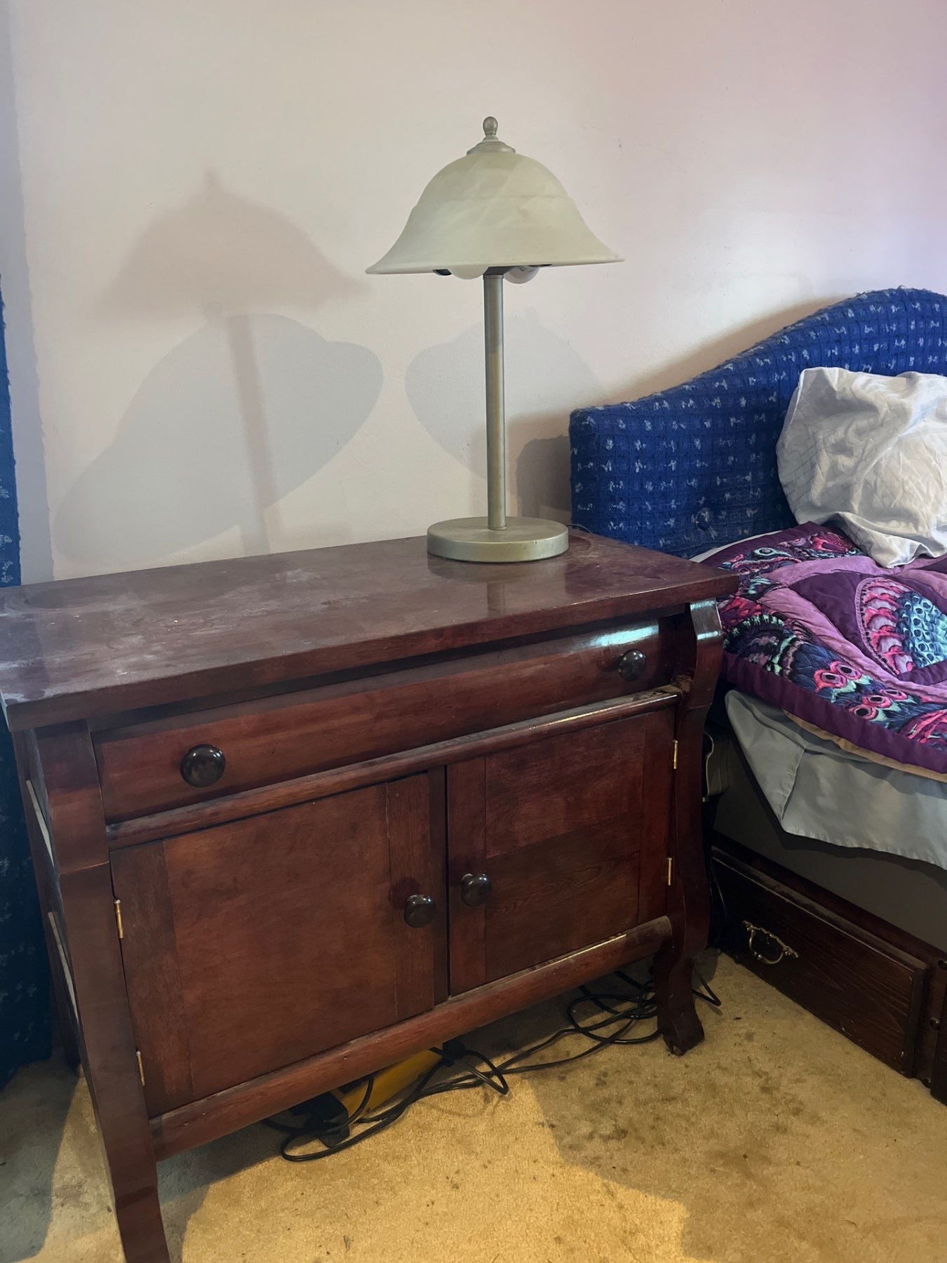 -Pair of Antique Wood night stand with lamp 33”wide 33 height 17 wide small Wood night stand 27”W 24”H 14” deep