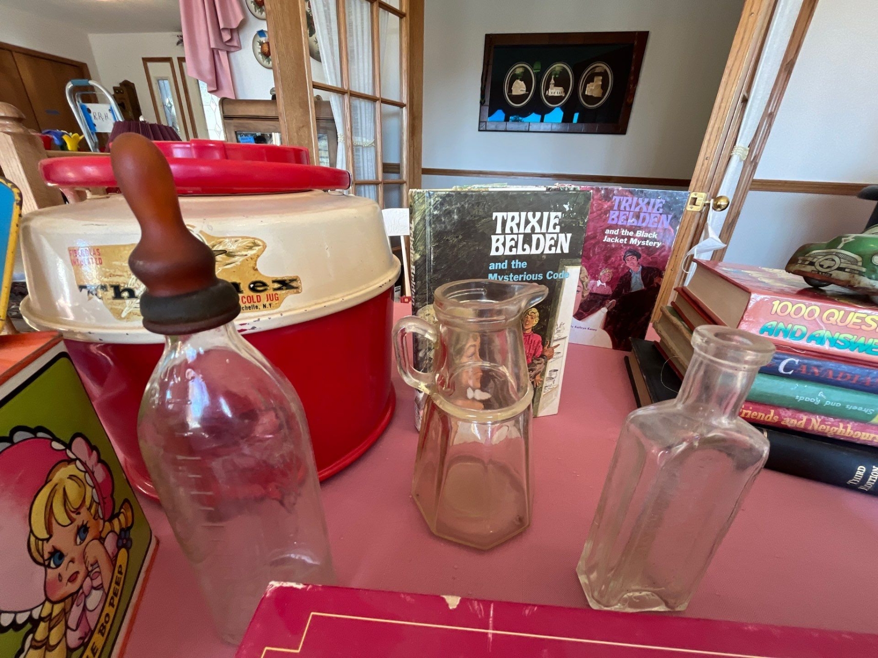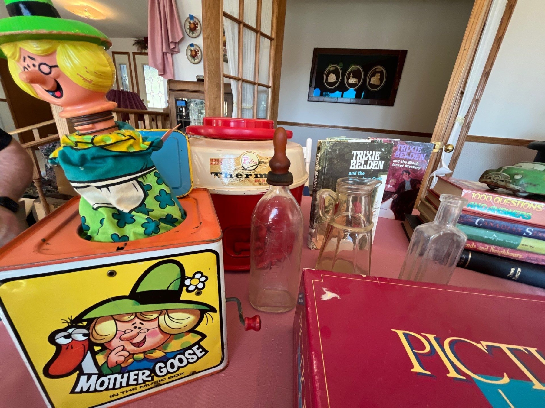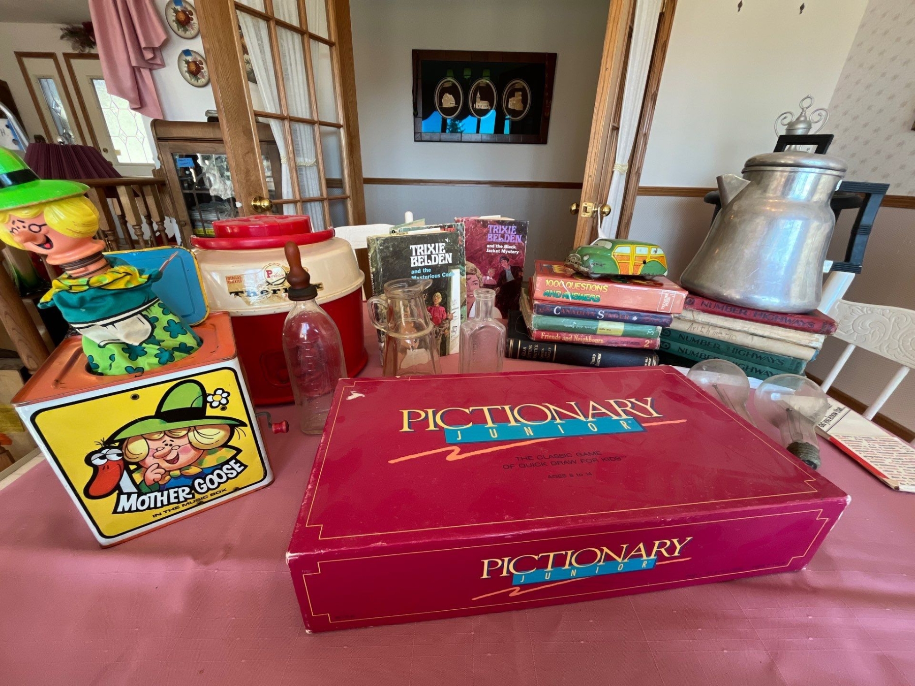 -antique Mother Goose and tin truck with a vintage Thermax, water, jug, coffee kettle, antique bottles and hand blown electric lights with a number of books & Pictionary game.