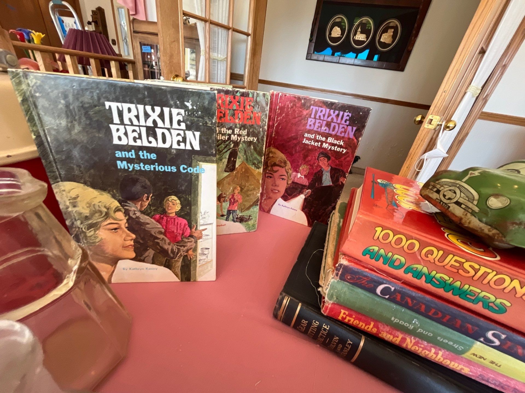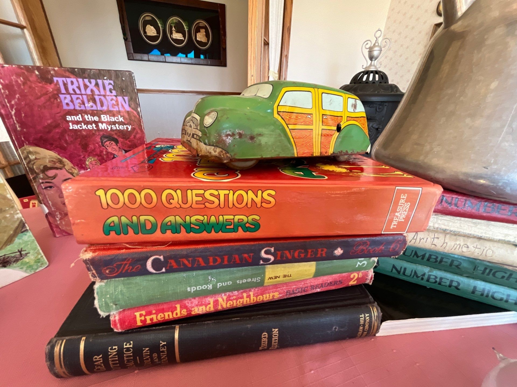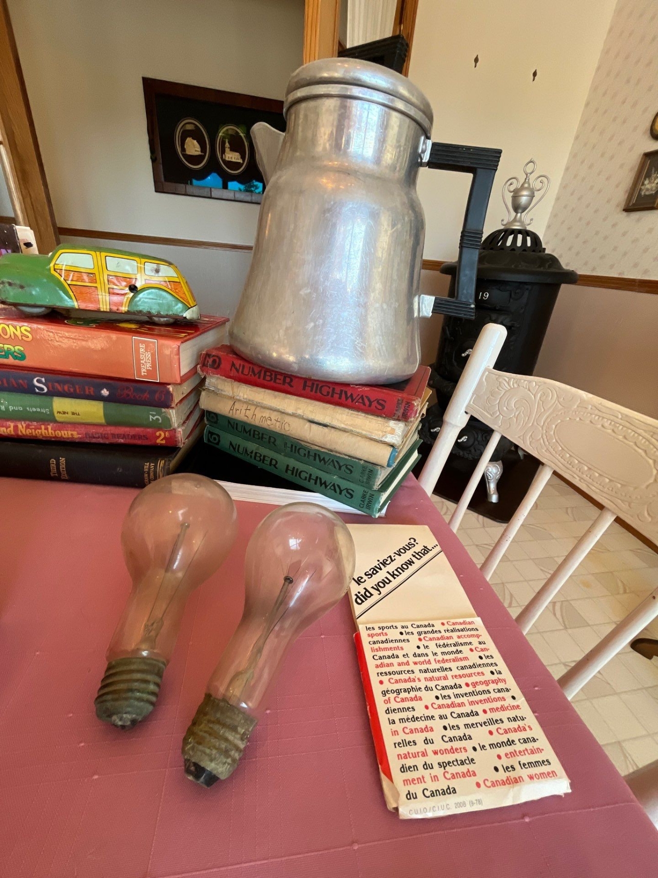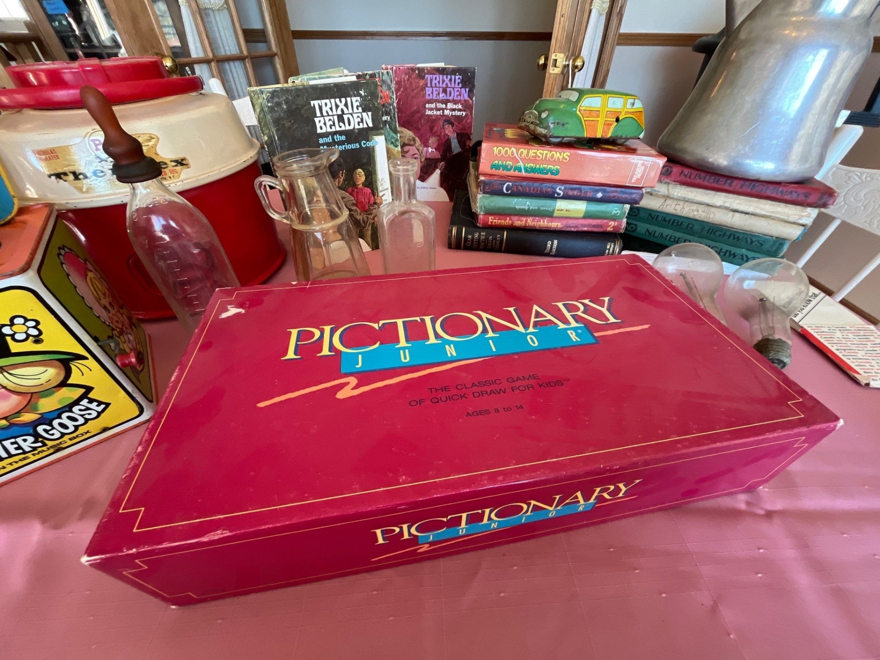 -antique Mother Goose and tin truck with a vintage Thermax, water, jug, coffee kettle, antique bottles and hand blown electric lights with a number of books & Pictionary game.