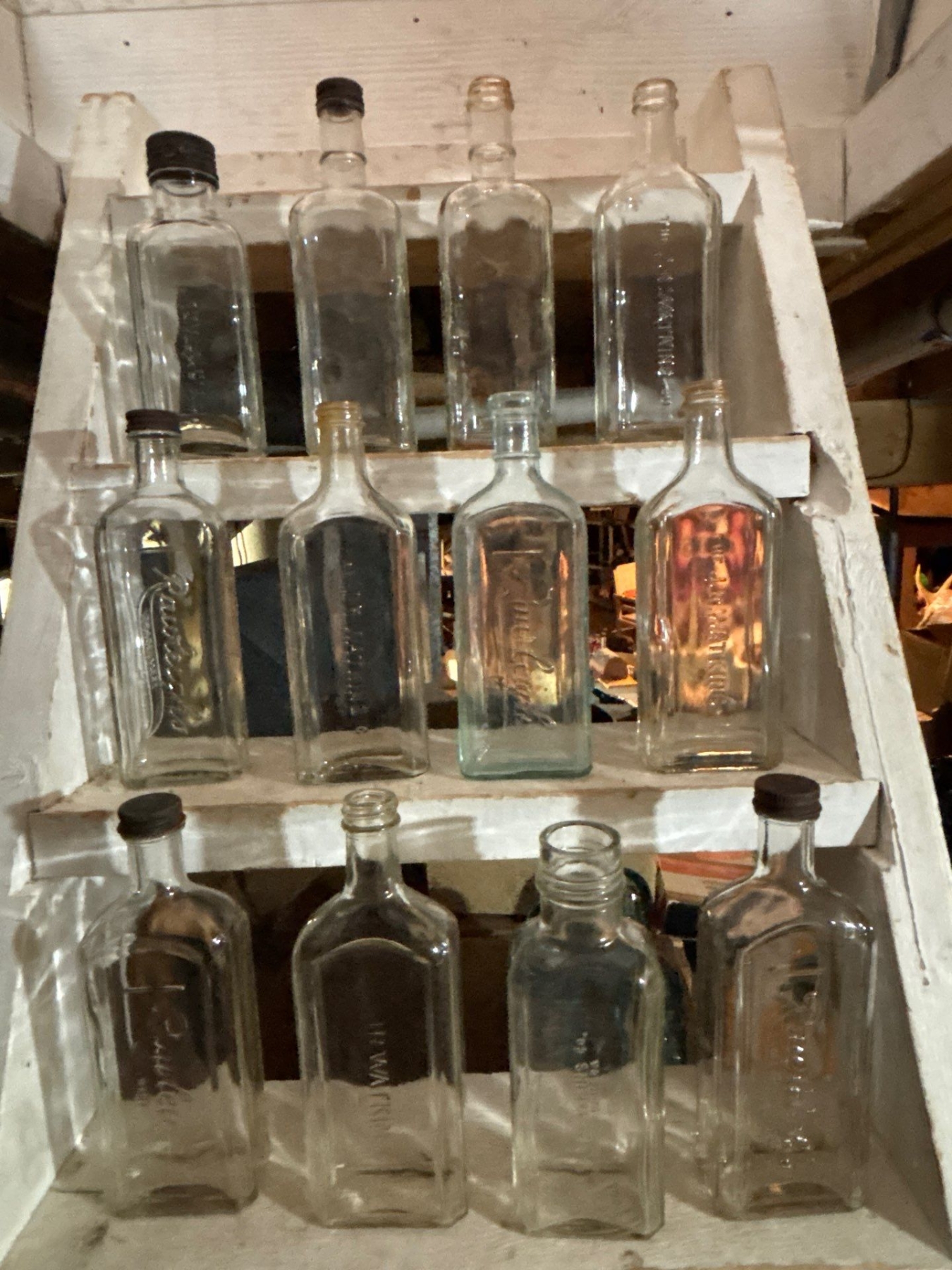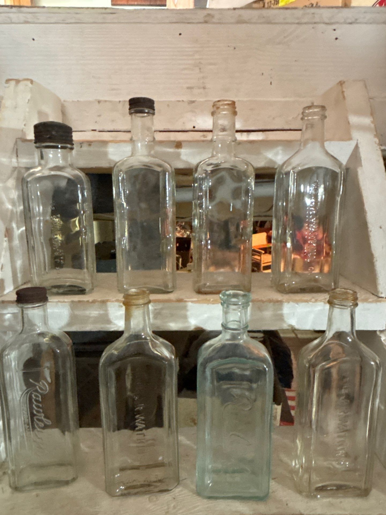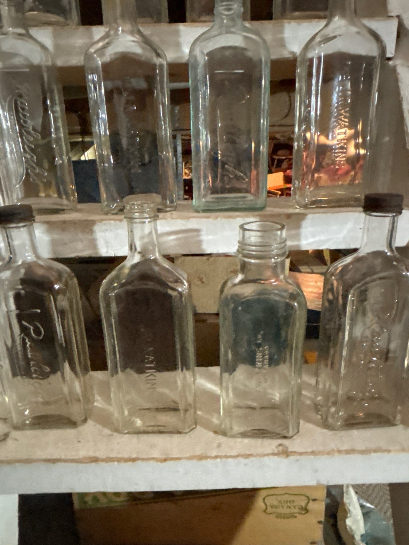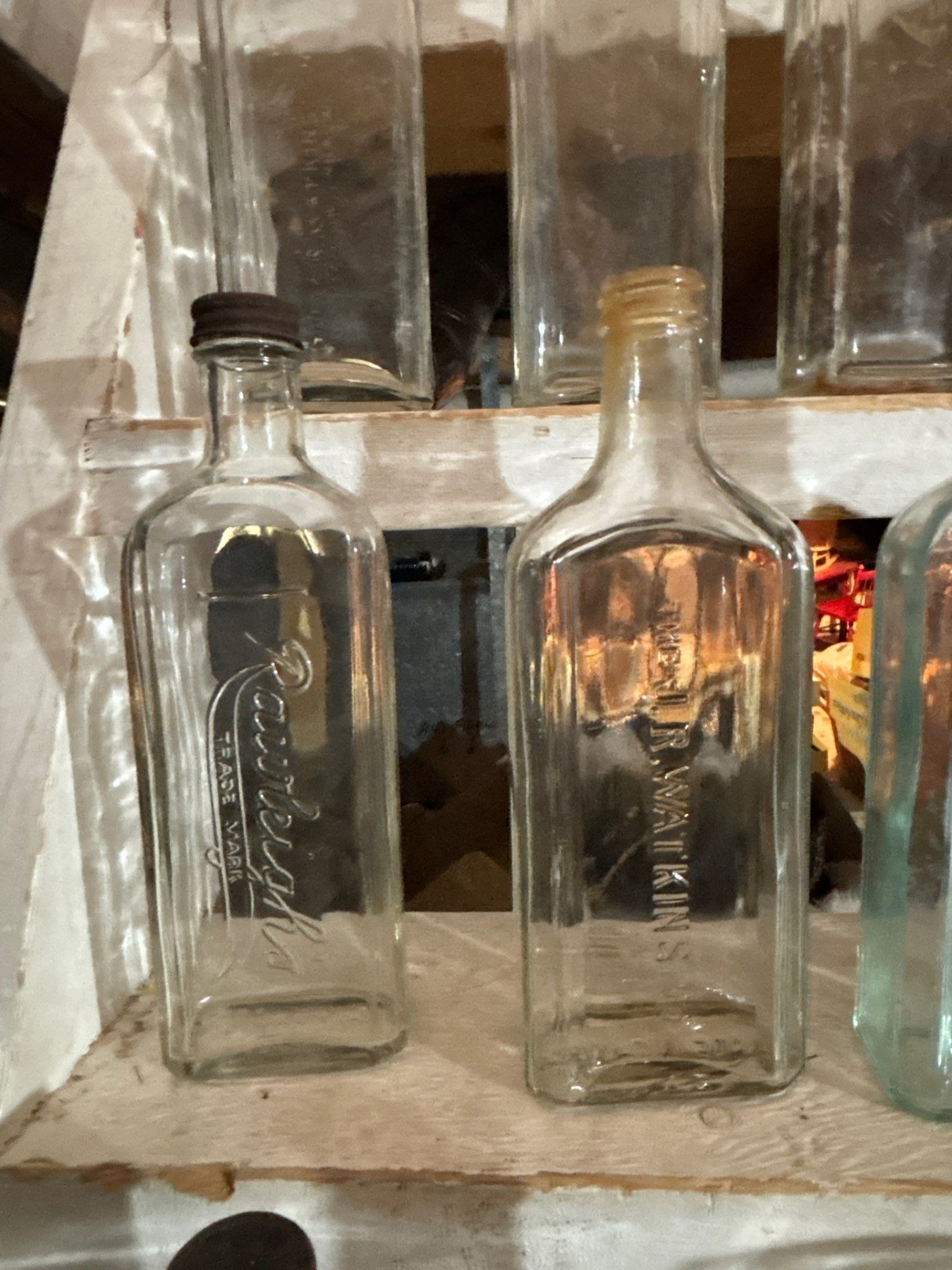 -collection of 12 various medicine bottles by Watkins Rawleigh's embossed glass medicine bottles and some unmarked clear bottles with caps