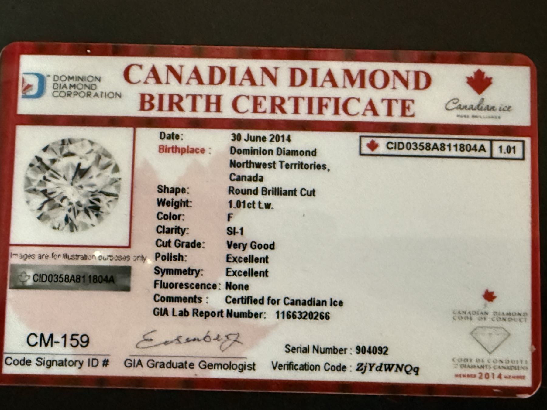 1.01 SI1 F Caret Round Brilliant Cut Canadian Diamond 6.6g 14K Appraised $24,345.00