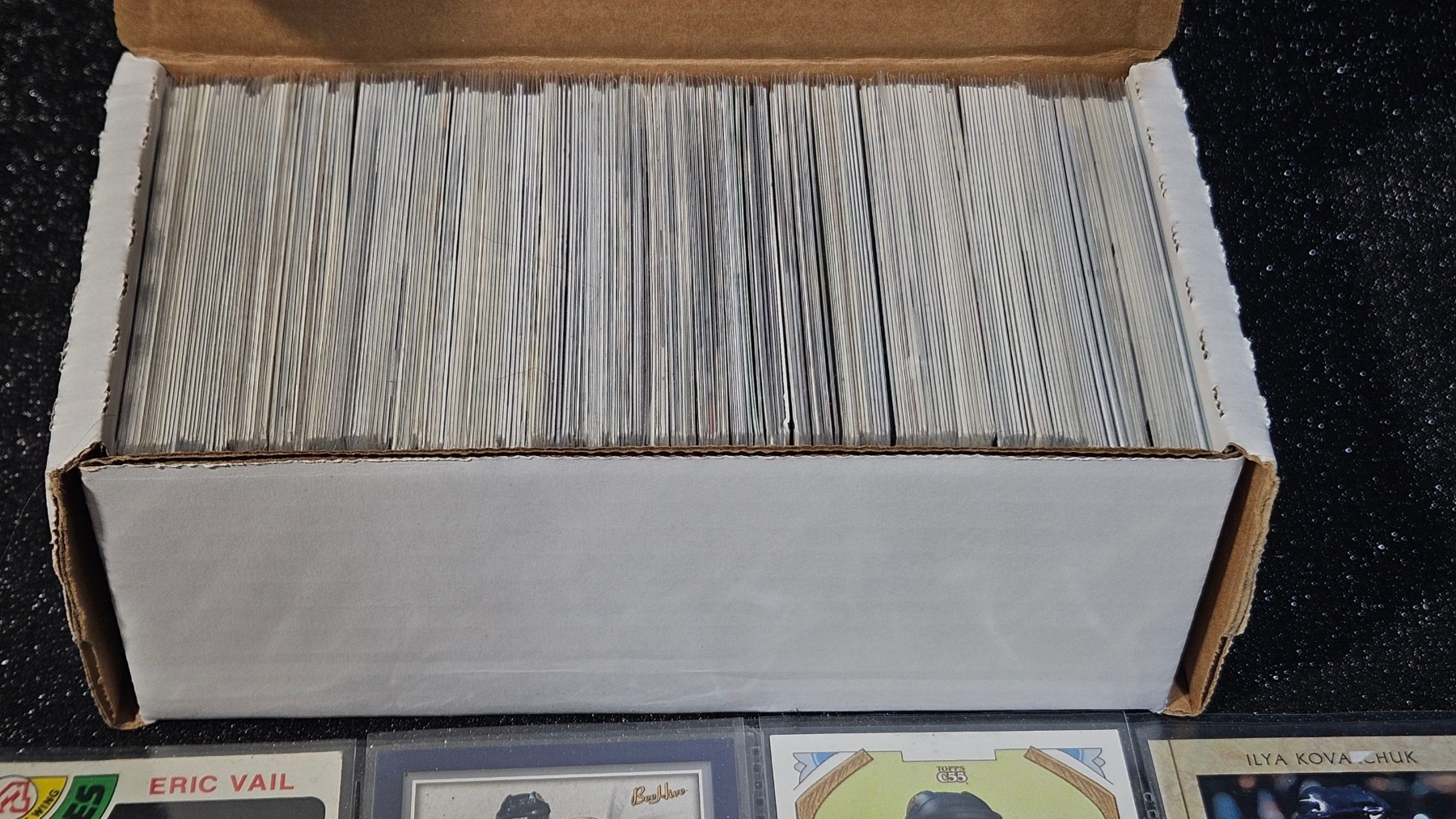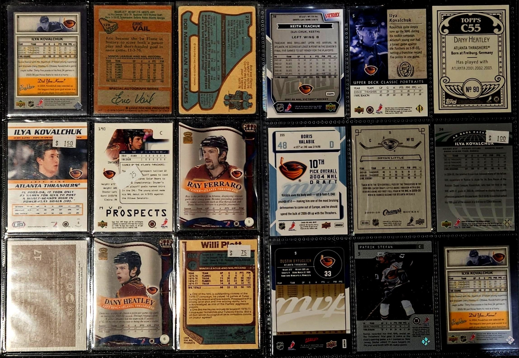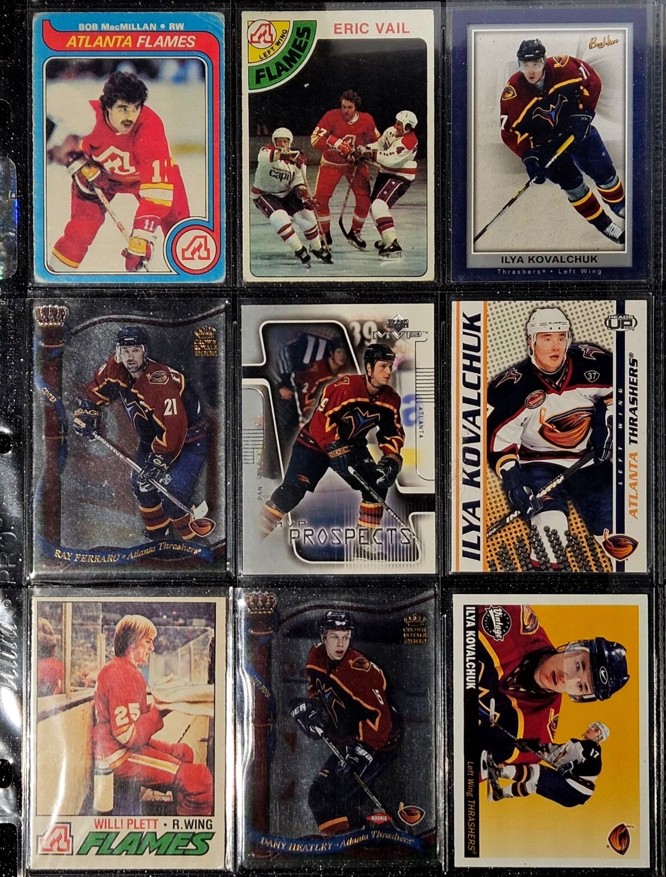 Lot includes one box of various rarity Atlanta Flames & Atlanta Thrasher hockey cards from 1972 to 2026, and includes two plastic card holder sleeves of various rarity Atlanta Flames trading hockey cards.