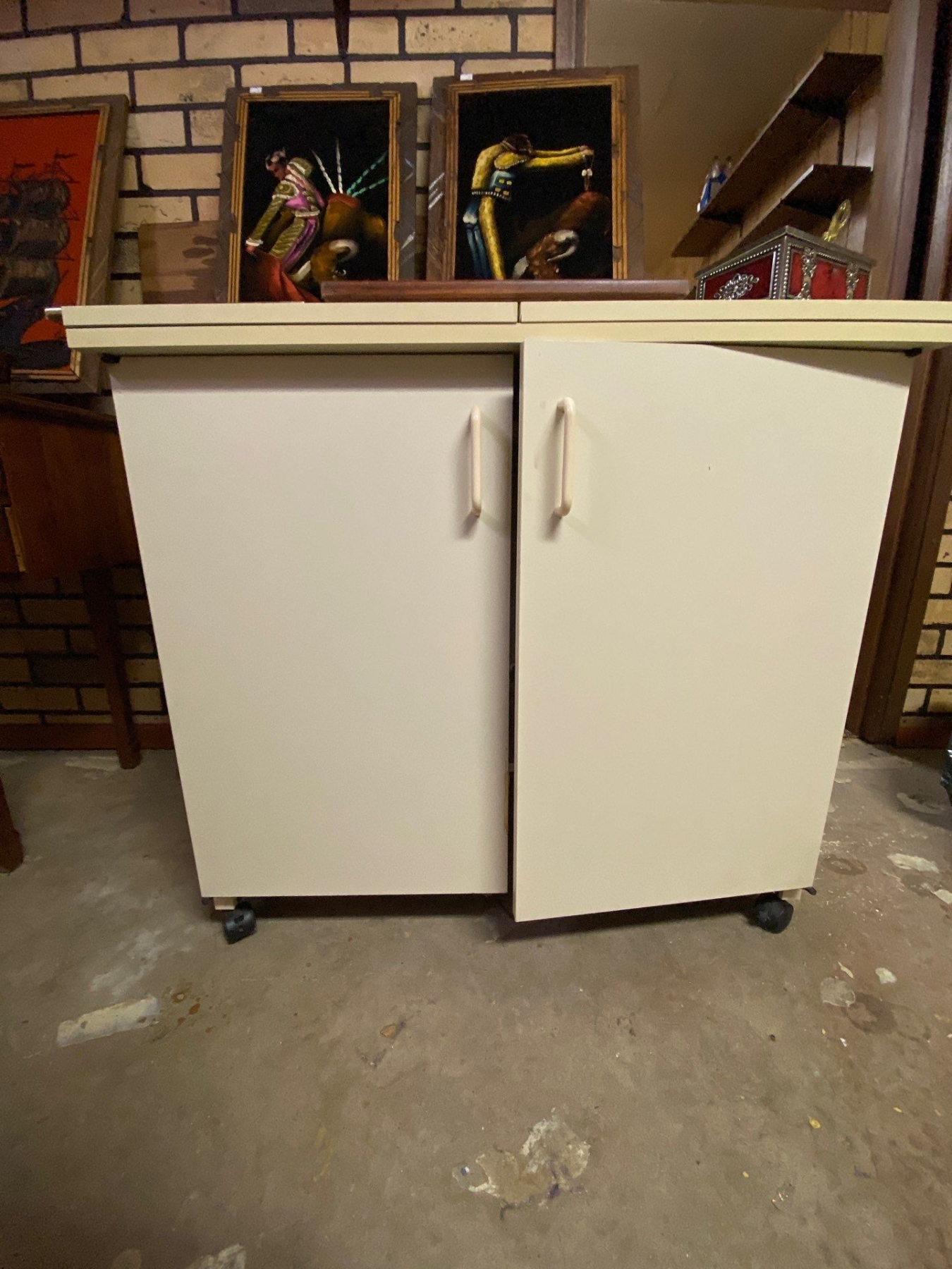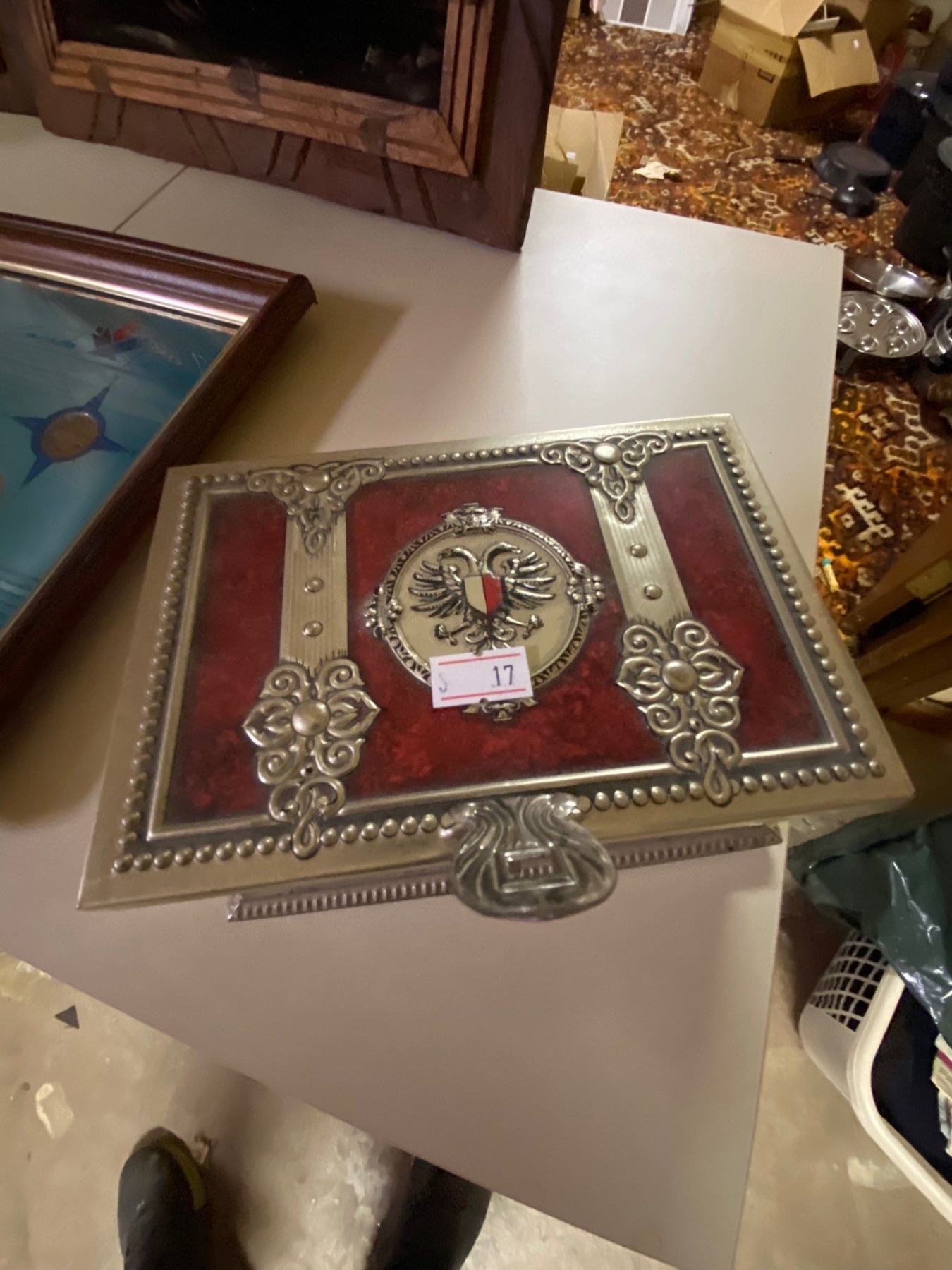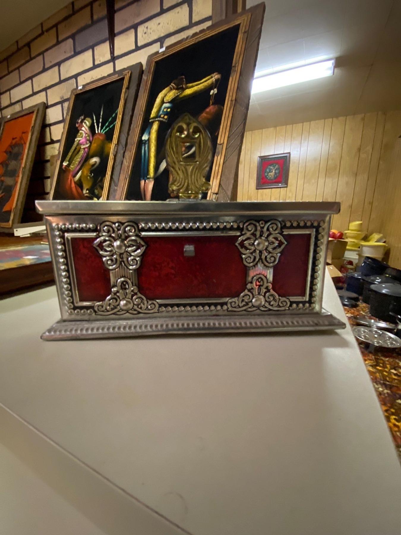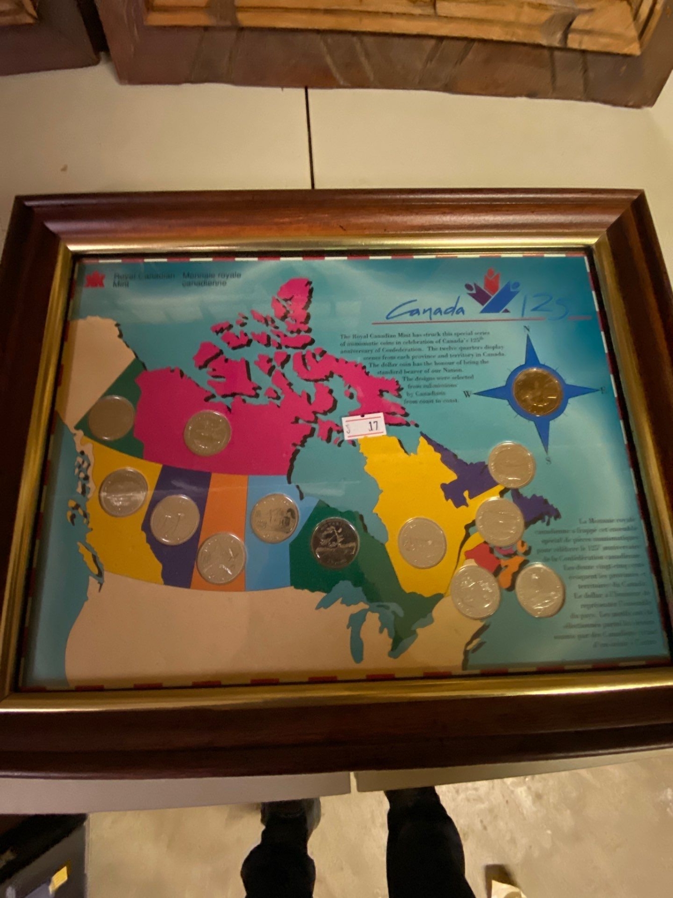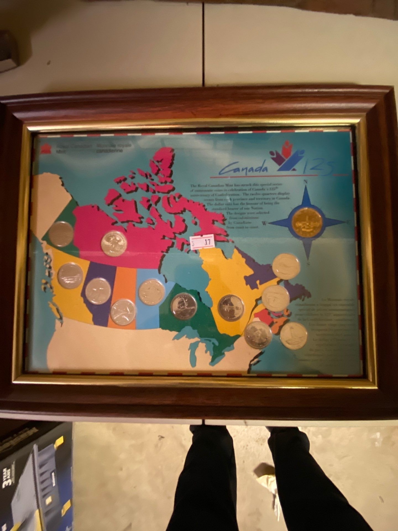 1 Royal Canadian mint set provincial set 10 inch long by 8 inch wide wolf painting, small tin box antique sewing desk with cabinet and Canadian