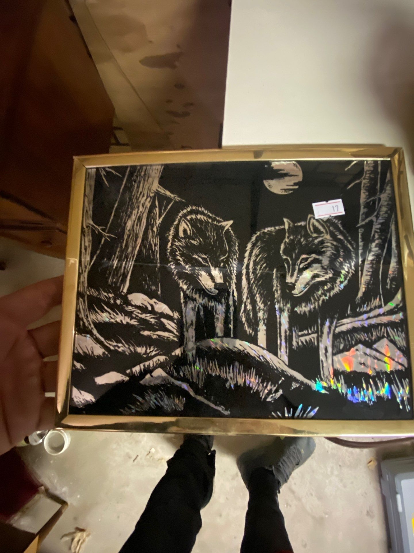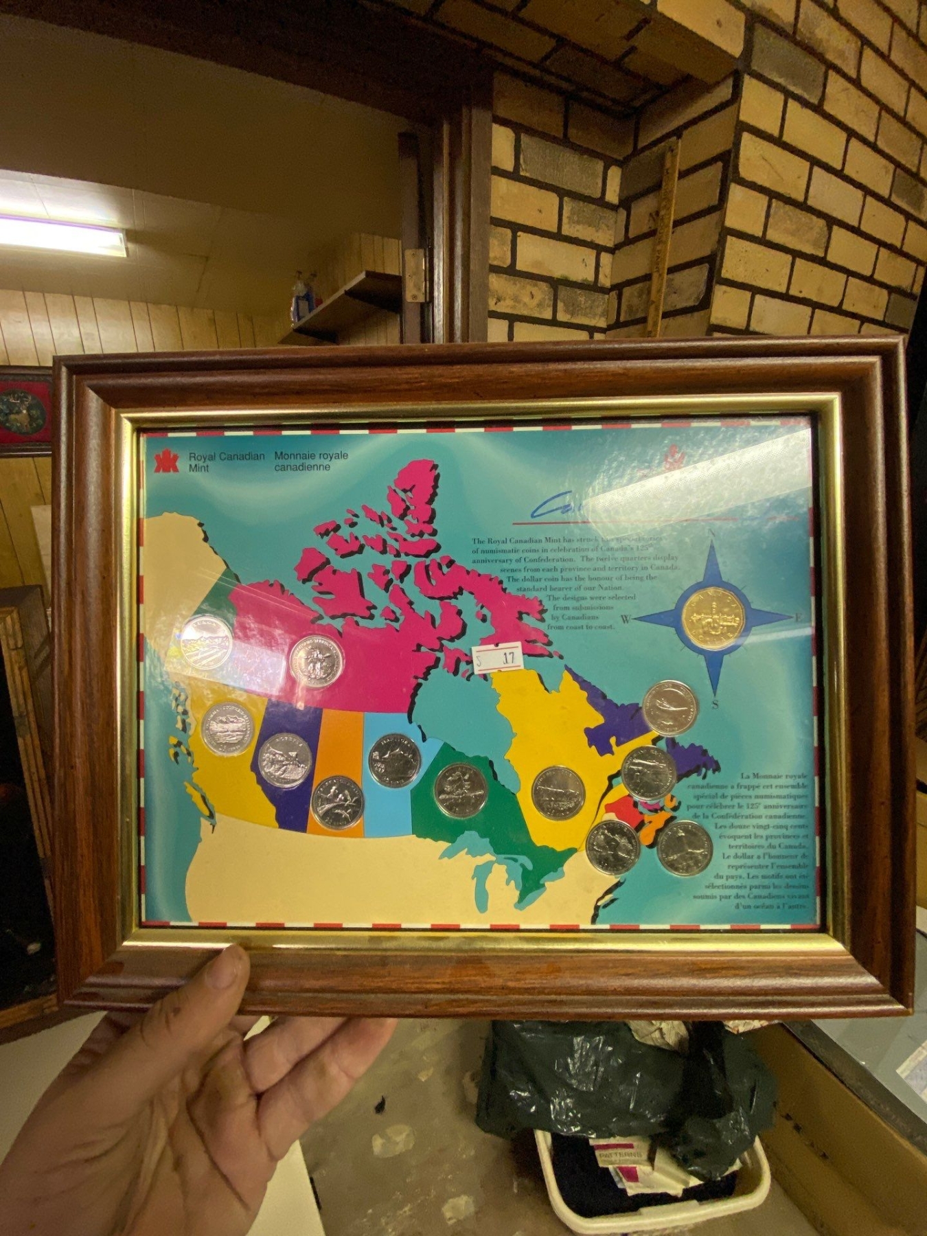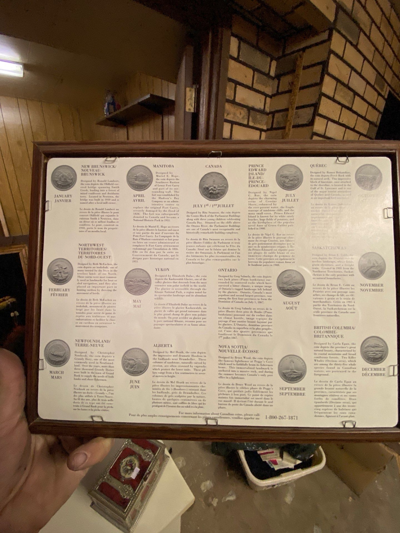 1 Royal Canadian mint set provincial set 10 inch long by 8 inch wide wolf painting, small tin box an