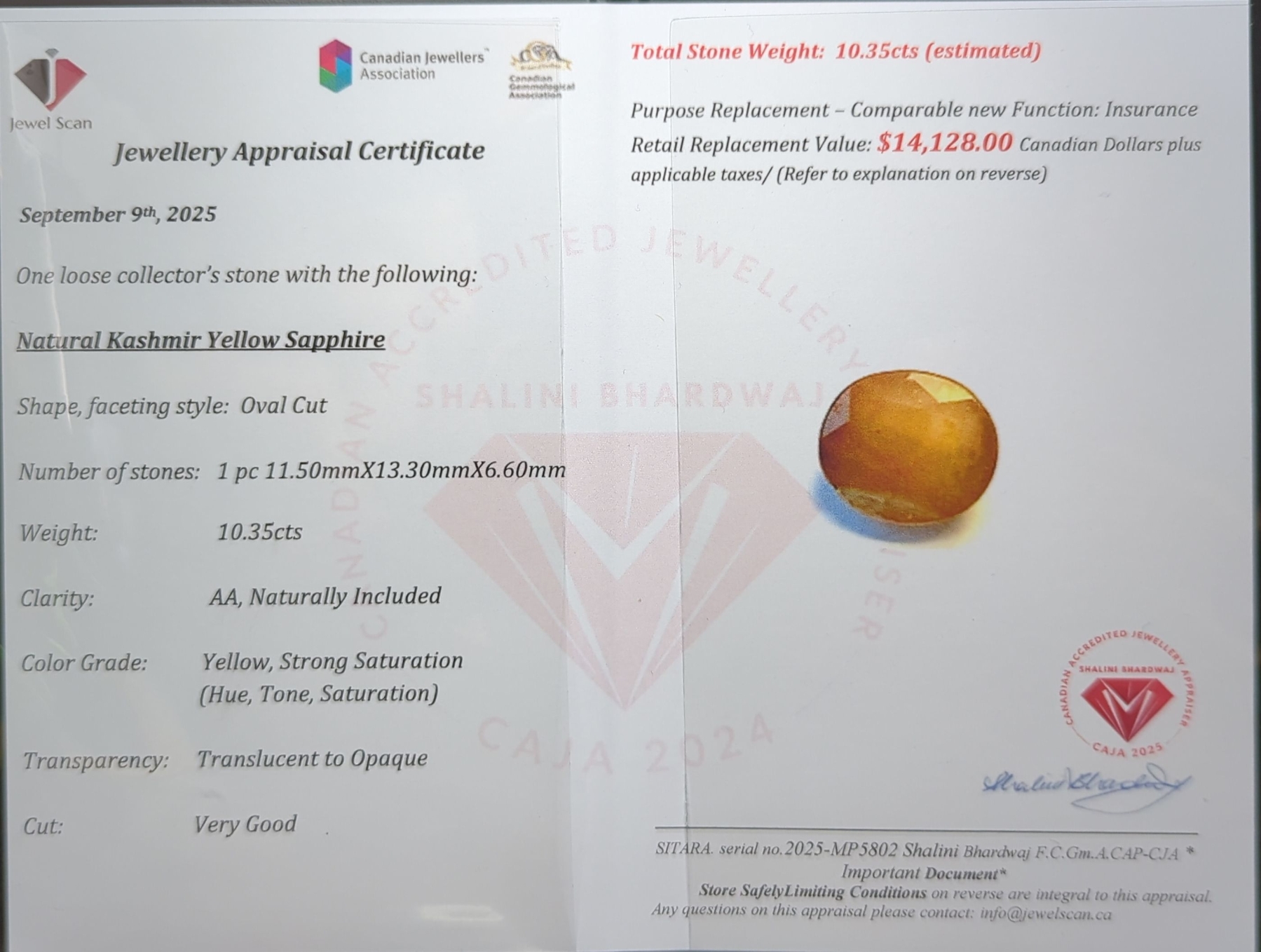 10.35 ct Certified Yellow Sapphire gemstone Kashmir ($14,128 Appraisal)