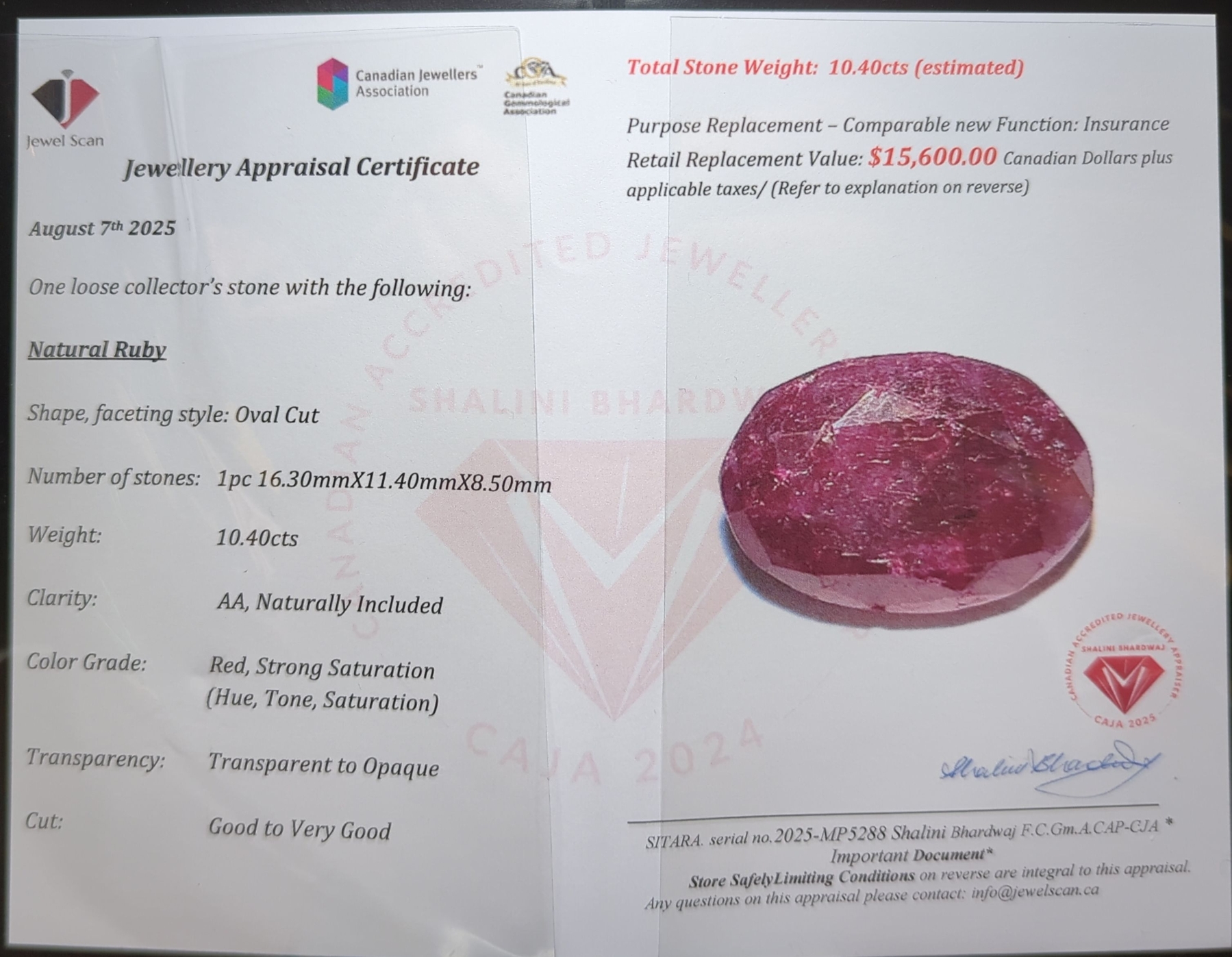 10.4 ct Certified Red Ruby gemstone ($15,600 Appraisal)
