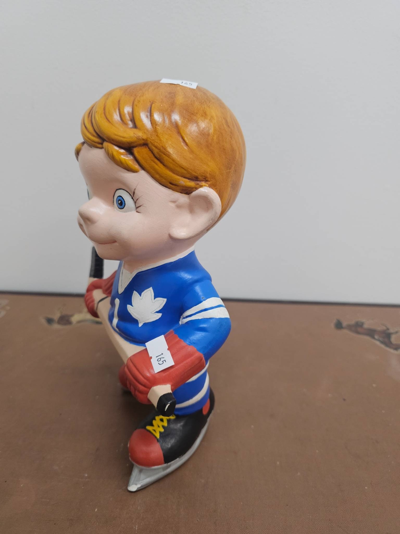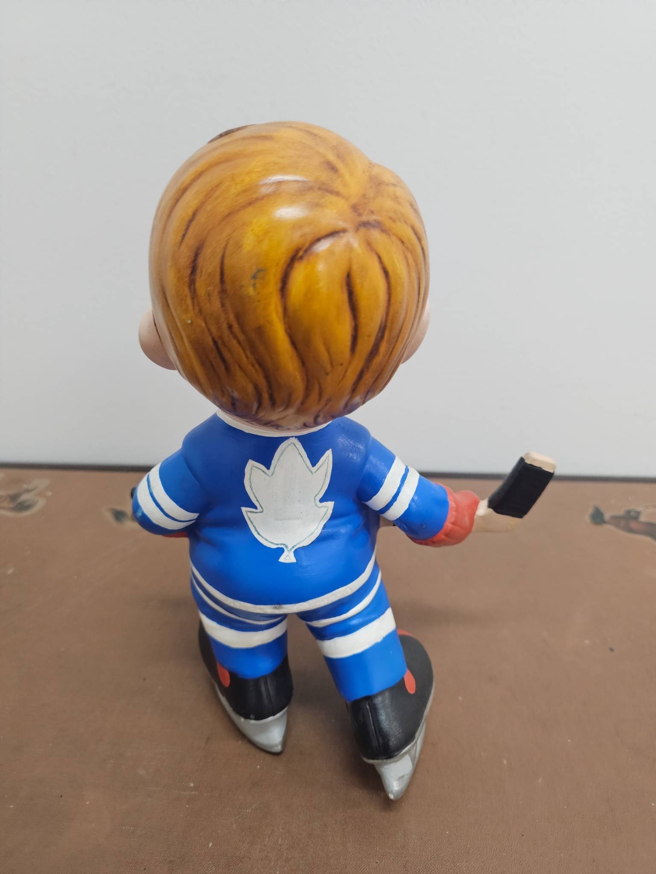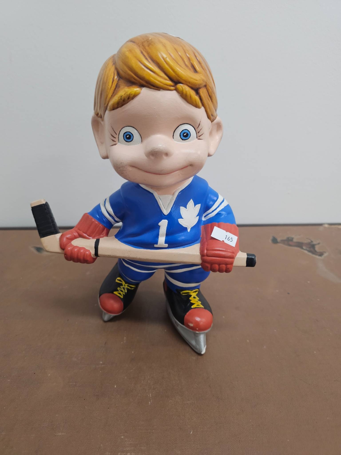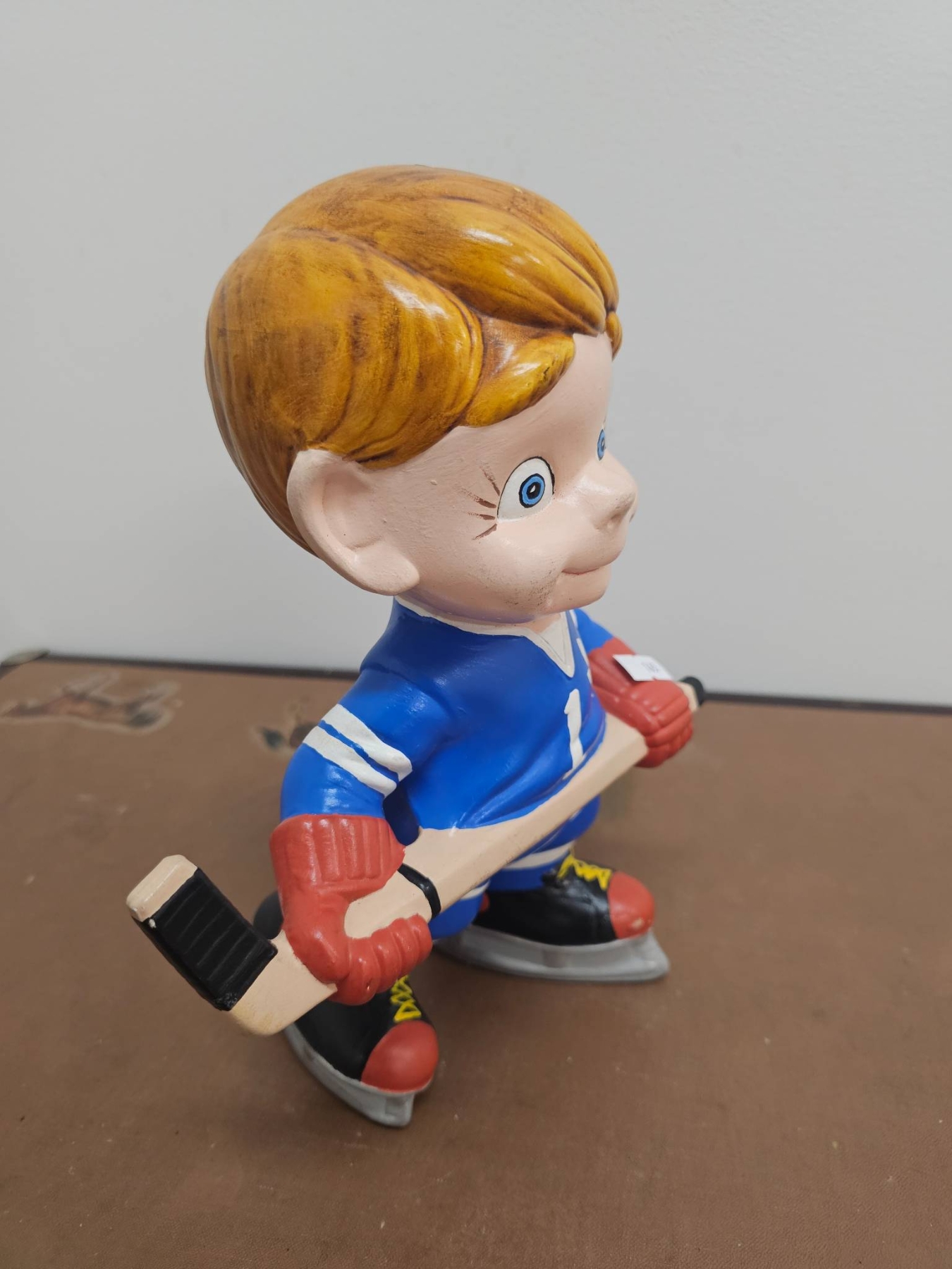 A 10-inch tall figurine of a cheerful hockey player wearing a blue and white jersey featuring a maple leaf emblem. The figure is depicted on skates, holding a hockey stick, and has charming details like bright eyes and vibrant colors. A delightful decorative piece for hockey enthusiasts or collectors.