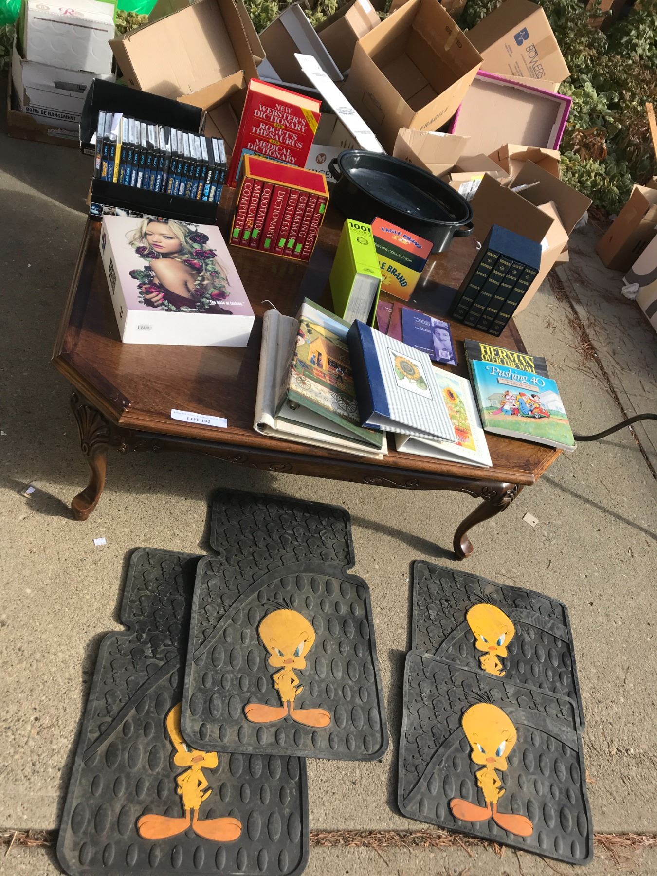 "100 Contemporary Fashion Designs" (book), Webster Pocket Reference Library, asst photo albums, roaster, recipe box, Tweety floor mats