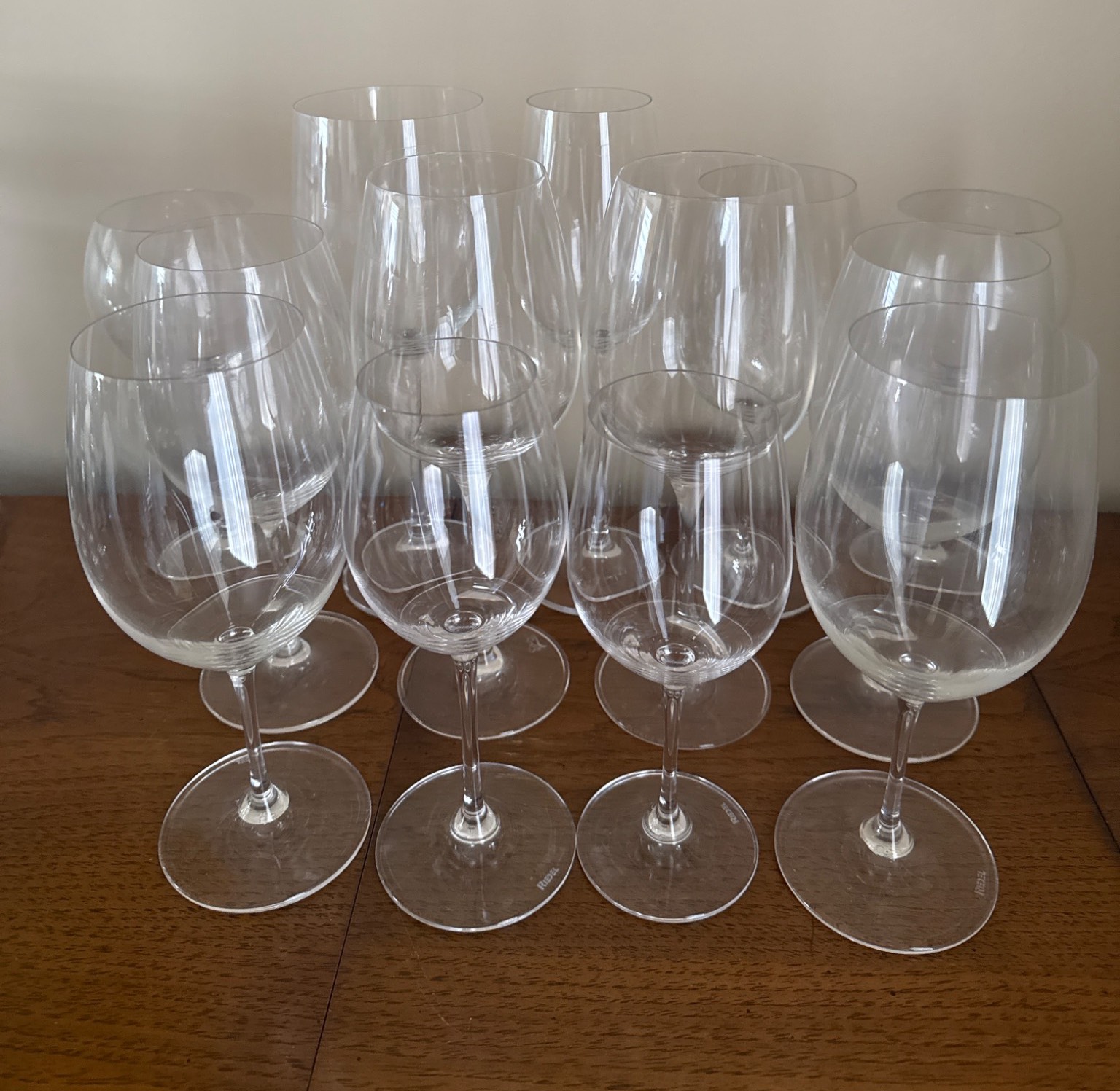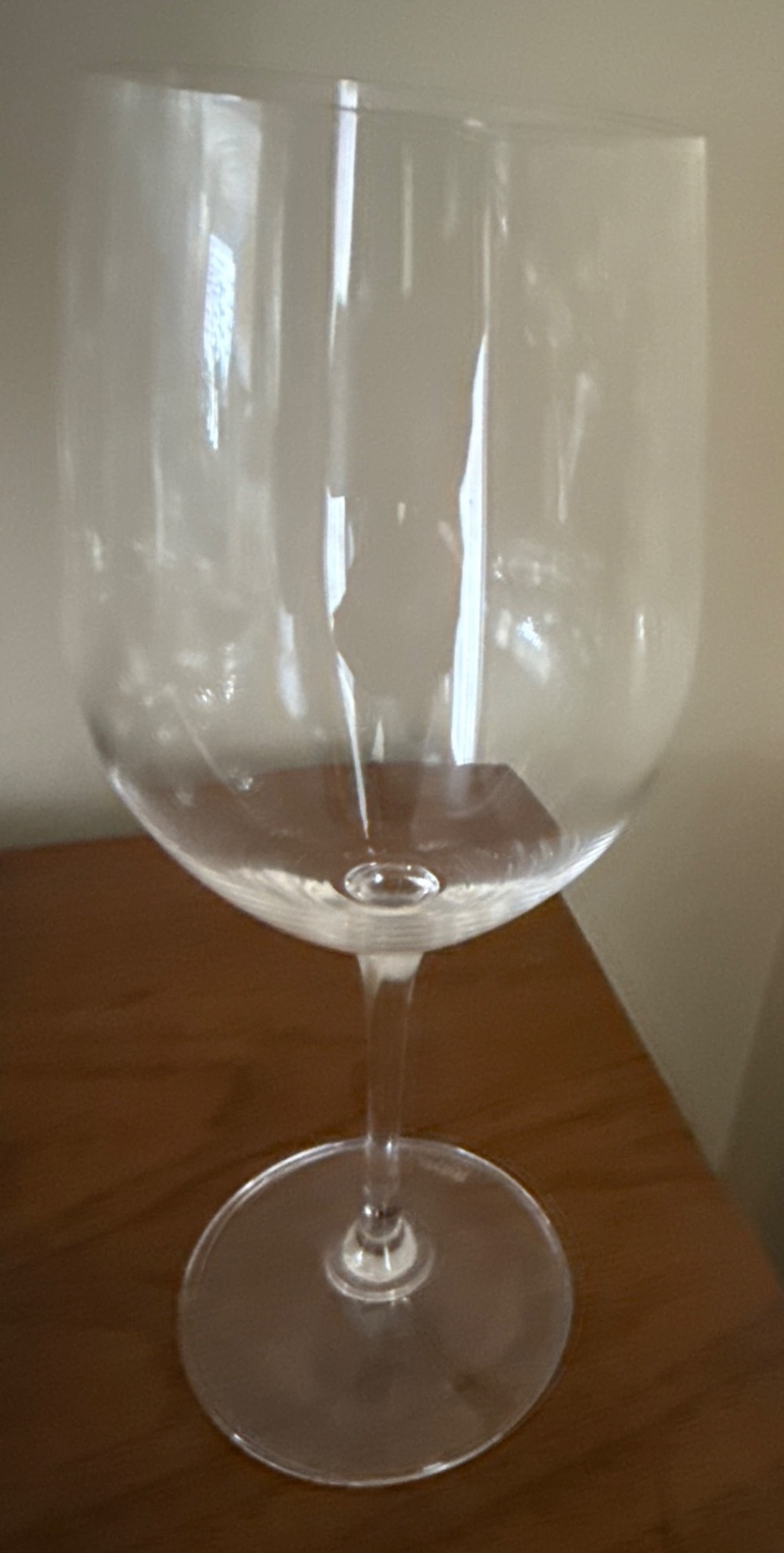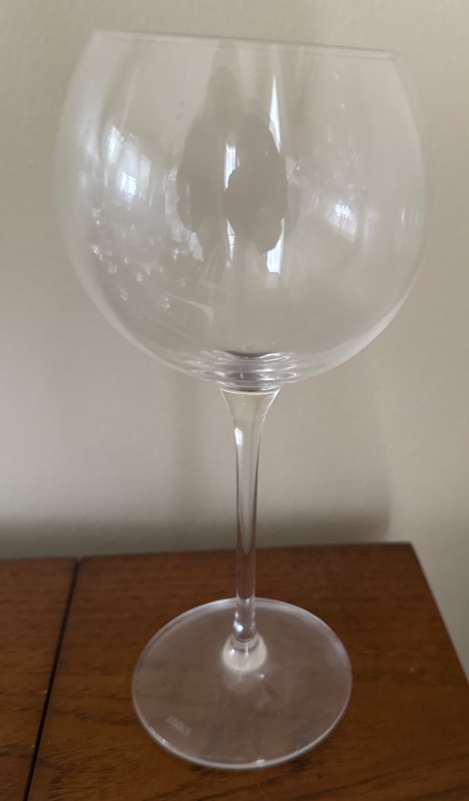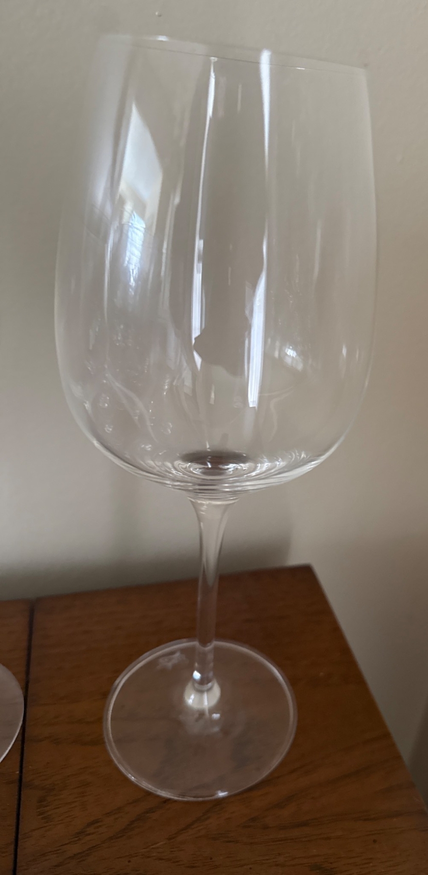 12 matching clear wine glasses, crafted for both red and white wine. Features a sleek, timeless design with a thin stem and sturdy base. Each glass is approximately 9 inches tall with a bowl diameter of 4 inches. Perfect addition for entertaining or daily use. Lightweight and elegantly shaped for a comfortable grip. Easy to integrate into any tableware collection.