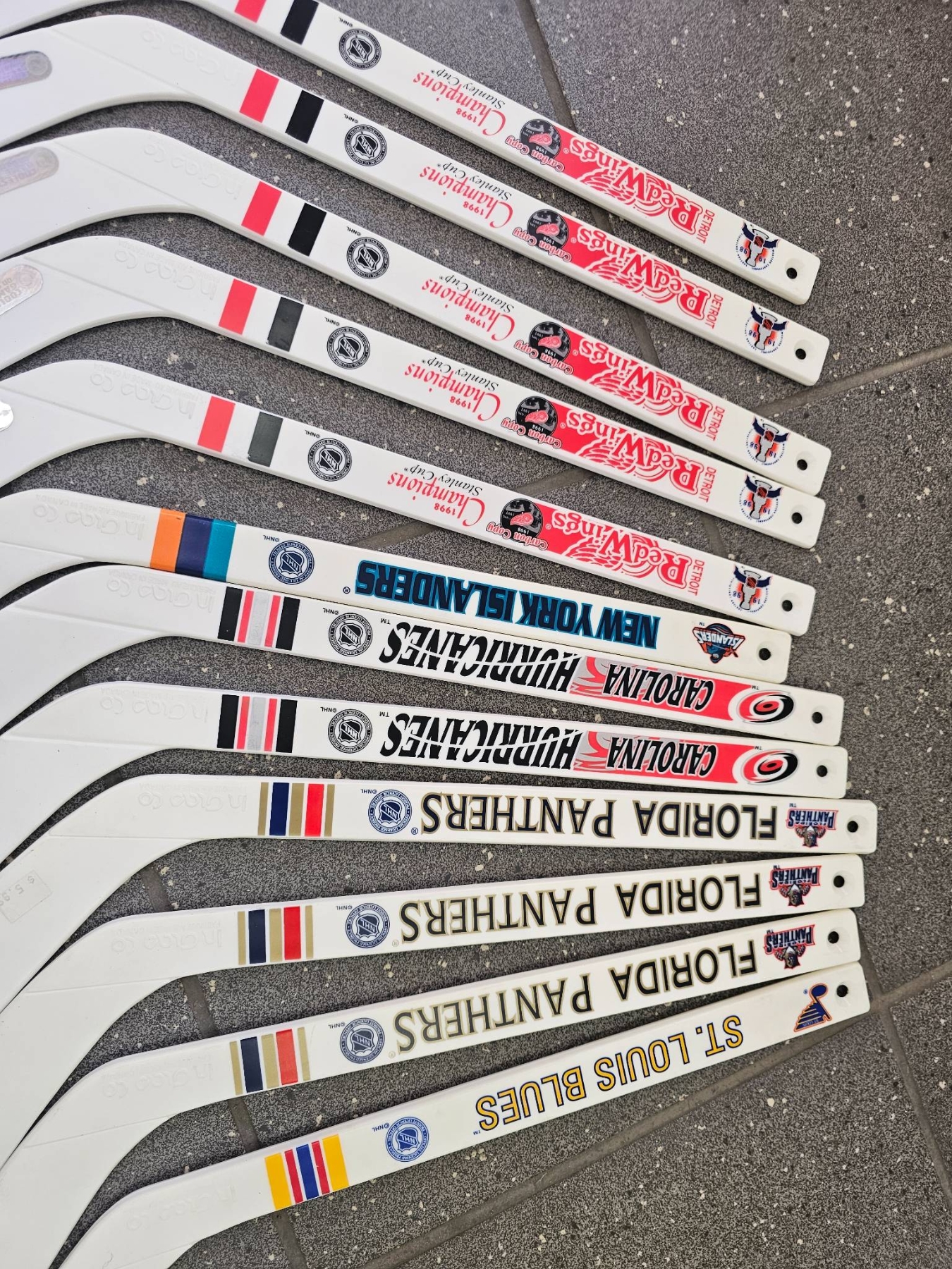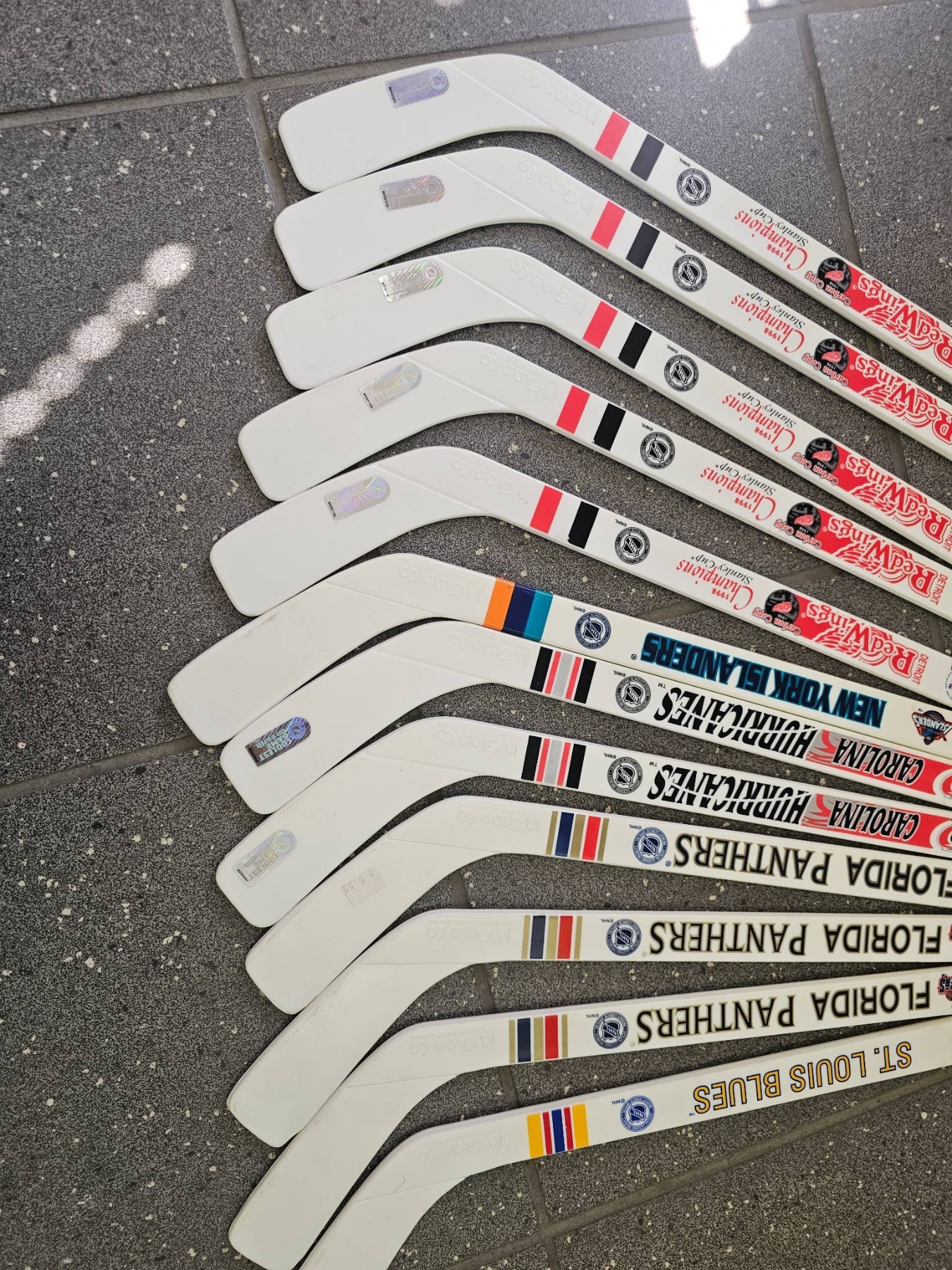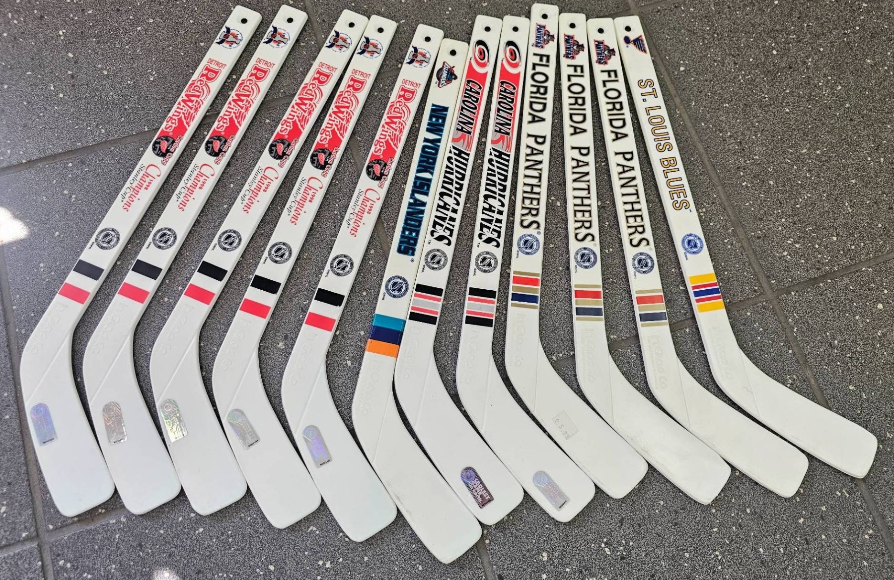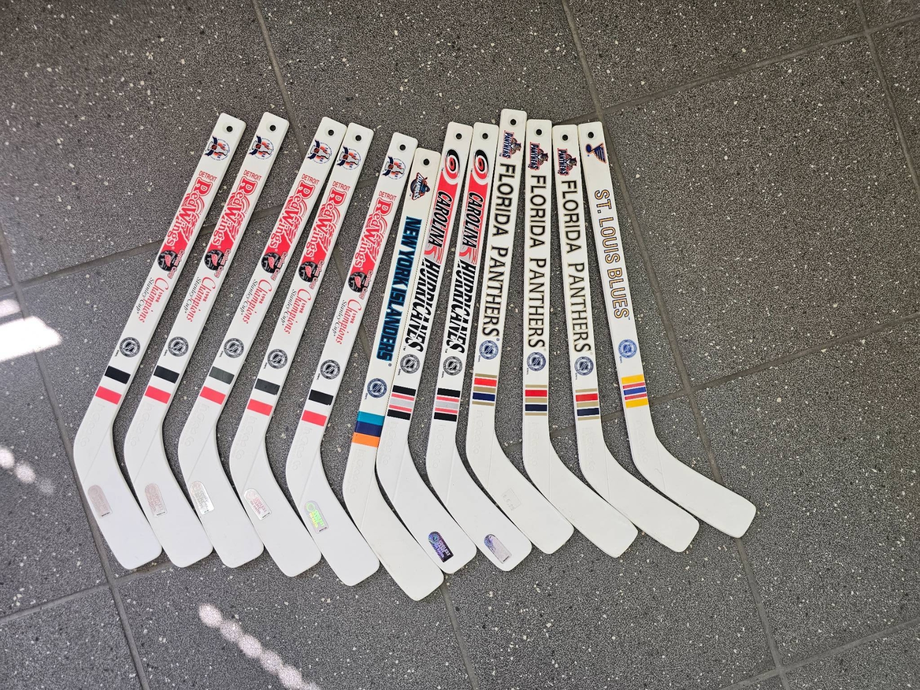 12 NHL-branded mini hockey sticks featuring team names and logos, including Florida Panthers, Carolina Hurricanes, New York Islanders, and St. Louis Blues, among others. Sticks are made of lightweight materials with printed graphics and colored bands representing team colors. Items are in used but good condition with minor surface wear. Perfect for collectors or display.