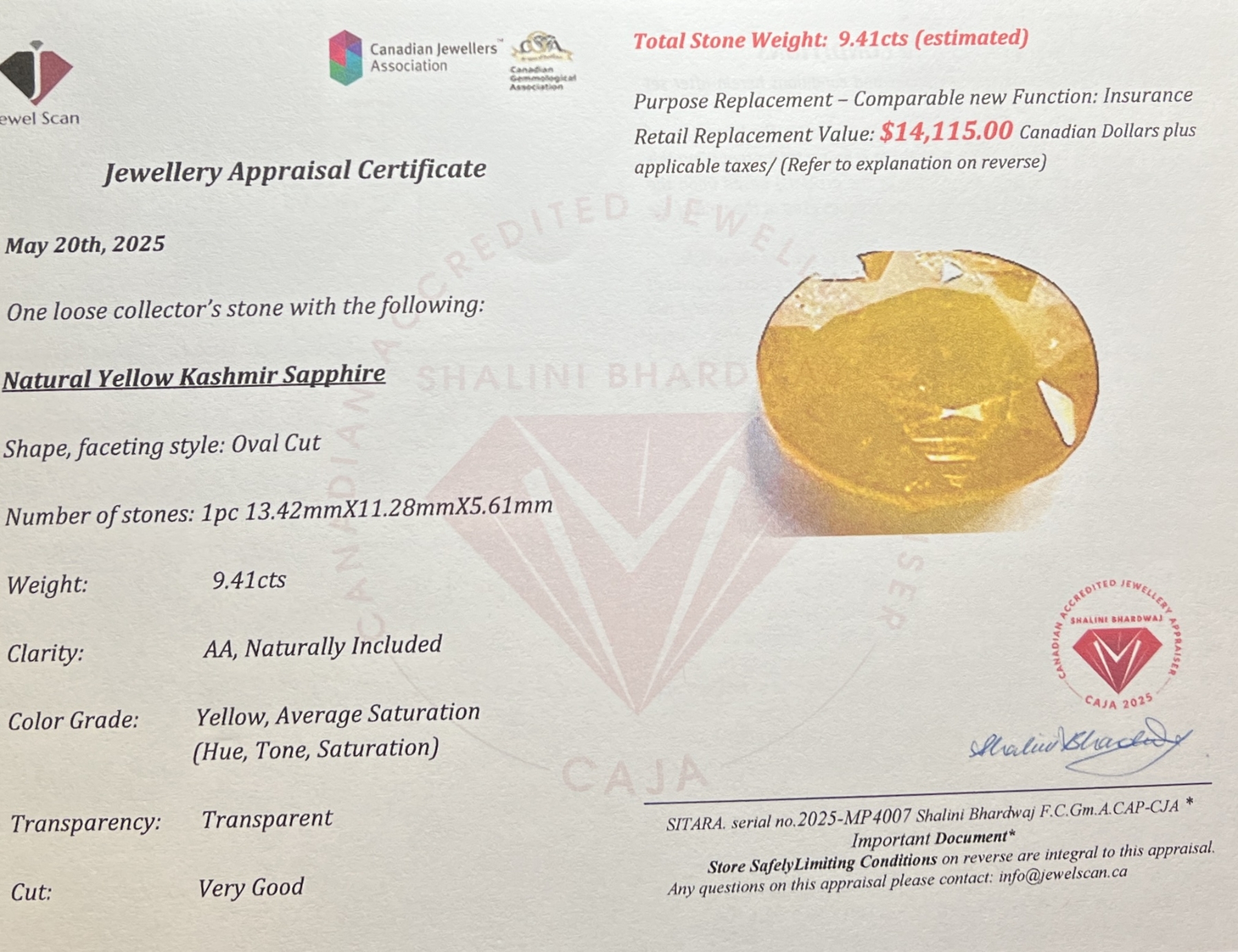 $14,115 Appraisal - 9.41 ct Cert. Yellow Sapphire Gemstone