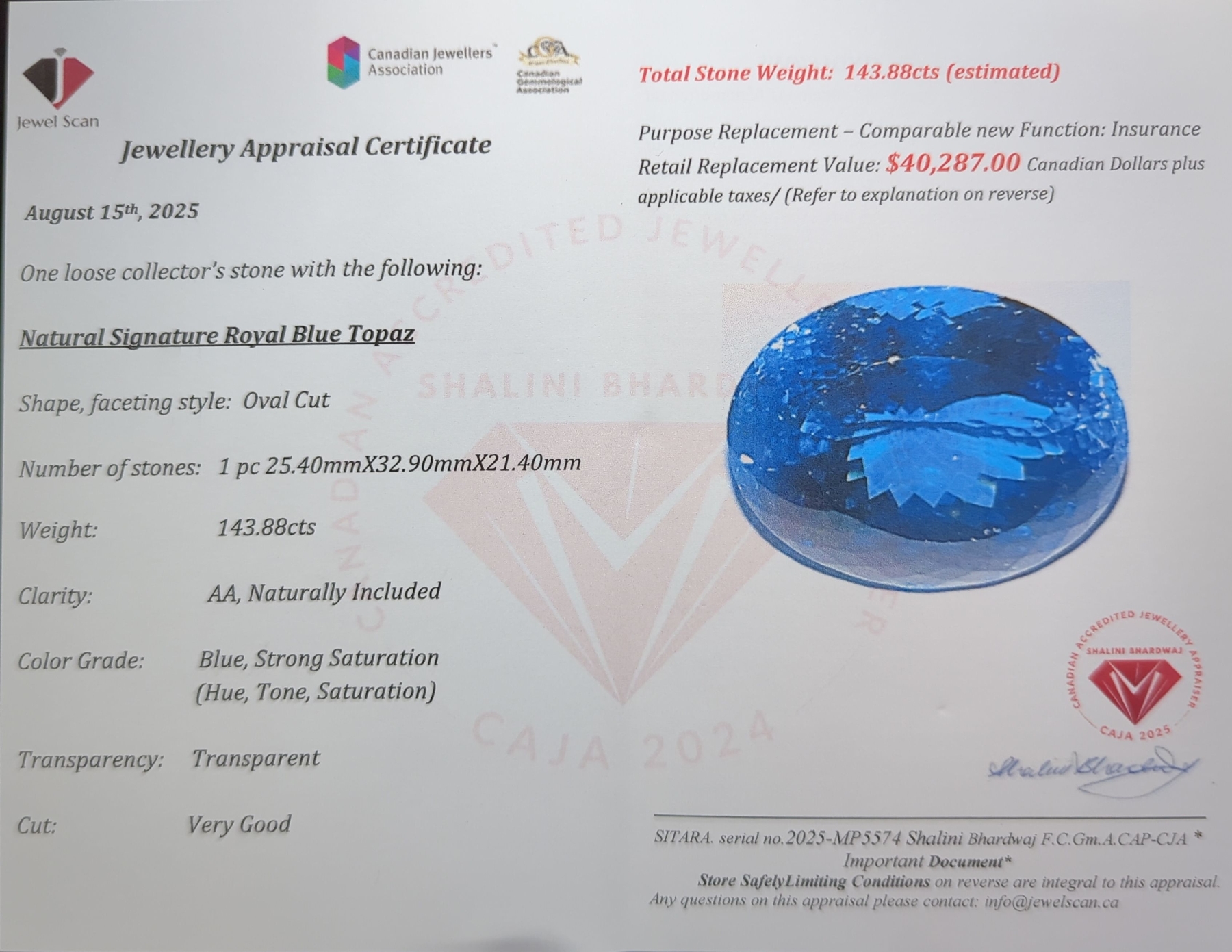 143.88 ct Certified Royal Blue Topaz Gemstone ($40,287 Appraisal)