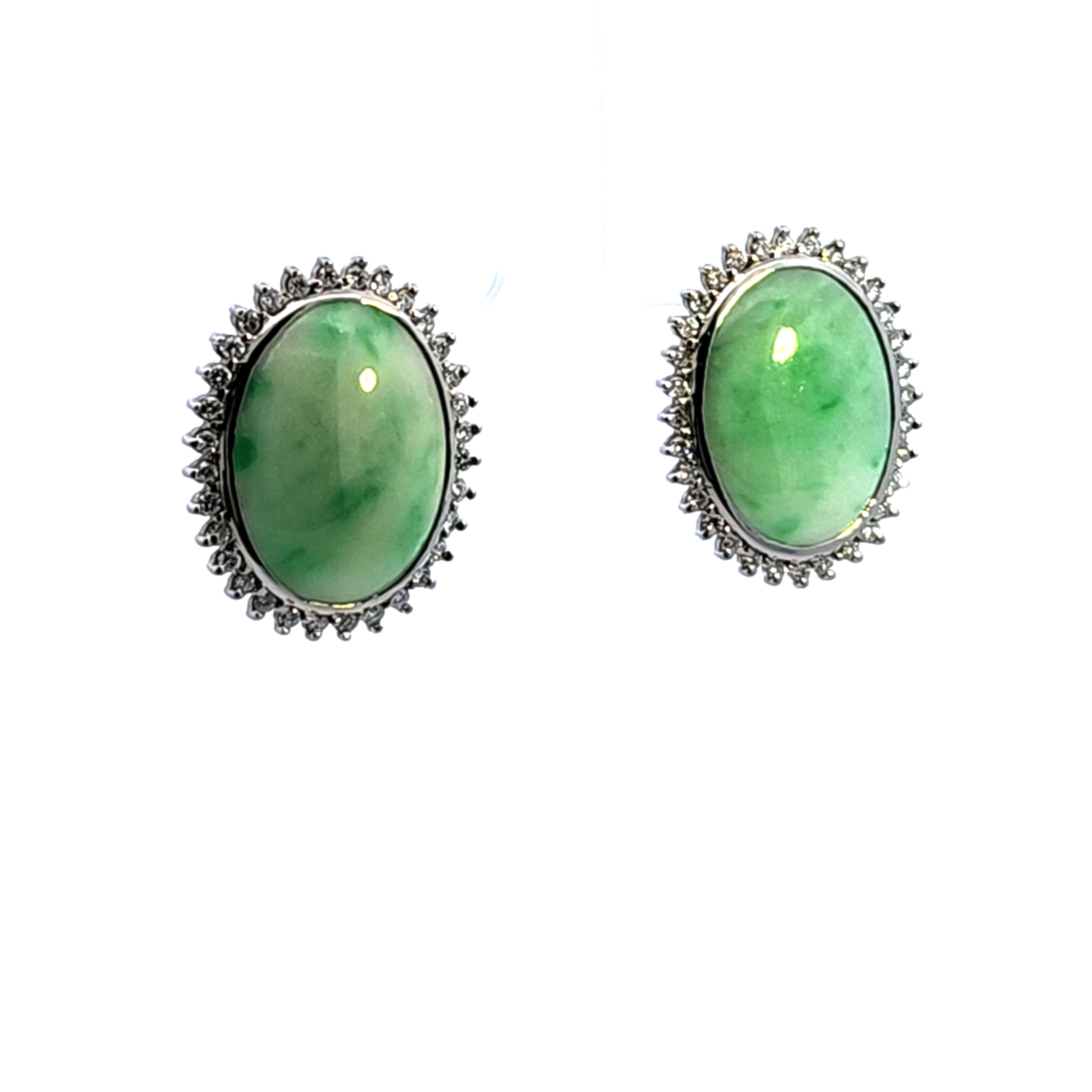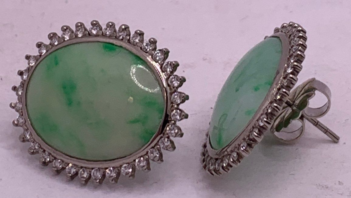 14k White Gold Studs w/ Jadeite Centre Stone and Surrounding Diamonds - Weighs 12.7g