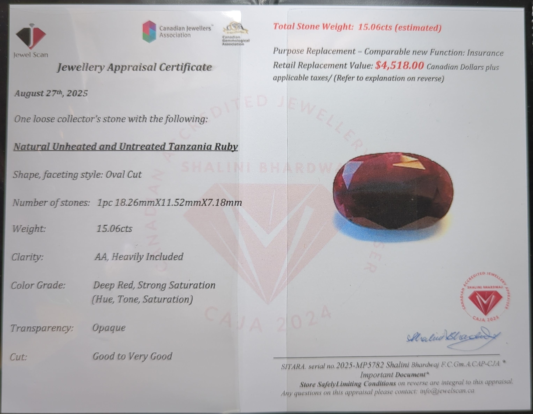 15.06 ct Certified Red Ruby gemstone ($4,518 Appraisal)