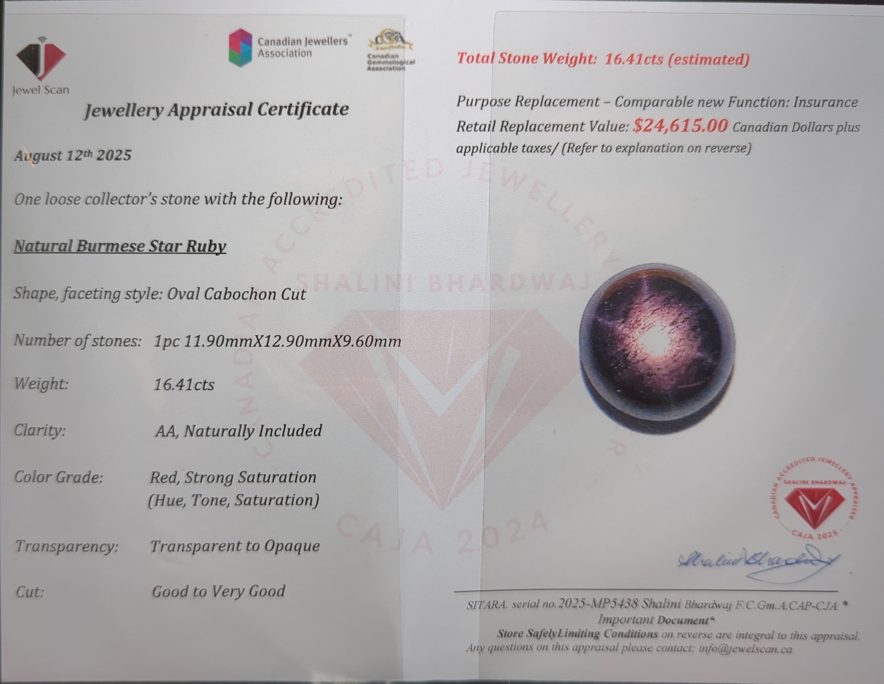 16.41 ct Certified Red Star Ruby gemstone ($24,615 Appraisal)