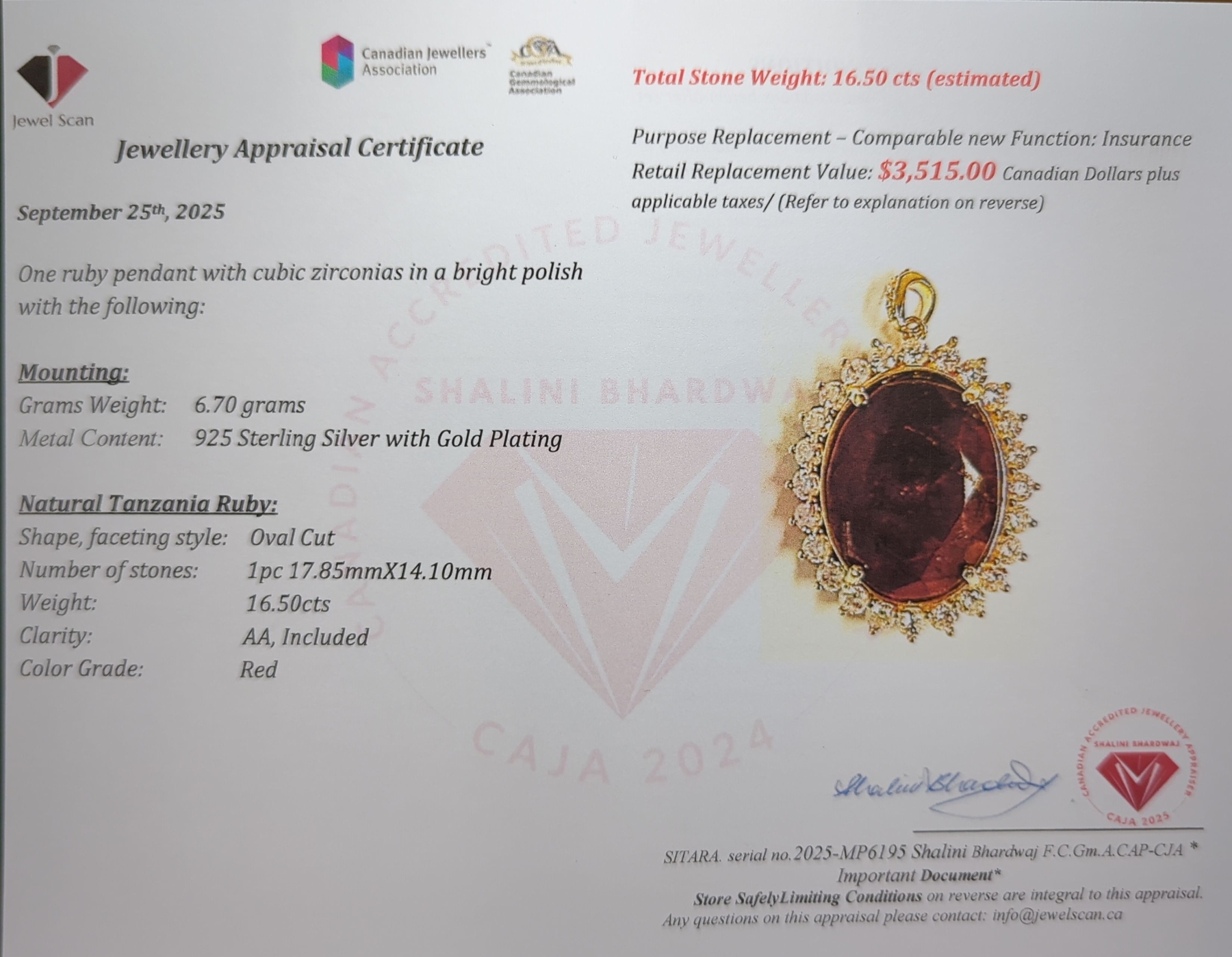 16.5 ct Certified Sterling Silver w/ Gold Plating Ruby gemstone Pendant ($3,515 Appraisal)