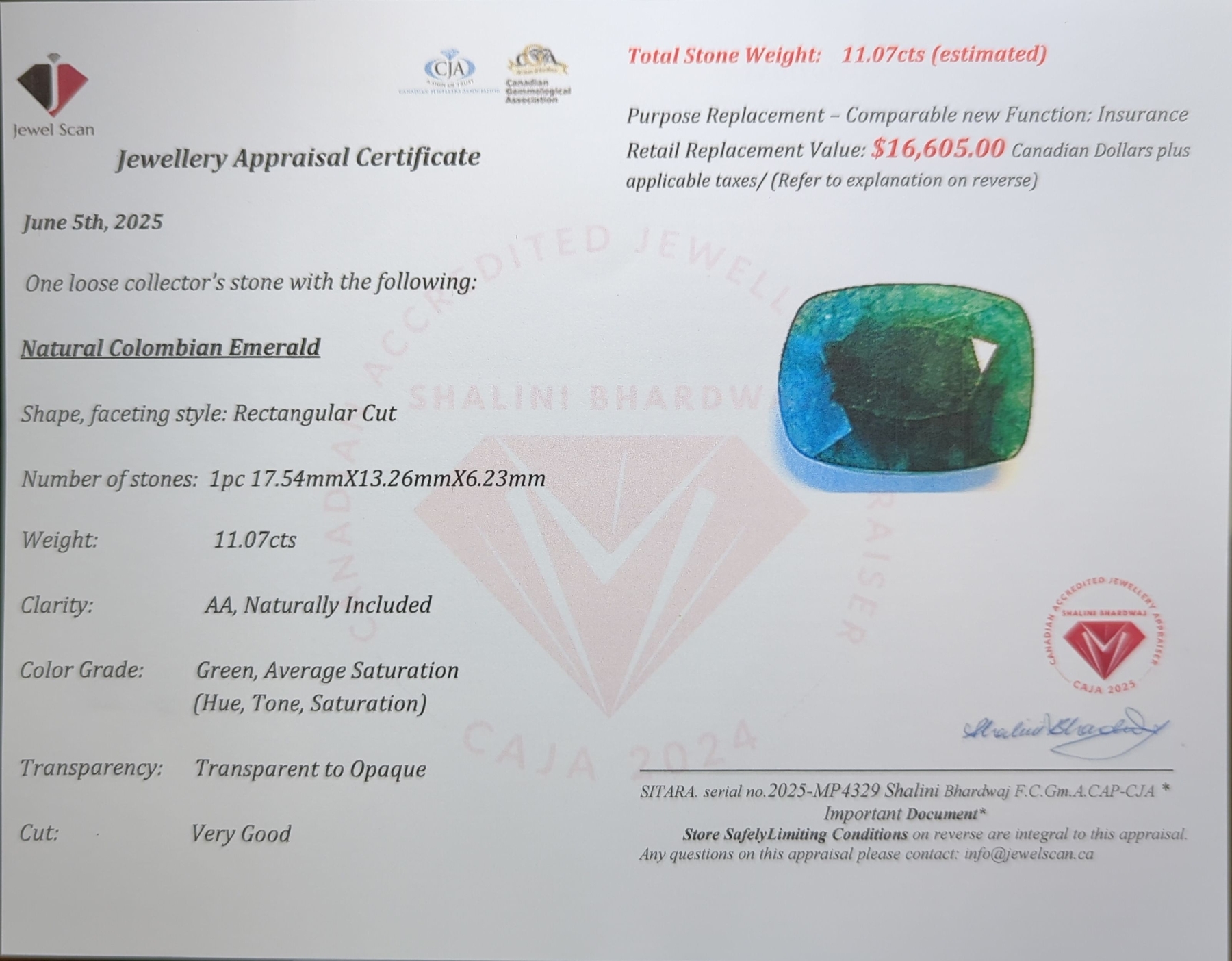 $16,605 Appraisal - 11.07 ct Cert. Emerald Gemstone