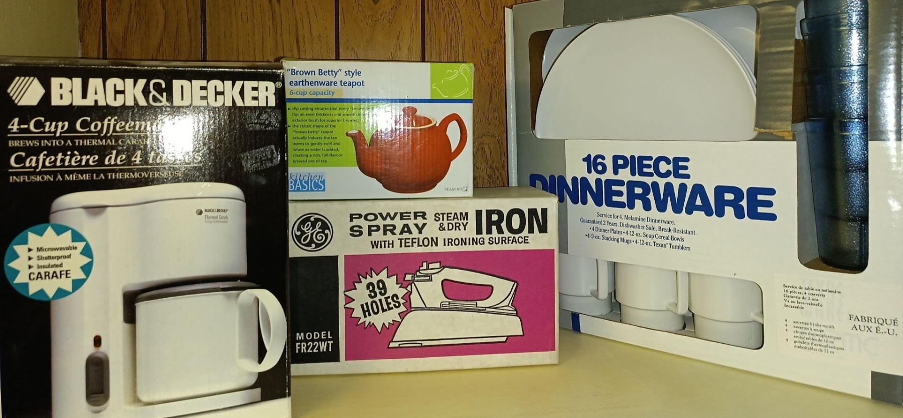 16 Piece Dinnerware Set, 4 Cup Coffee Maker, Tea Pot & Power Spray Iron W/ Teflon