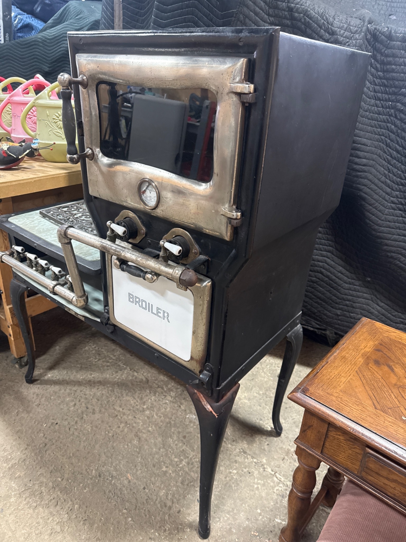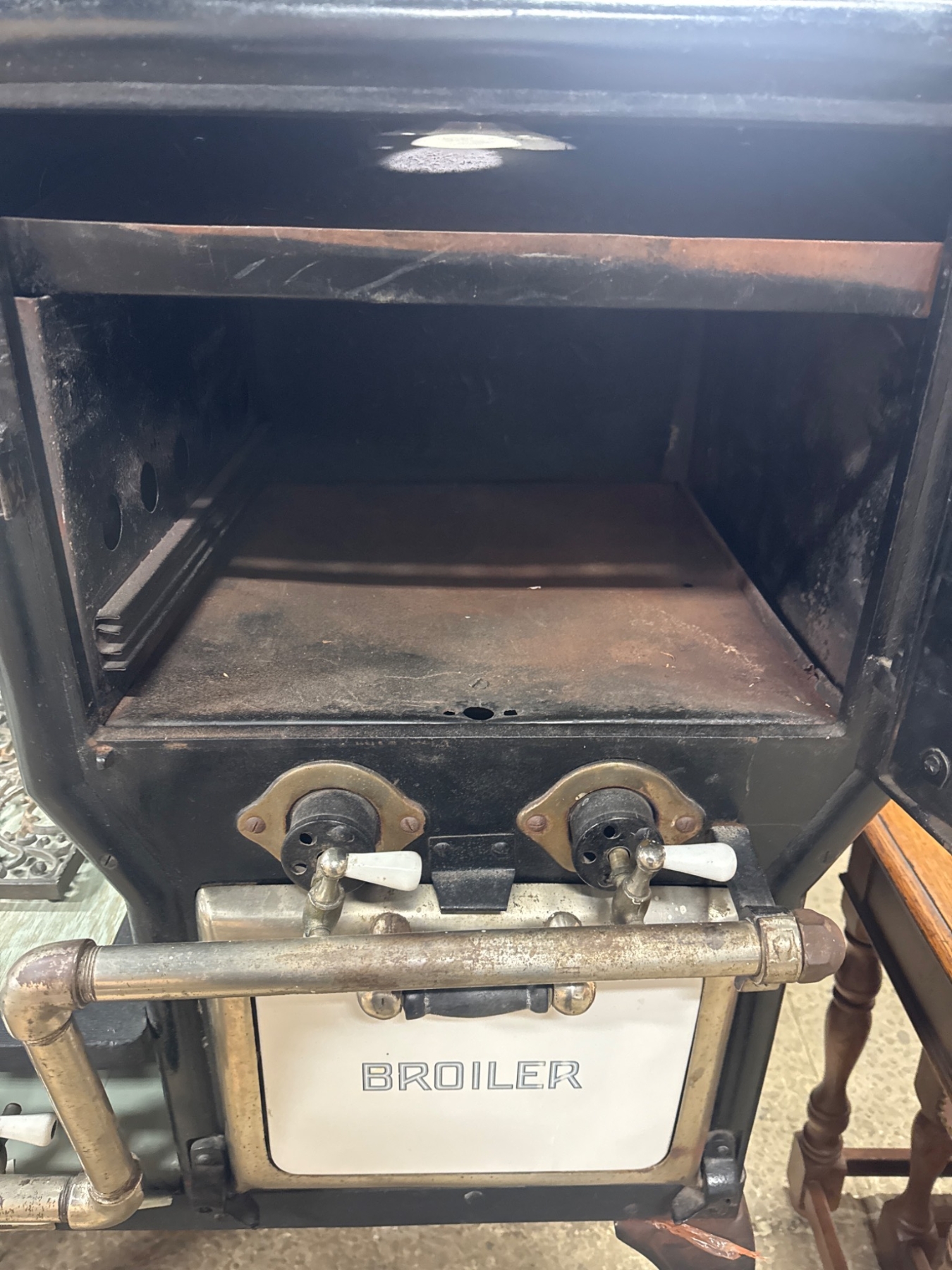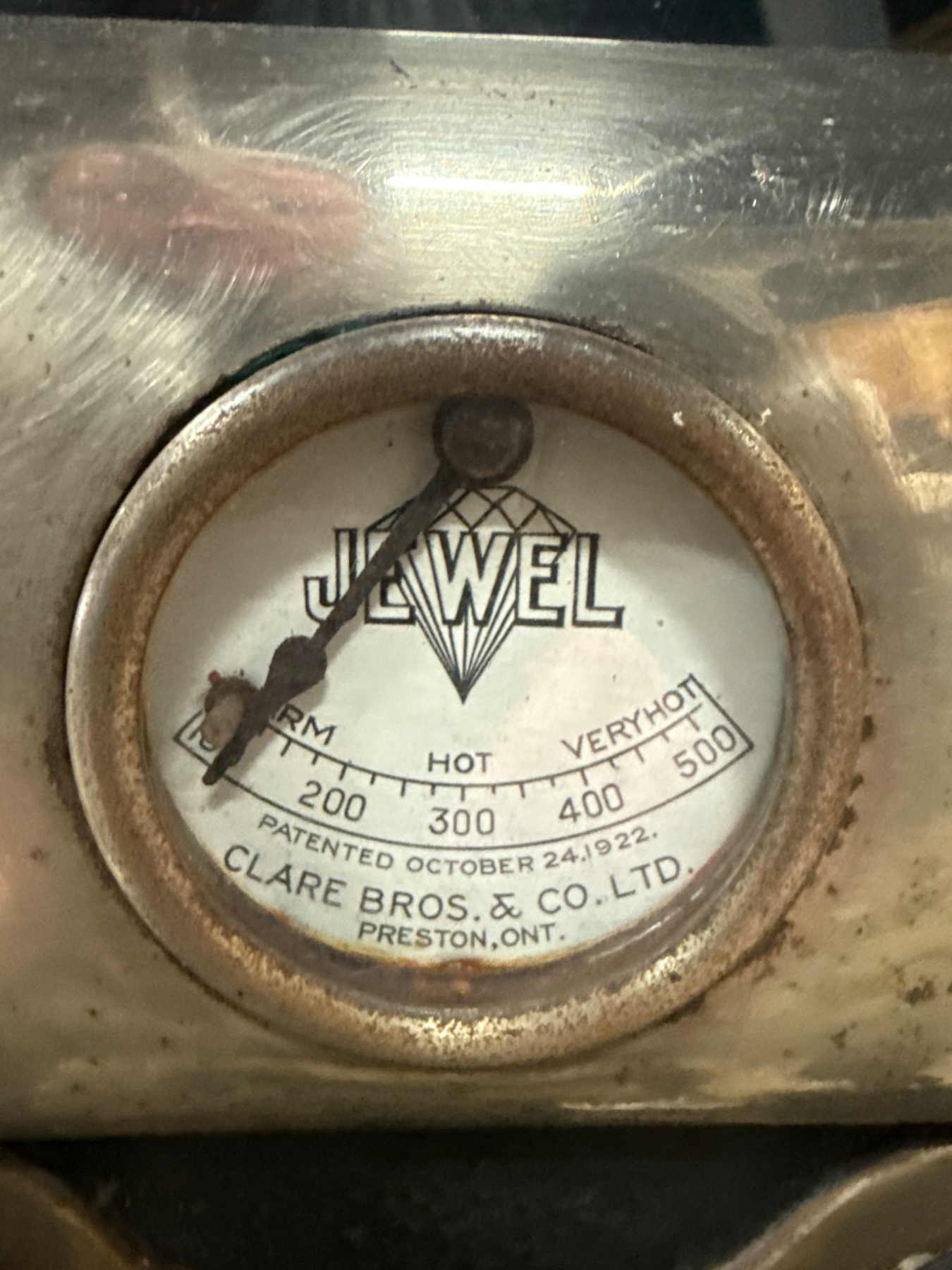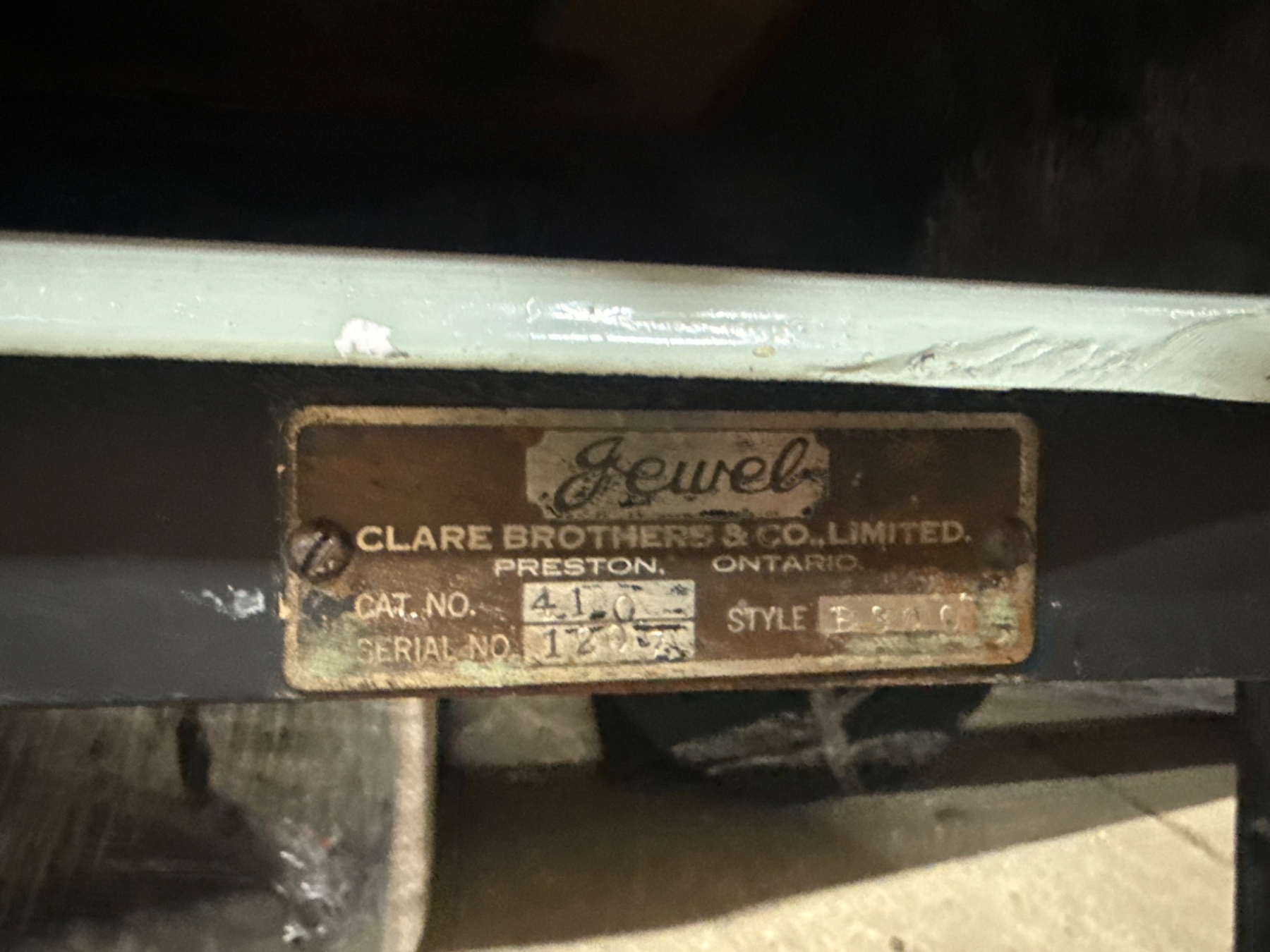 Vintage oven and broiler manufactured by Clare Brothers and Co., marked with a patent date of October 24, 1922. Features include cast iron legs, enamel surface, and front panel details with the 'Jewel' branding. It includes an integrated thermometer dial (200-500 degrees) and a broiler compartment. Dimensions 40x25x54†tall. The size is compact and suitable for display or restoration. Some visible wear and surface rust consistent with age.