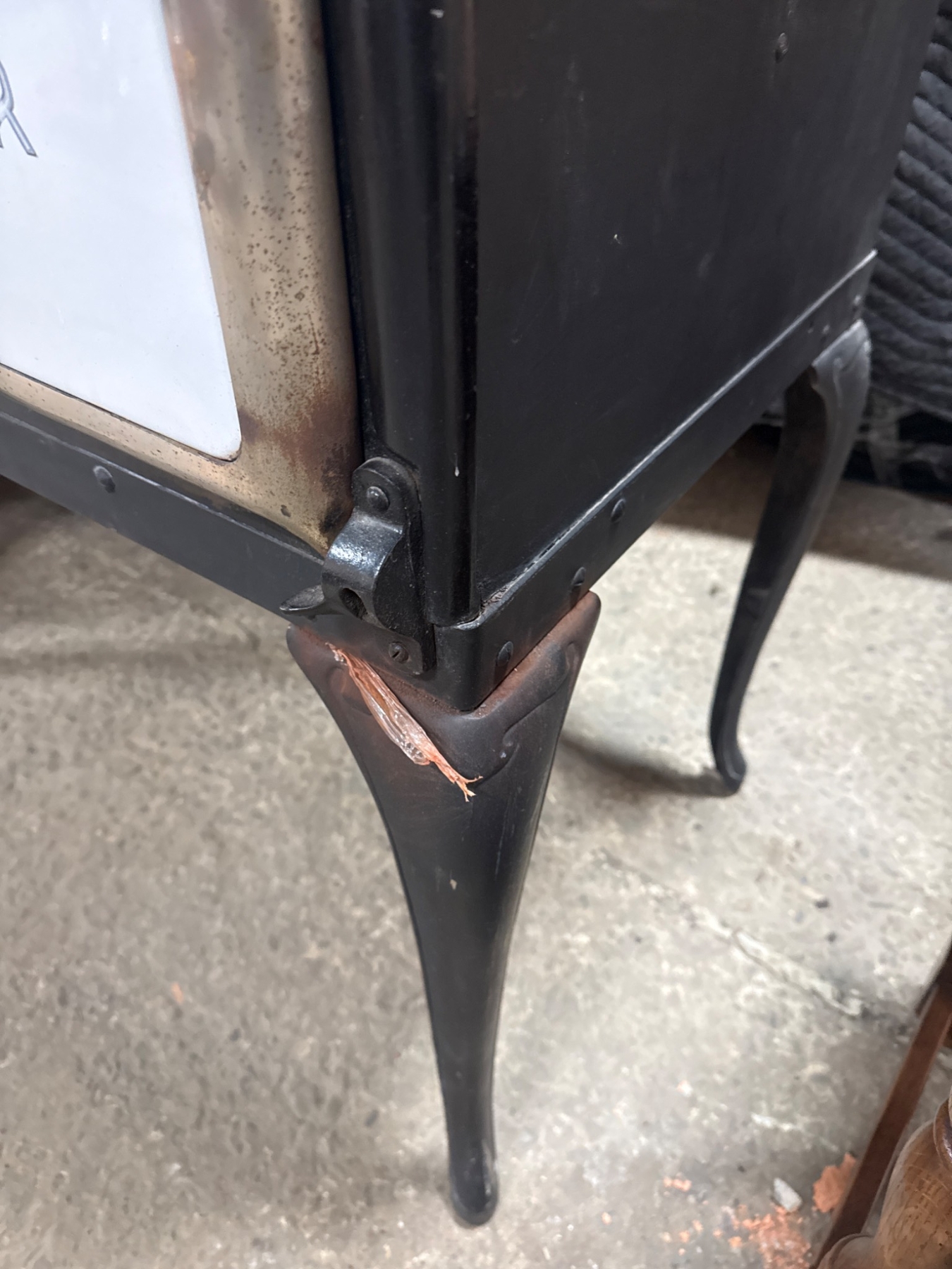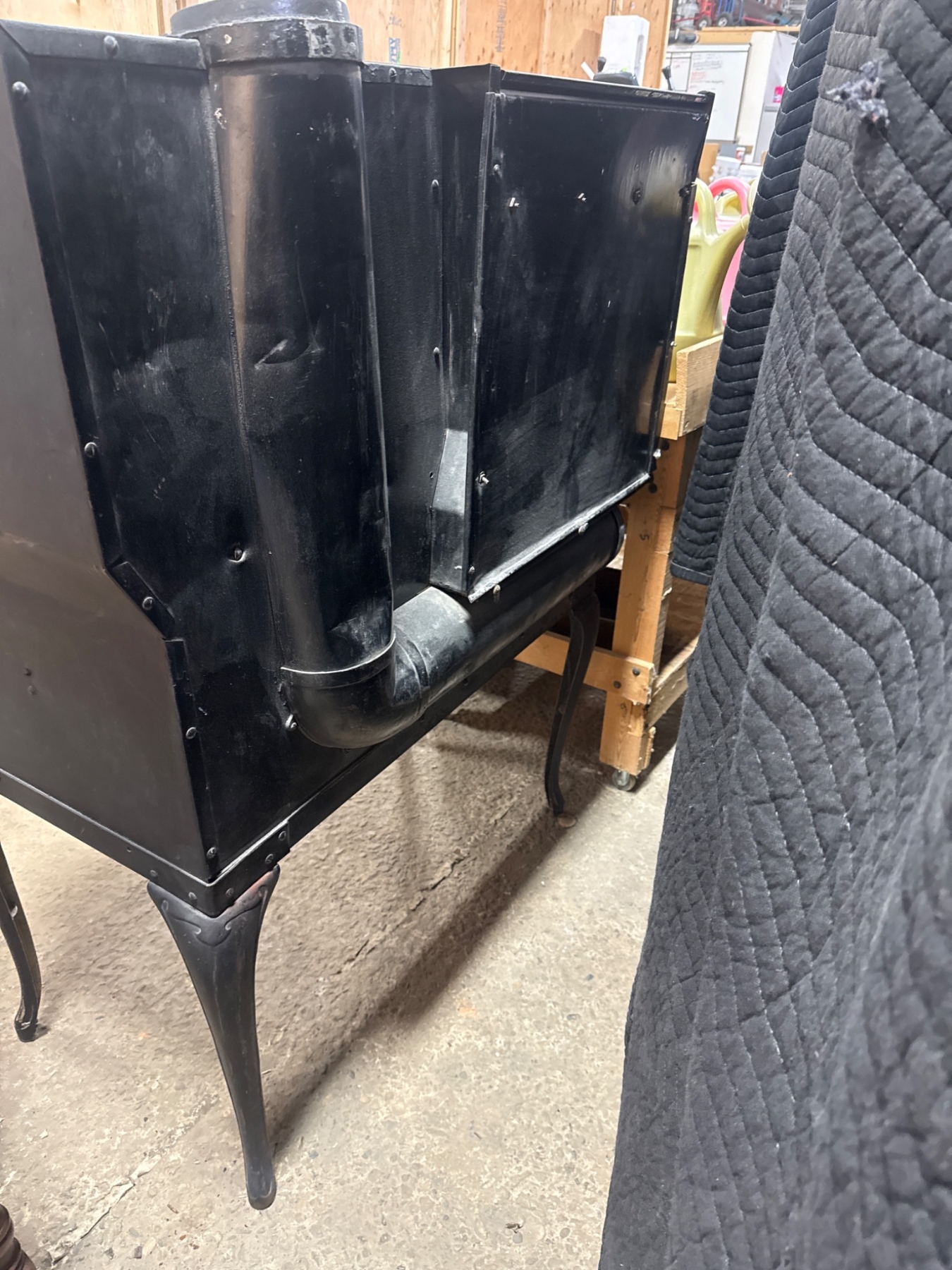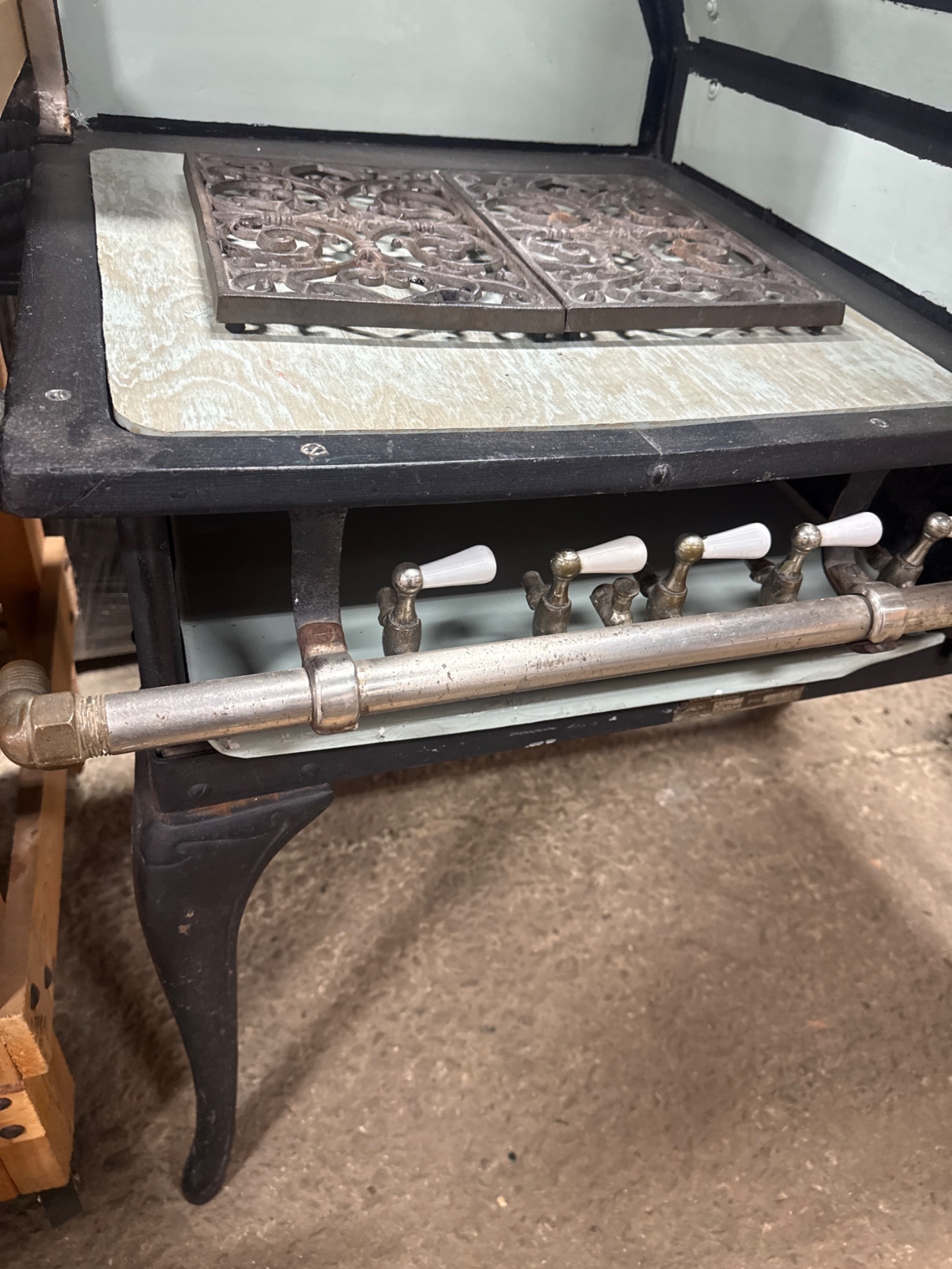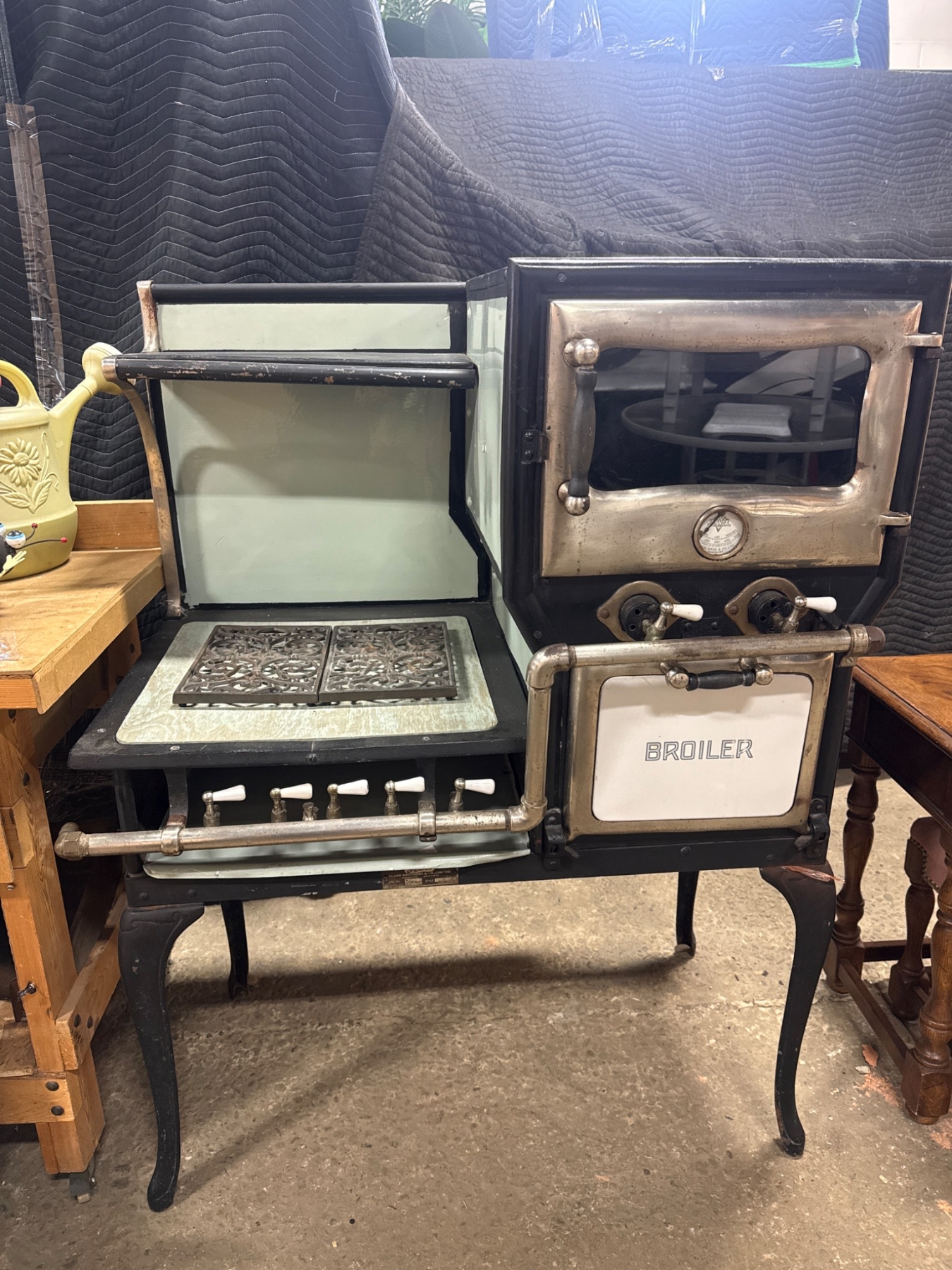 Vintage oven and broiler manufactured by Clare Brothers and Co., marked with a patent date of October 24, 1922. Features include cast iron legs, enamel surface, and front panel details with the 'Jewel' branding. It includes an integrated thermometer dial (200-500 degrees) and a broiler compartment. Dimensions 40x25x54†tall. The size is compact and suitable for display or restoration. Some visible wear and surface rust consistent with age.