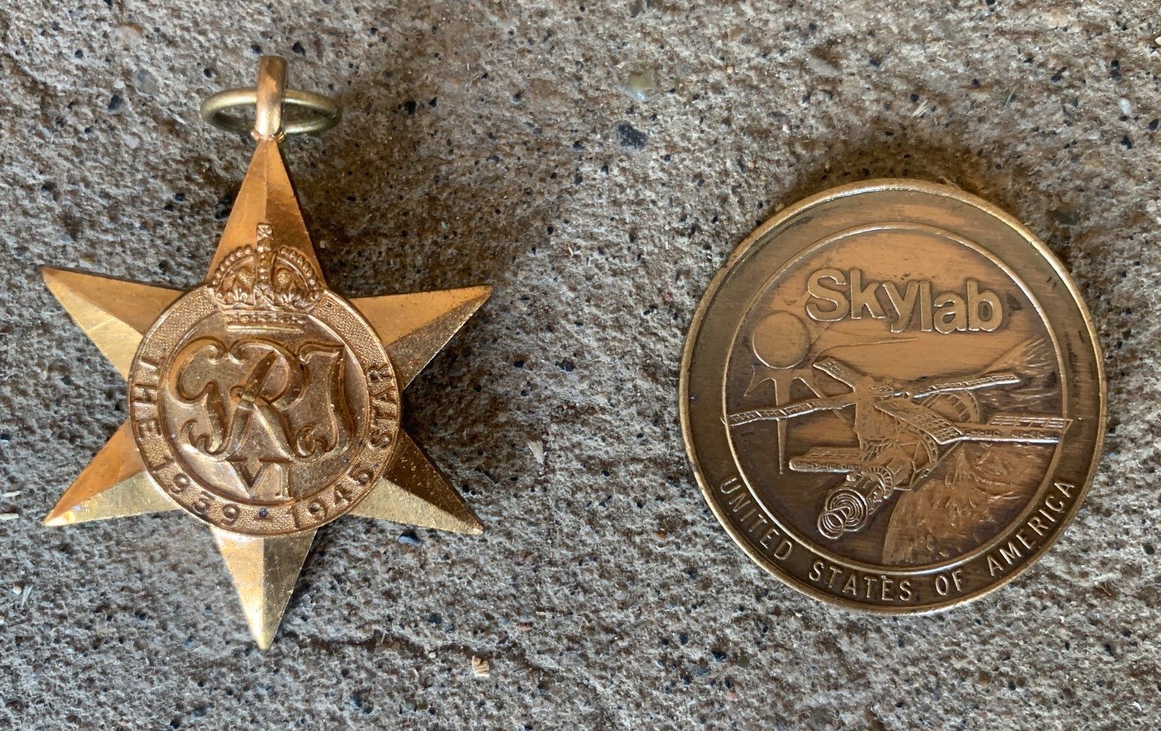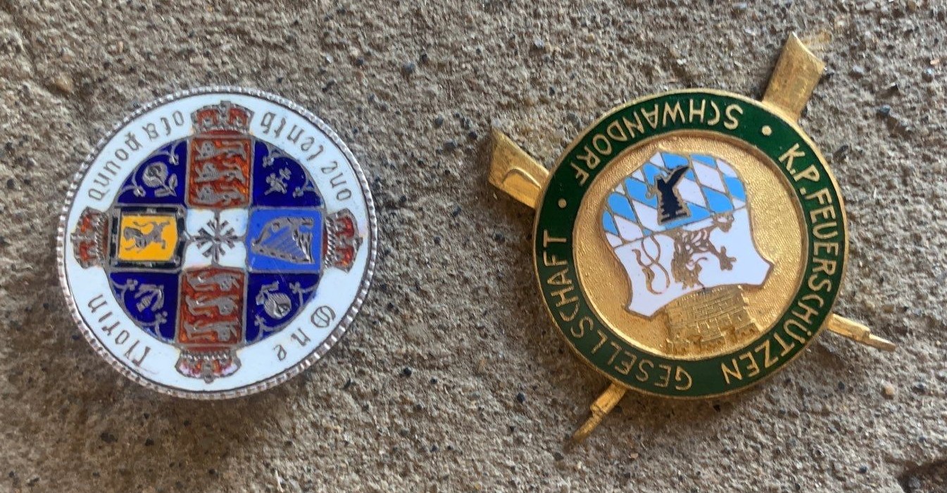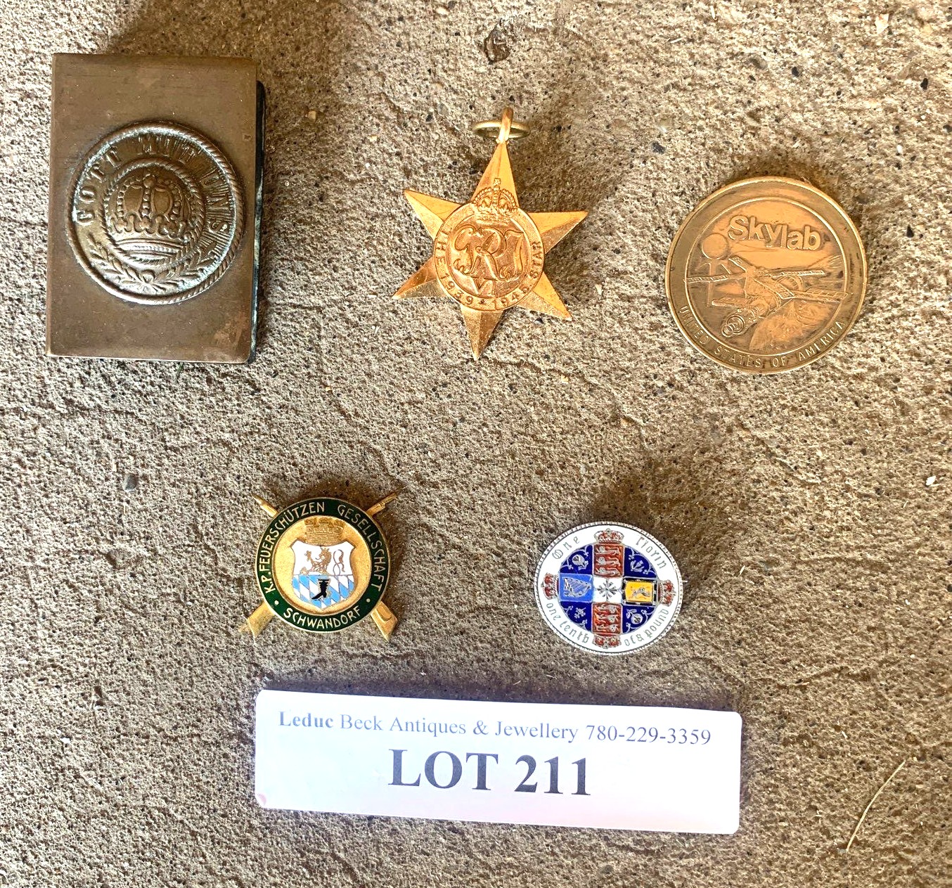 Also incl 1973 Skylab Medallion, One Florin Enamel Pin, K.P. Feuerschützen Marksman Schwandorf, Bavaria Pin, Gott Mit Uns Match Safe