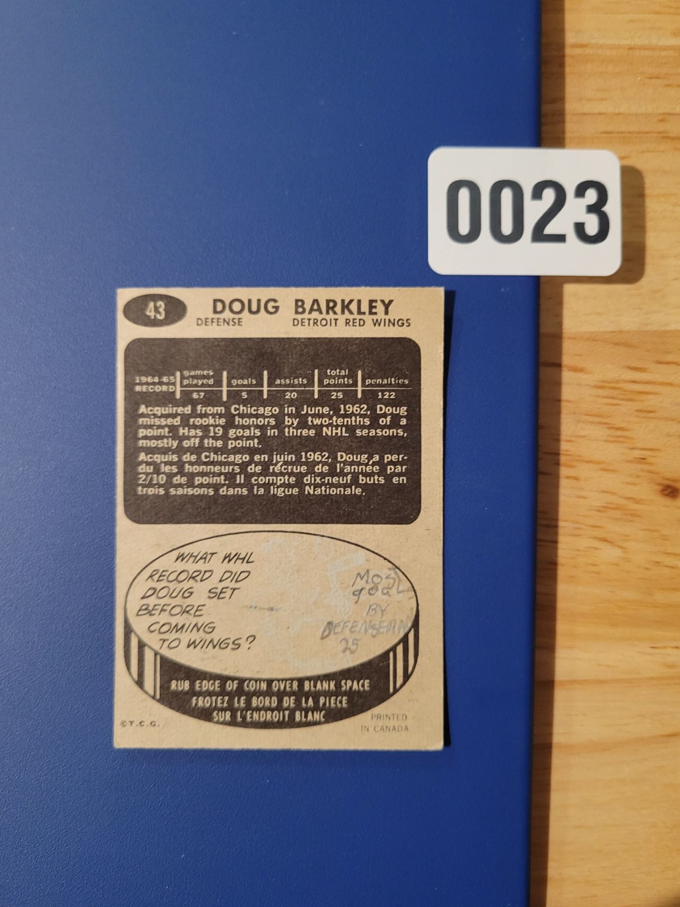 1964-65 Red Wings Goalie - Doug Barkley #43