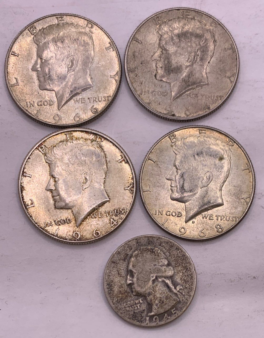 1964 US Half Dollars 12.6 g Per, 90%; 1966/68 US Half Dollars 11.4g, 40%; 1945 US Quarter 6g 90%