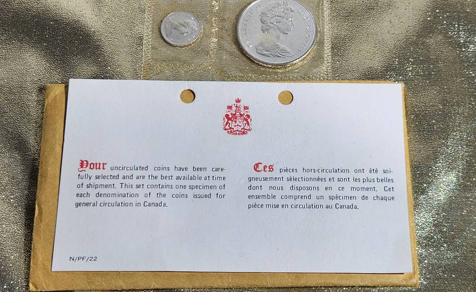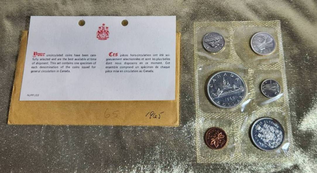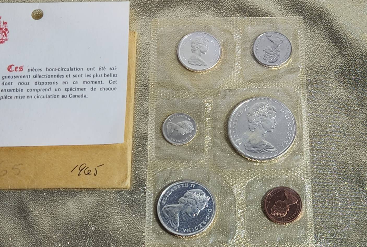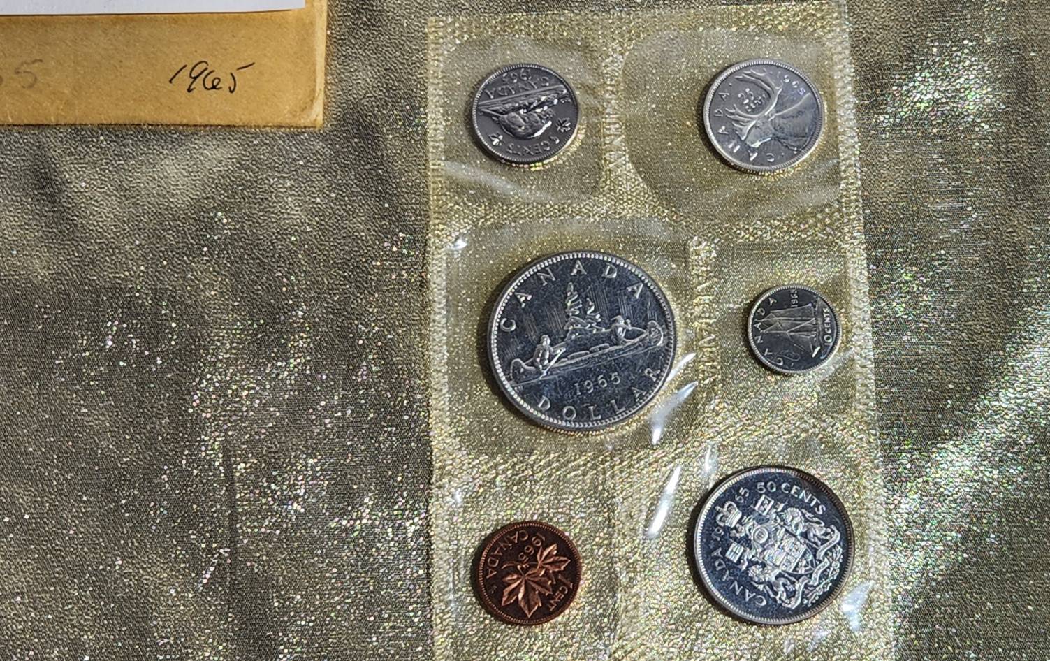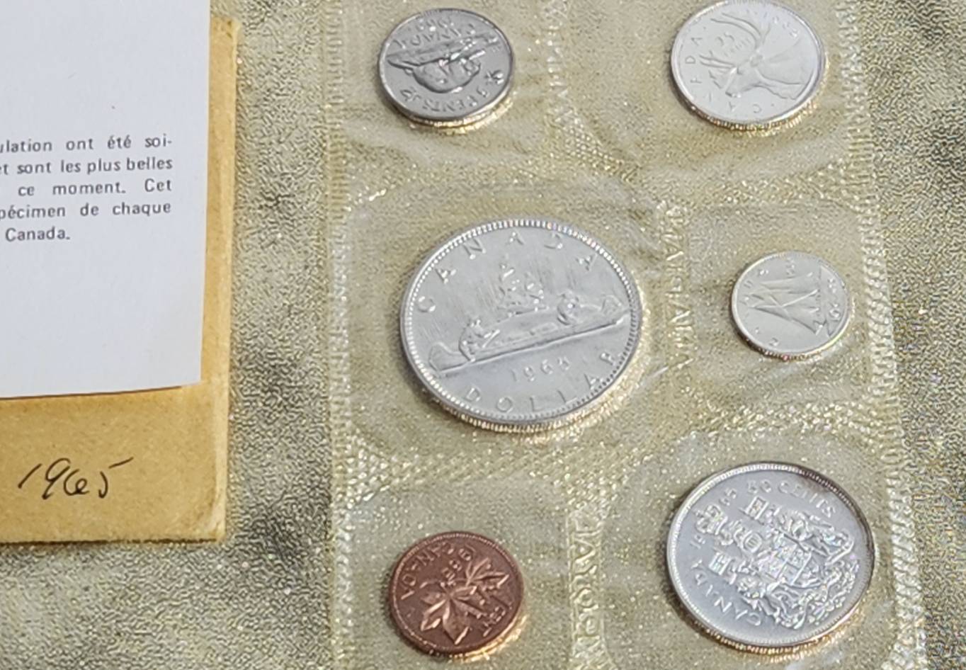 1965 Royal Canadian Mint uncirculated coin set containing six coins: (36 mm diameter), 50 cent coin (27.13 mm diameter), 25 cent coin (23.62 mm diameter), 10 cent coin (18.03 mm diameter), 5 cent coin (21.21 mm diameter), and 1 cent coin (19.05 mm diameter). | Coins are housed in their original sealed plastic casing with accompanying information card. Coins remain uncirculated and exhibit their original finish.