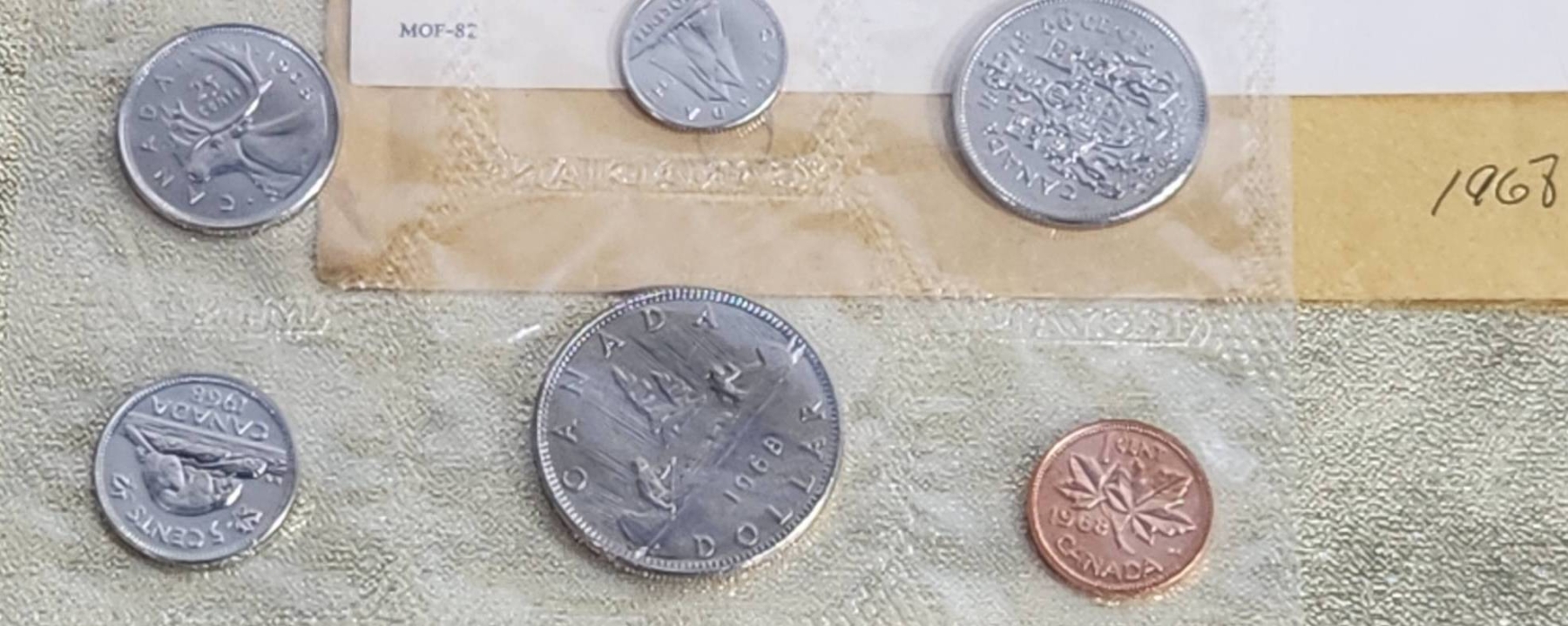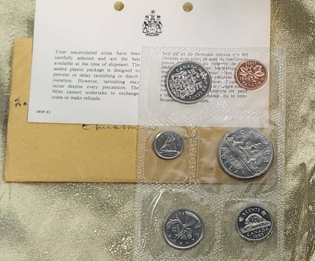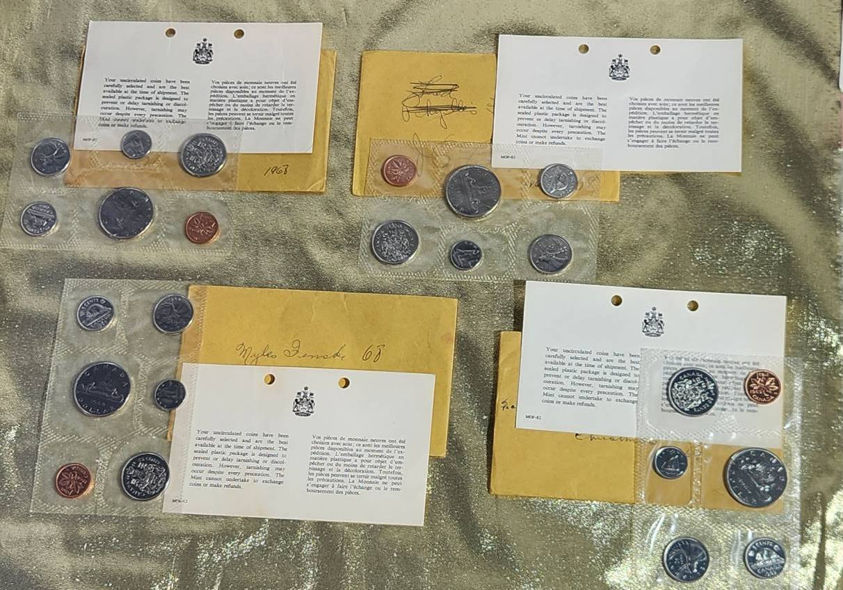 This lot includes three uncirculated coin sets from the Royal Canadian Mint: three from 1968 and one from 1969. | | | Each set is carefully preserved in its original sealed cellophane packaging, accompanied by original descriptive inserts and envelopes. | | | Coins include denominations ranging from 1 cent to $1, with unique designs showcasing Canada's heritage. Packaging dimensions measure approximately 6 x 4 inches per set, ensuring clear visibility of every coin's detail.