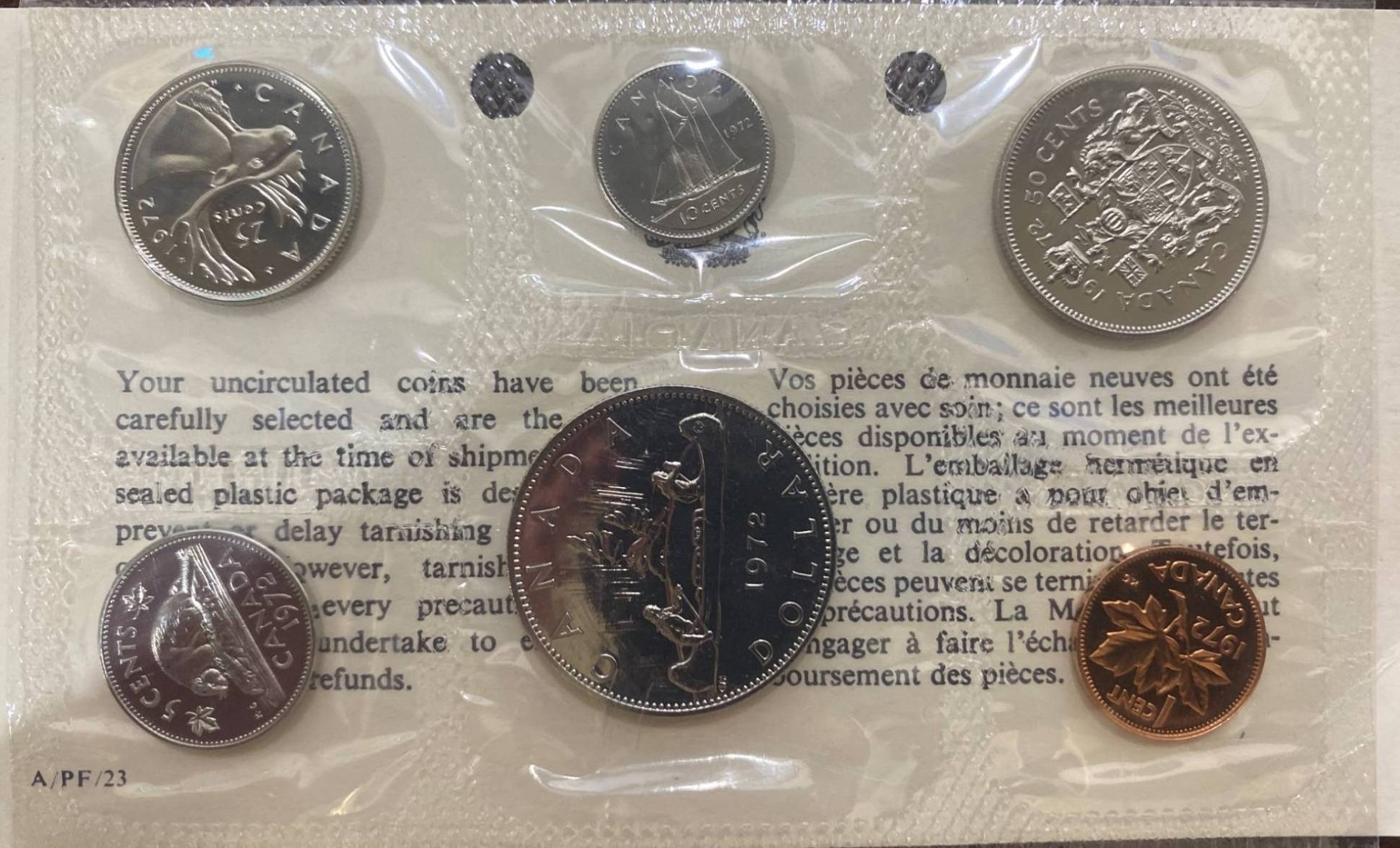 1972 Royal Canadian Mint uncirculated coin set, including six coins: 1 cent, 5 cents, 10 cents, 25 cents, 50 cents, and 1 dollar. All coins remain sealed in their original plastic case with accompanying printed card. Original envelope and packaging included, showcasing the Mint building artwork. Coins exhibit bright mint luster and are preserved in uncirculated condition.