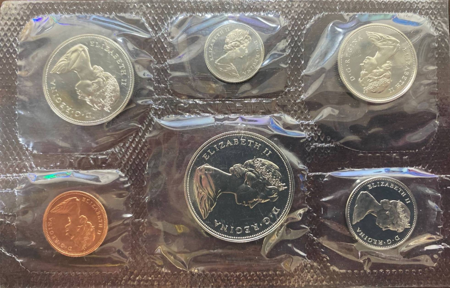 1972 Royal Canadian Mint uncirculated coin set, including six coins: 1 cent, 5 cents, 10 cents, 25 cents, 50 cents, and 1 dollar. All coins remain sealed in their original plastic case with accompanying printed card. Original envelope and packaging included, showcasing the Mint building artwork. Coins exhibit bright mint luster and are preserved in uncirculated condition.