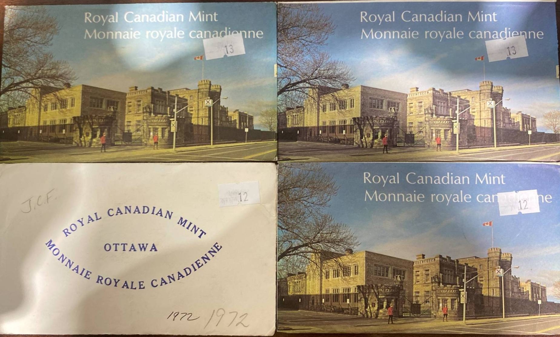 1972 Royal Canadian Mint uncirculated coin set, including six coins: 1 cent, 5 cents, 10 cents, 25 cents, 50 cents, and 1 dollar. All coins remain sealed in their original plastic case with accompanying printed card. Original envelope and packaging included, showcasing the Mint building artwork. Coins exhibit bright mint luster and are preserved in uncirculated condition.