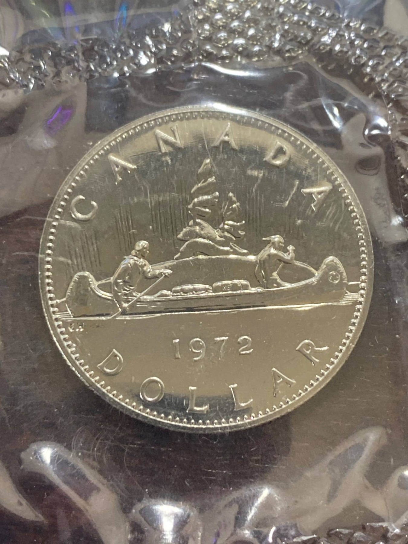 1972 Royal Canadian Mint uncirculated coin set, including six coins: 1 cent, 5 cents, 10 cents, 25 cents, 50 cents, and 1 dollar. All coins remain sealed in their original plastic case with accompanying printed card. Original envelope and packaging included, showcasing the Mint building artwork. Coins exhibit bright mint luster and are preserved in uncirculated condition.