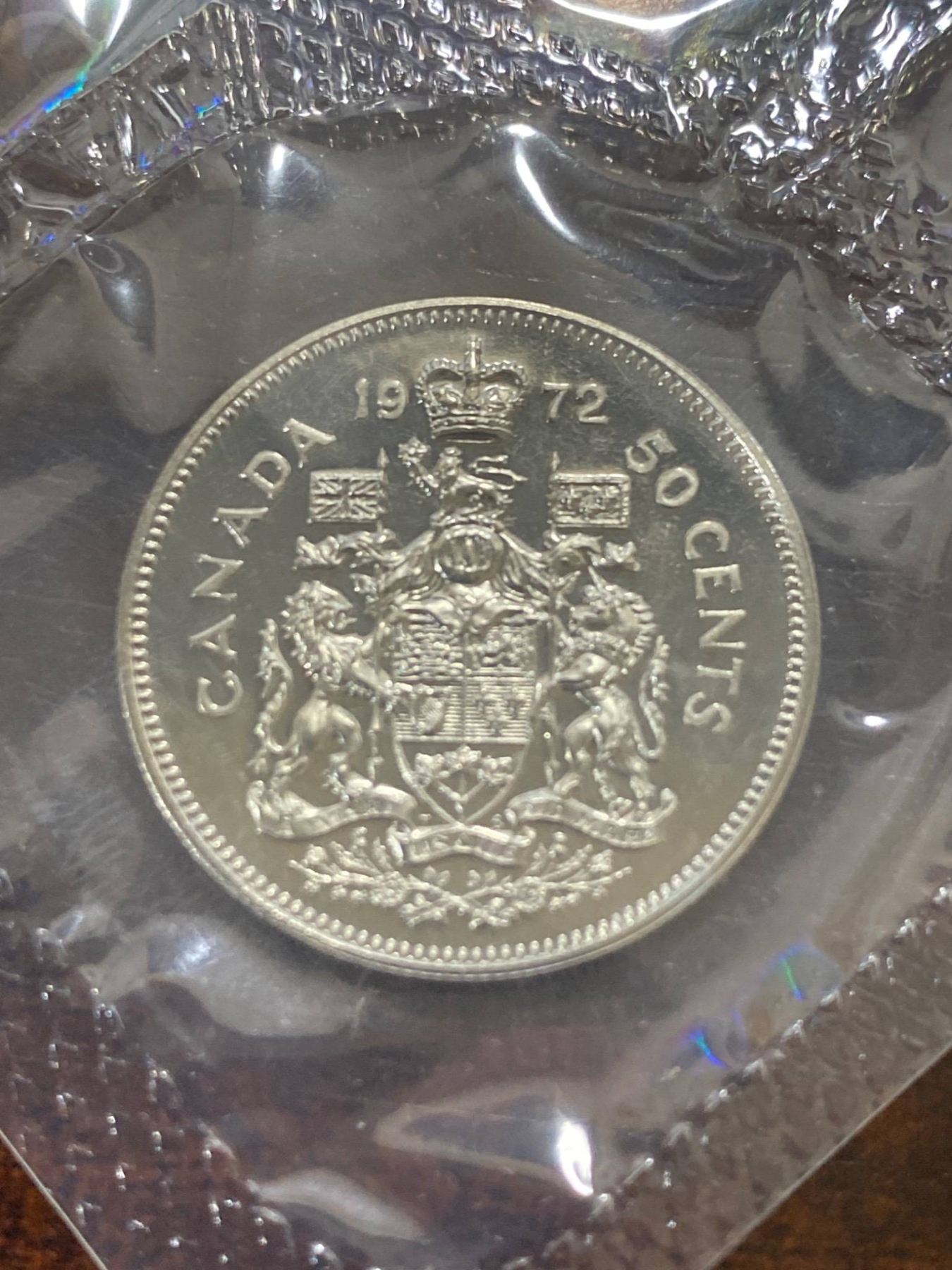 1972 Royal Canadian Mint uncirculated coin set, including six coins: 1 cent, 5 cents, 10 cents, 25 cents, 50 cents, and 1 dollar. All coins remain sealed in their original plastic case with accompanying printed card. Original envelope and packaging included, showcasing the Mint building artwork. Coins exhibit bright mint luster and are preserved in uncirculated condition.