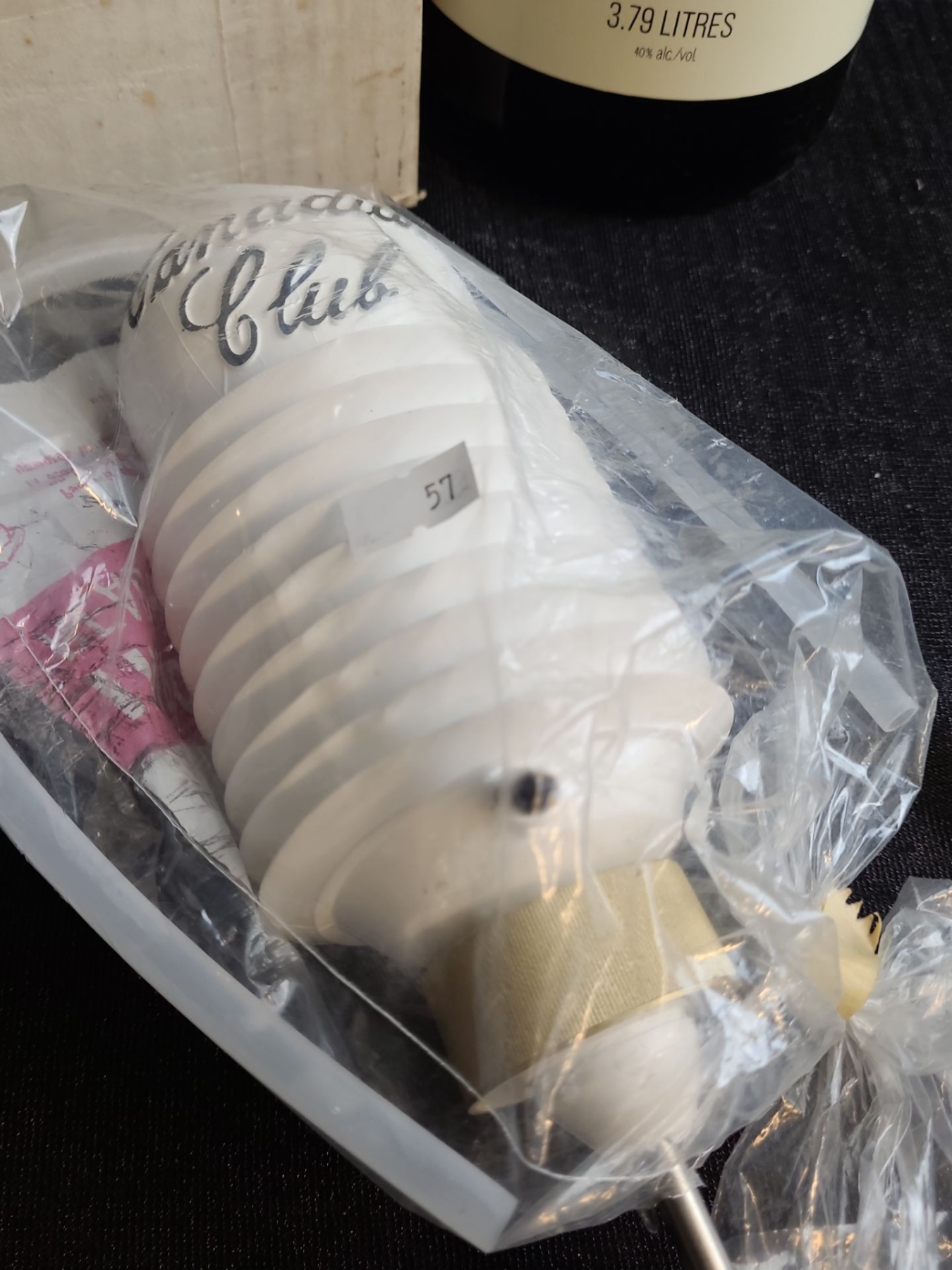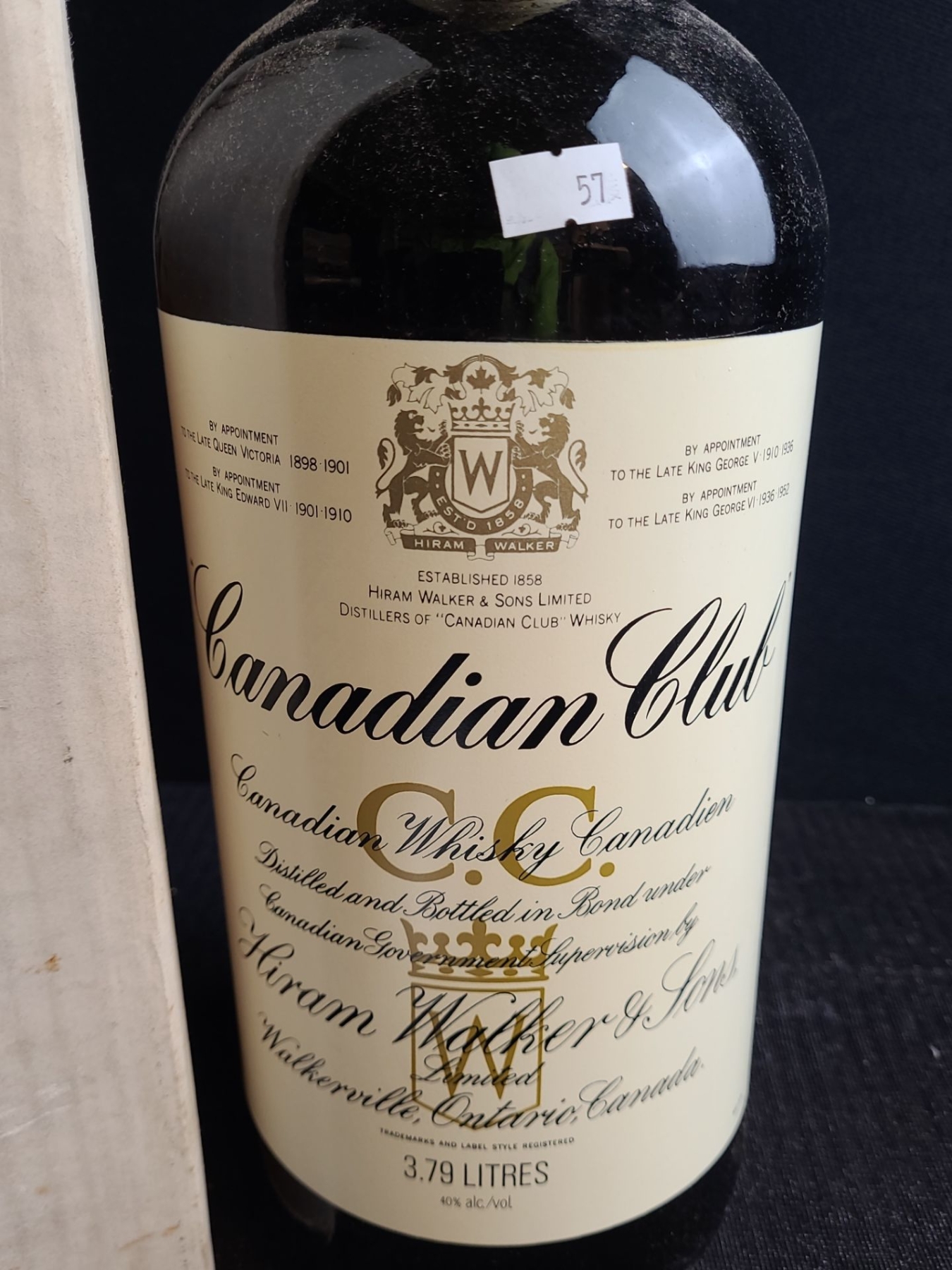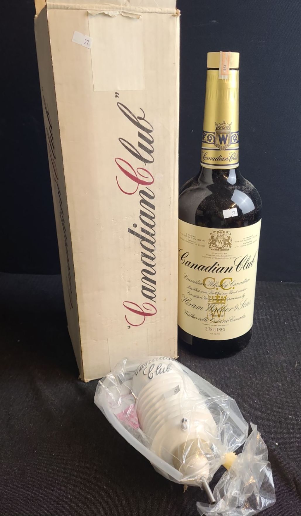 This is vintage Canadian Club Texas Mickey bottle with a pump! Likely made 1973s. A Texas Mickey is an informal Canadian term for a very large bottle of hard liquor, typically holding 3,000 ml or 3 liters. It is also known to be a one US gallon bottle, or 133 1/3 ounces.