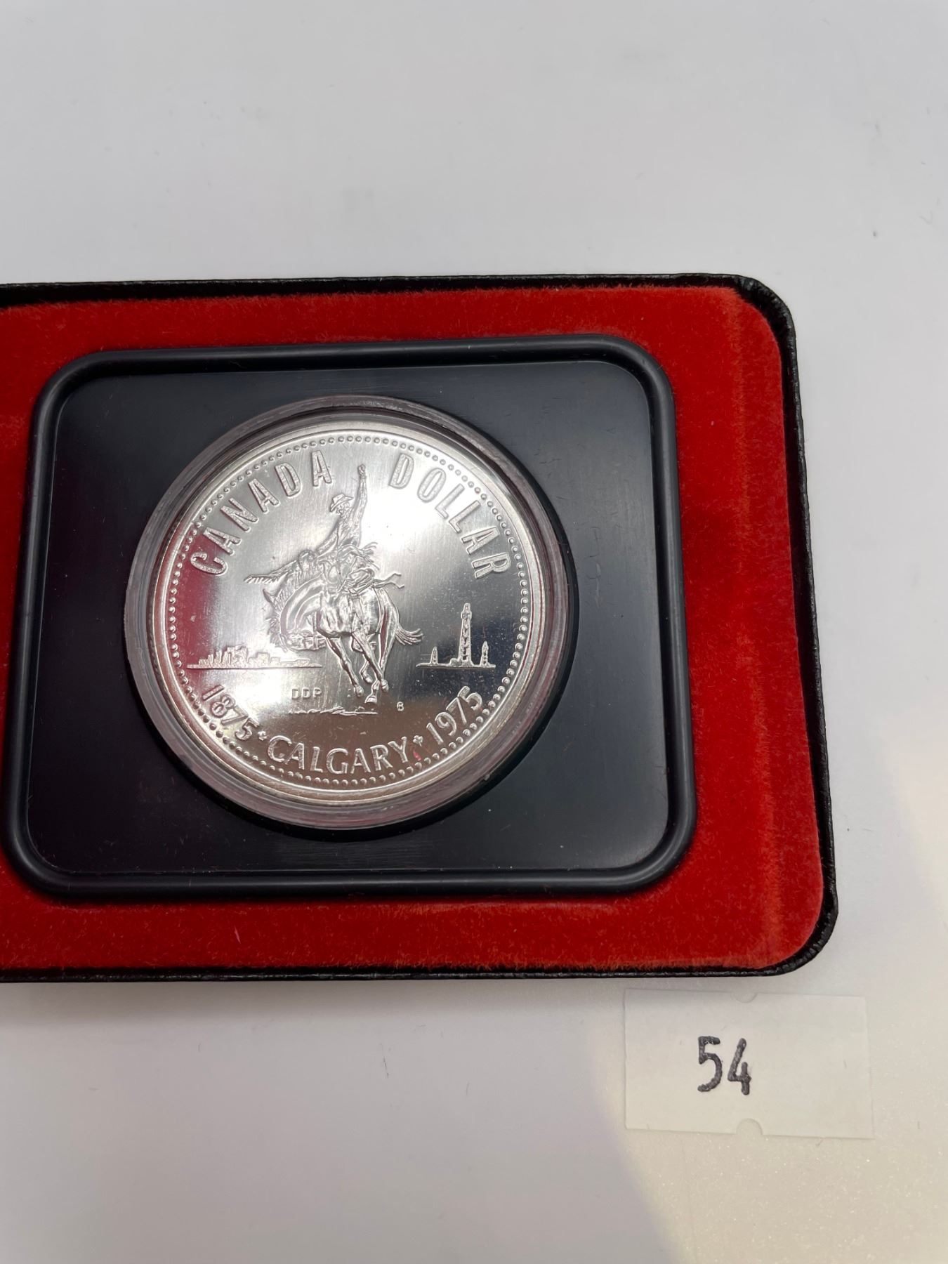 Commemorate the founding of Alberta, with this $1 Calgary Centennial Specimen 1975 Coin. Made from 50% silver and 50% copper, its reverse side comes with an image of a cowboy on top a bucking bronco. Oil wells and a modern city skyline appear in the background. The obverse comes with an effigy of Her Majesty Queen Elizabeth II.