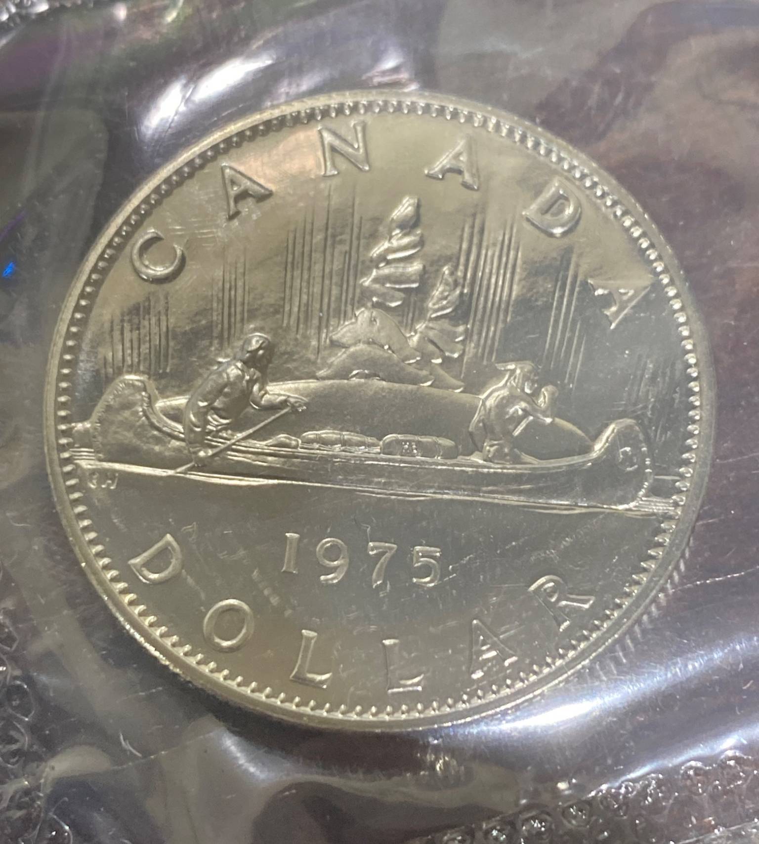1975 Canadian uncirculated coin set presented in its original sealed packaging and includes coins from that year's minting: 1 cent, 5 cents, 10 cents, 25 cents, 50 cents, and 1 dollar. Each coin features detailed imagery, including Queen Elizabeth II's profile on the obverse and various Canadian motifs on the reverse. A collector's information card is included.