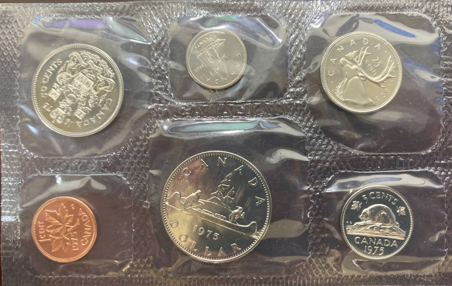 1975 Canadian uncirculated coin set presented in its original sealed packaging and includes coins from that year's minting: 1 cent, 5 cents, 10 cents, 25 cents, 50 cents, and 1 dollar. Each coin features detailed imagery, including Queen Elizabeth II's profile on the obverse and various Canadian motifs on the reverse. A collector's information card is included.