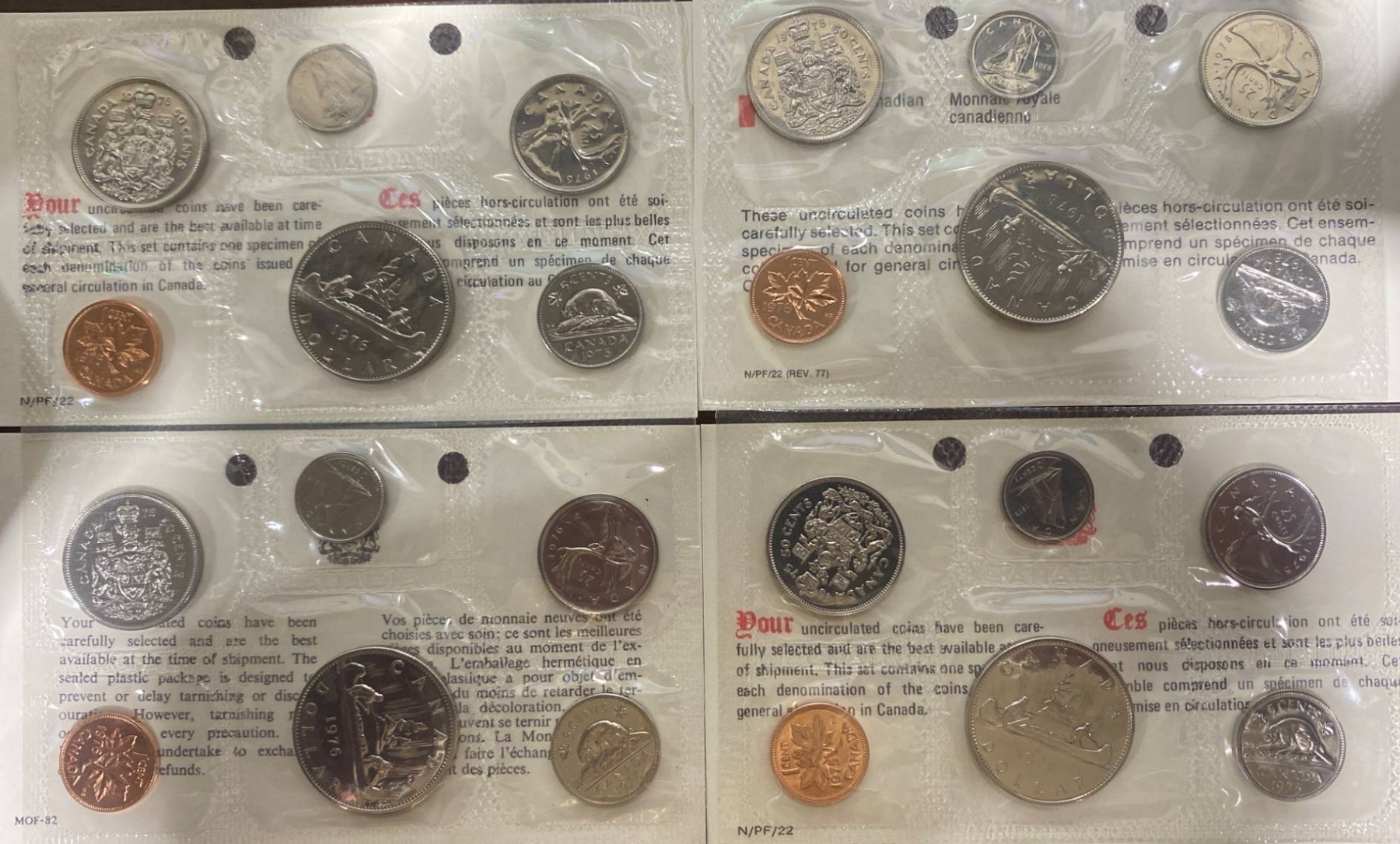 1975 Canadian uncirculated coin set presented in its original sealed packaging and includes coins from that year's minting: 1 cent, 5 cents, 10 cents, 25 cents, 50 cents, and 1 dollar. Each coin features detailed imagery, including Queen Elizabeth II's profile on the obverse and various Canadian motifs on the reverse. A collector's information card is included.