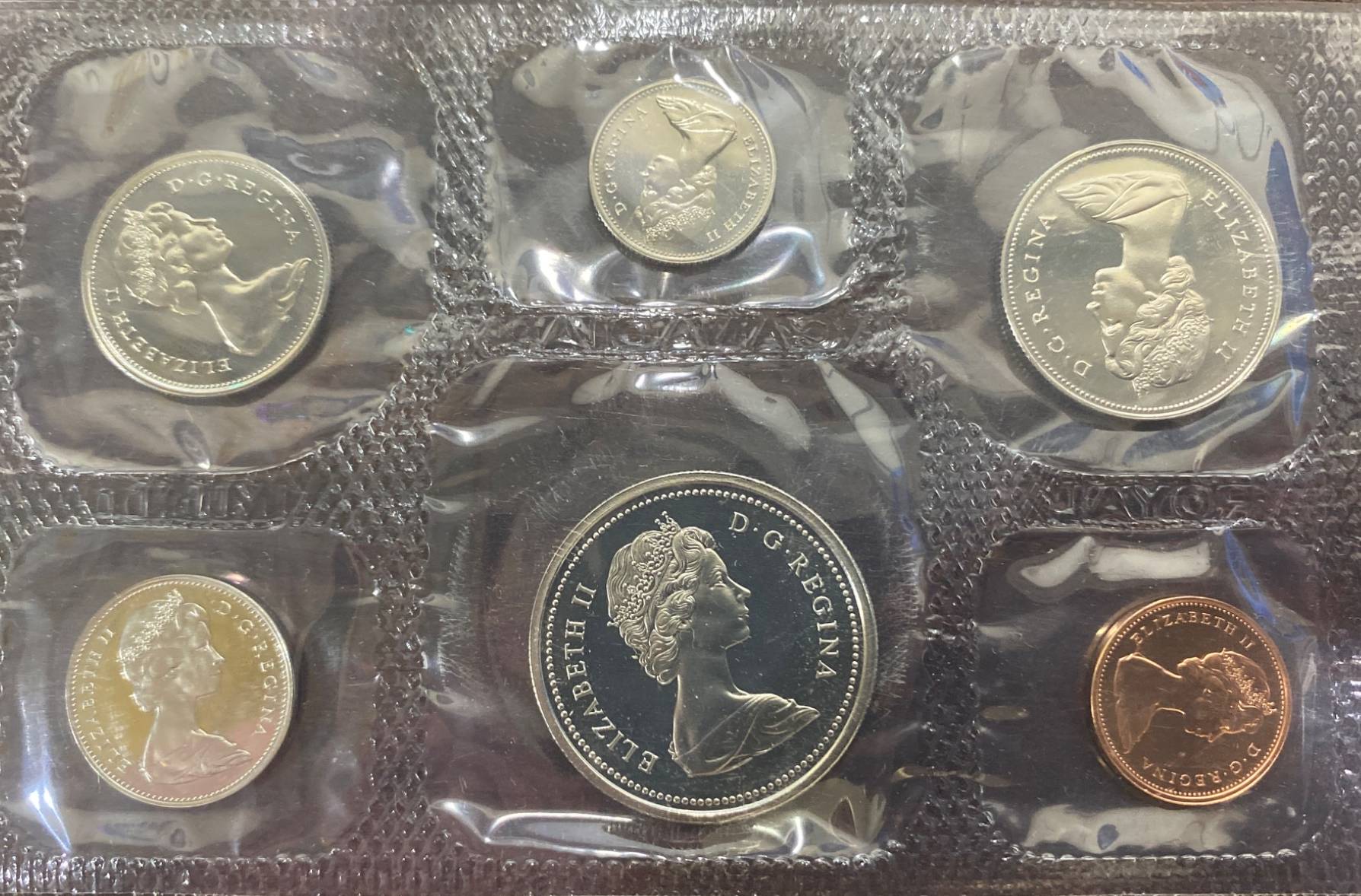 1975 Canadian uncirculated coin set presented in its original sealed packaging and includes coins from that year's minting: 1 cent, 5 cents, 10 cents, 25 cents, 50 cents, and 1 dollar. Each coin features detailed imagery, including Queen Elizabeth II's profile on the obverse and various Canadian motifs on the reverse. A collector's information card is included.