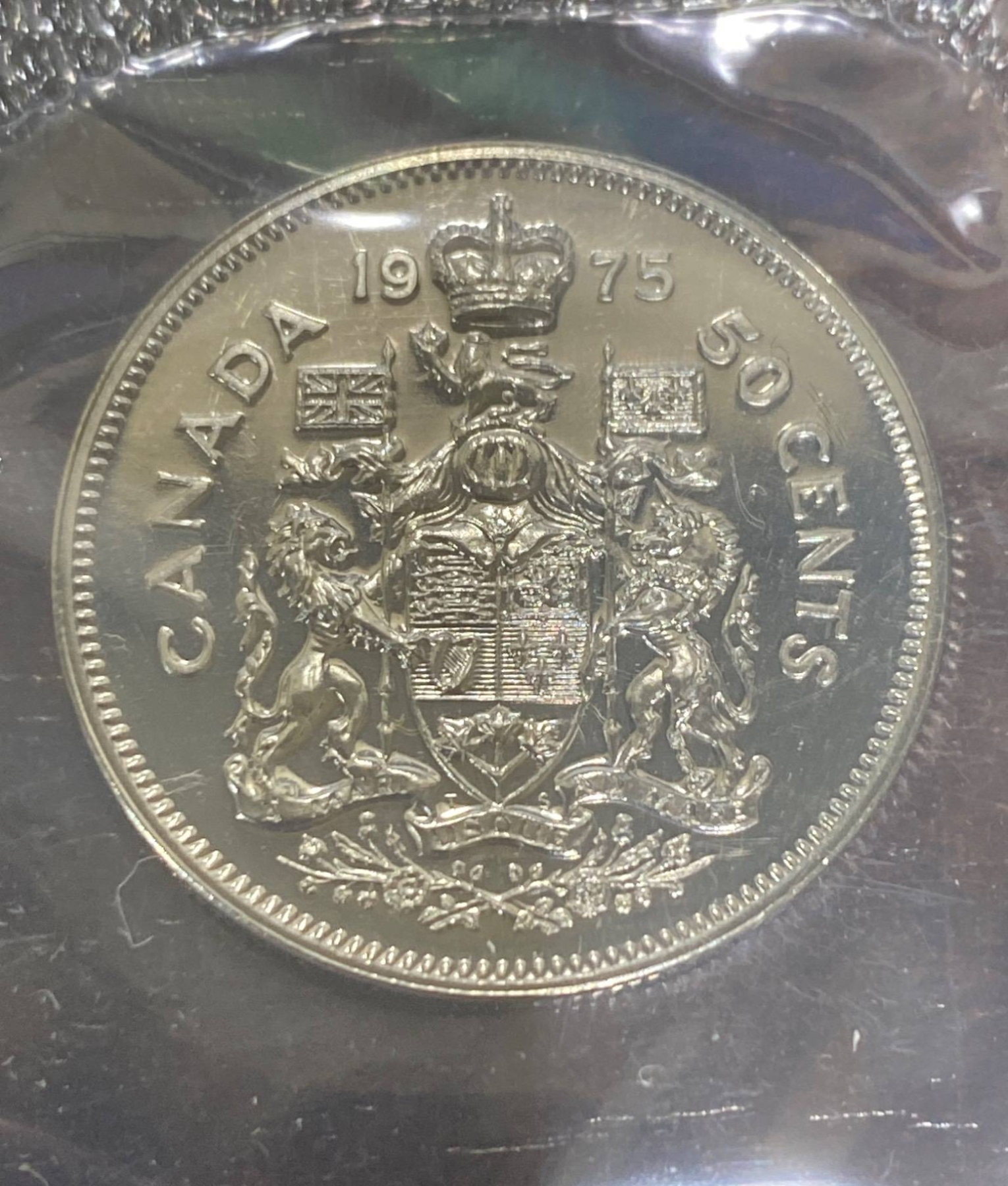 1975 Canadian uncirculated coin set presented in its original sealed packaging and includes coins from that year's minting: 1 cent, 5 cents, 10 cents, 25 cents, 50 cents, and 1 dollar. Each coin features detailed imagery, including Queen Elizabeth II's profile on the obverse and various Canadian motifs on the reverse. A collector's information card is included.
