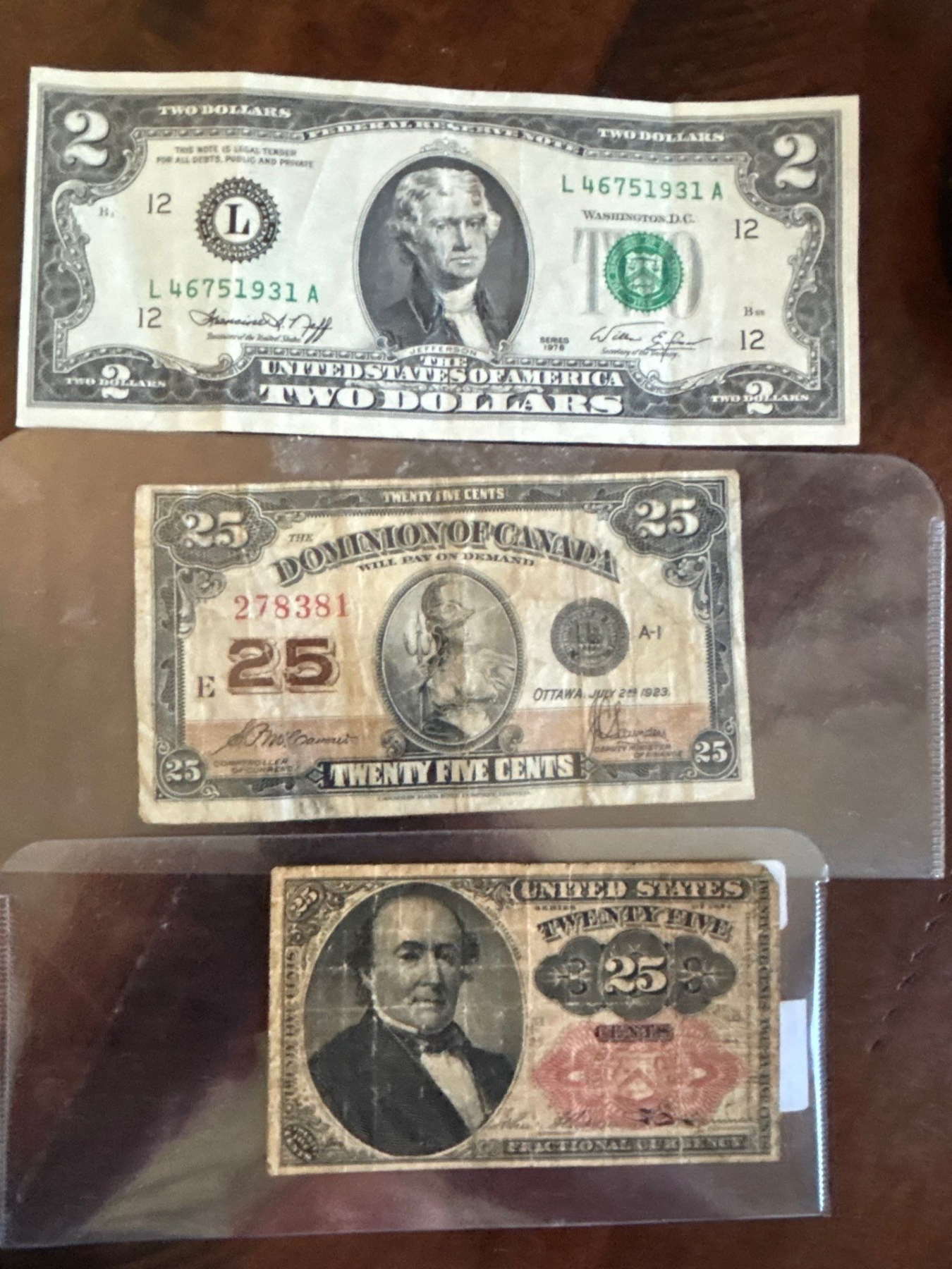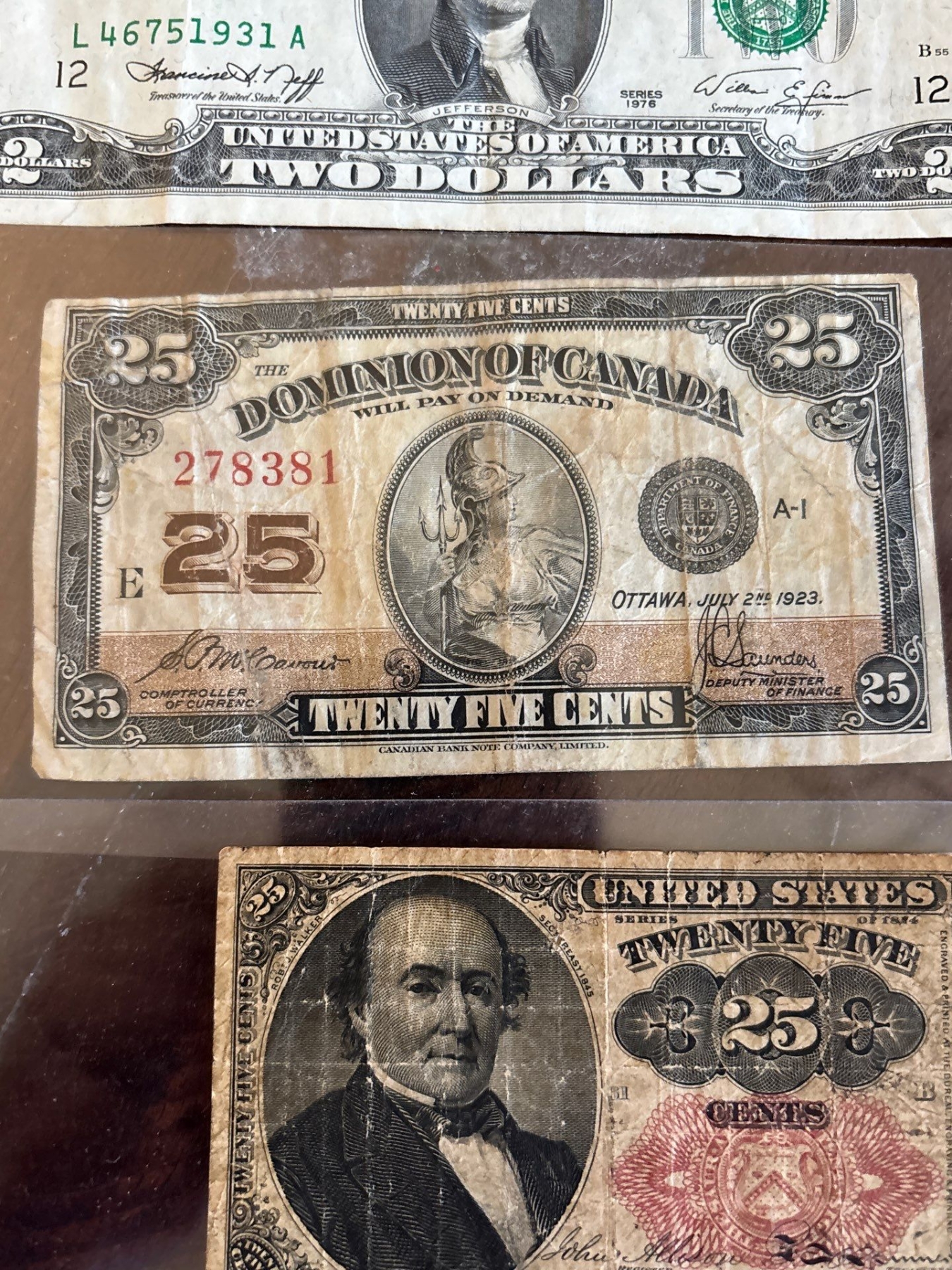 1976 US 2$ 1923 Bill Dominion of canada 25 cent 1874 US 25 Cents