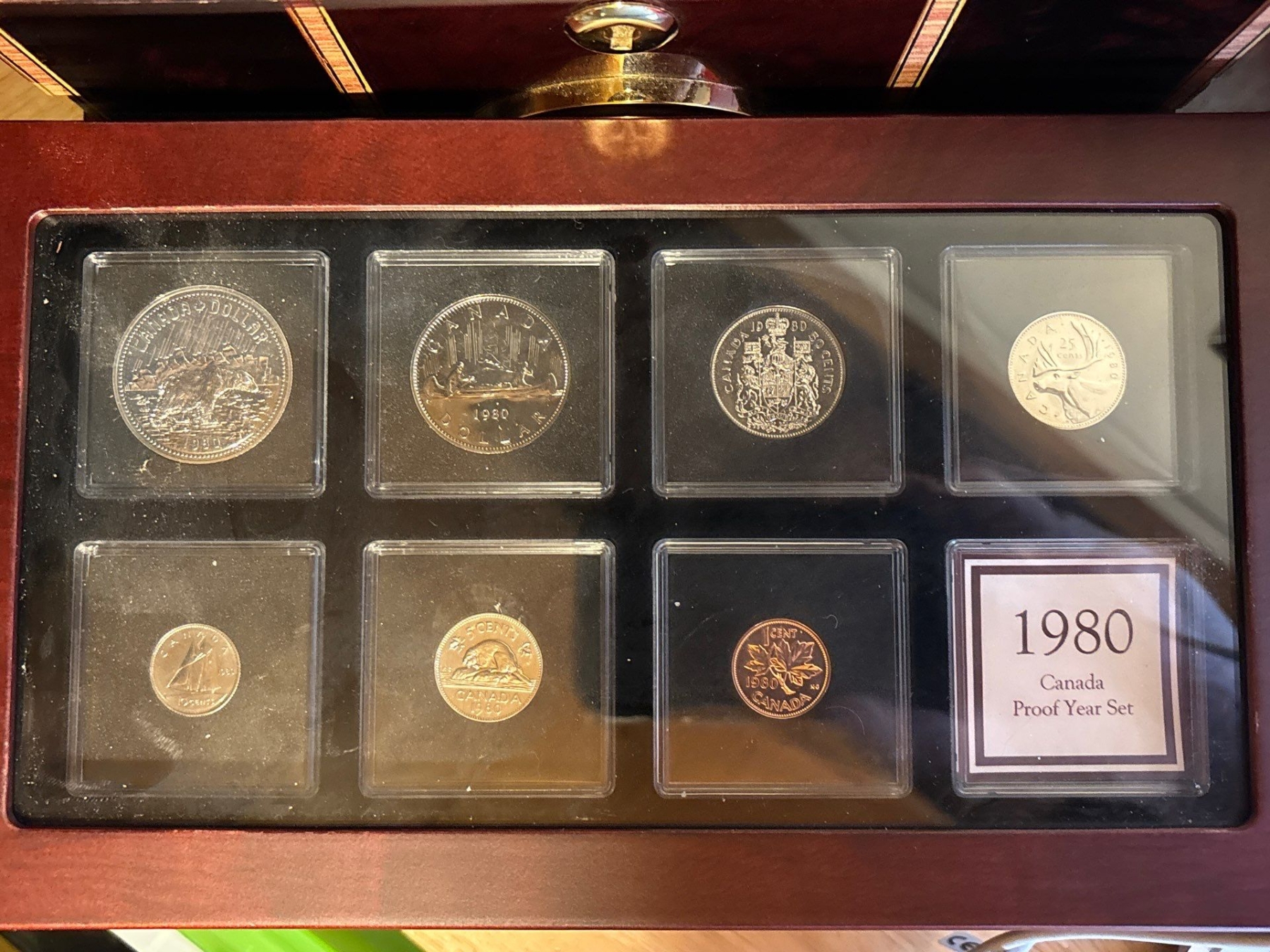 1980 Seven-Piece Mirror Proof Coin Set in Mahogany Finish Case, plus Bonus Twelve Arctic Expedition