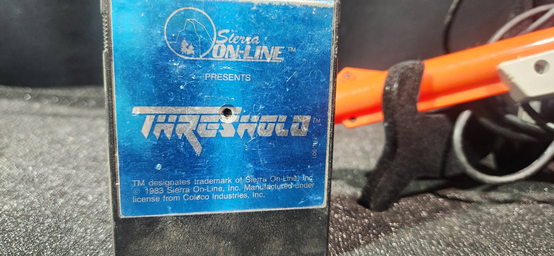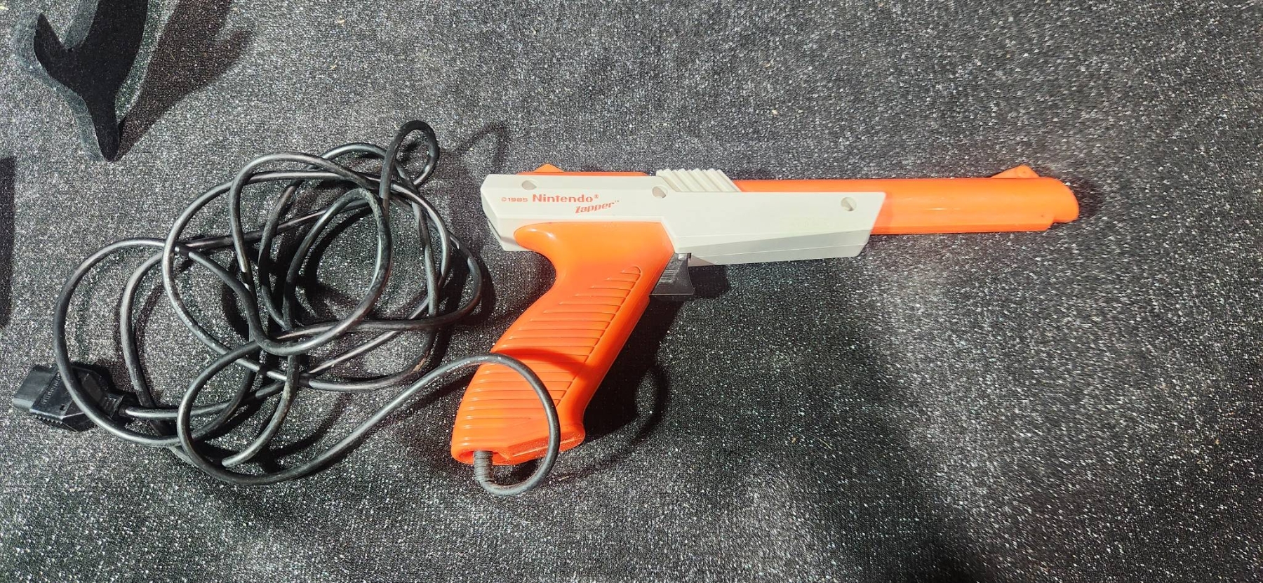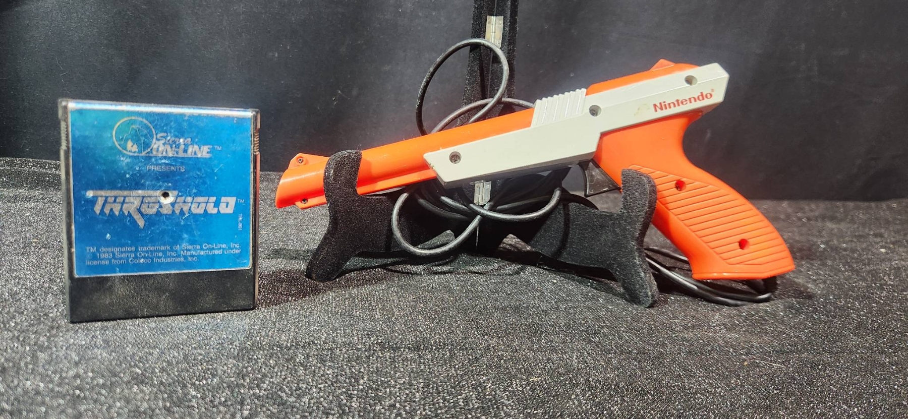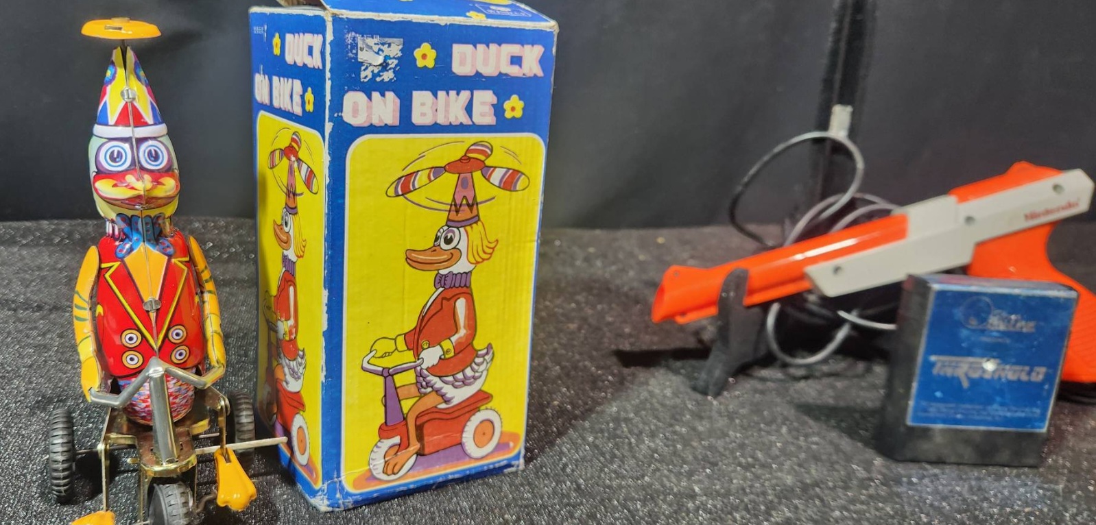 A duo of vintage collectibles that includes a tin wind-up Duck on Bike toy with its original box and a Nintendo NES Zapper Light Gun paired with a Thundervision game cartridge.
