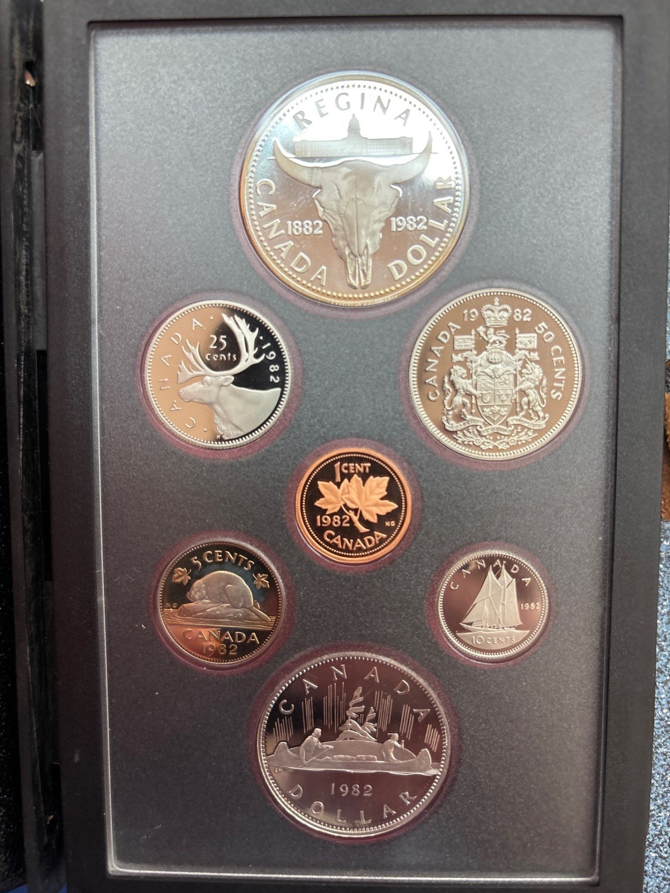 1982 Canadian double dollar set with silver dollar Solver proof set Regina edition .