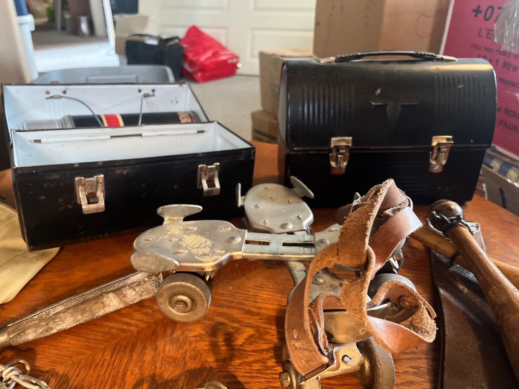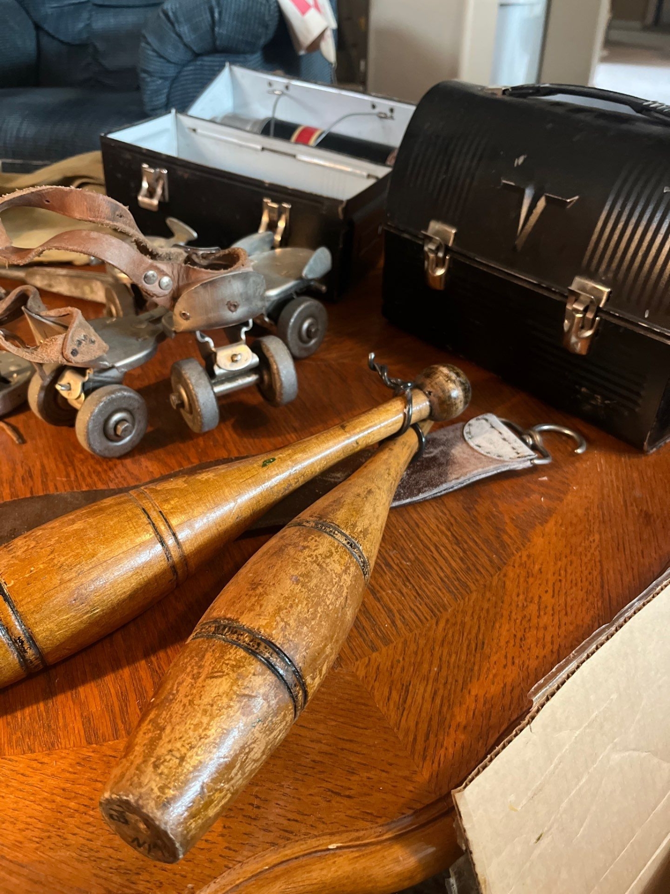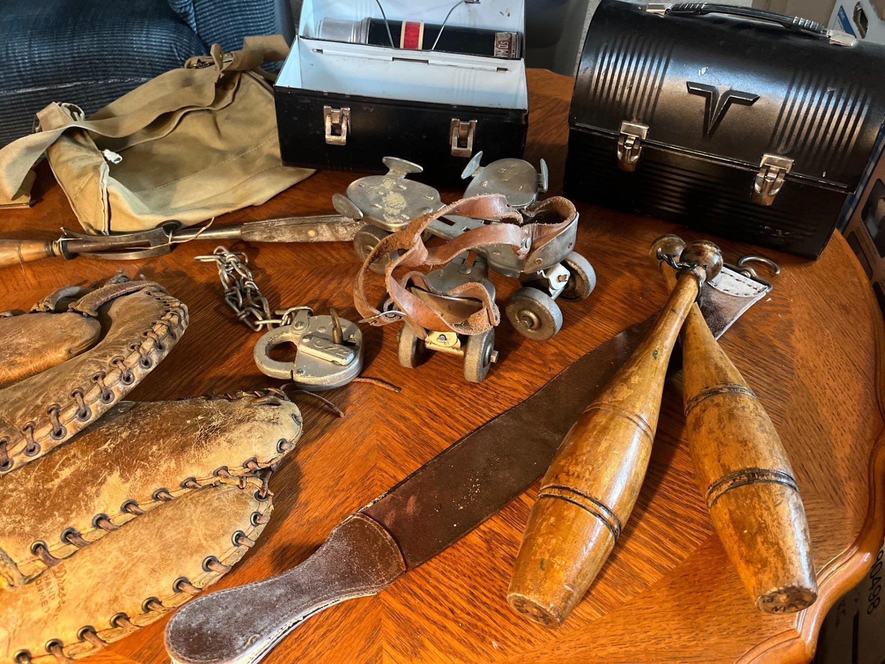 Collection of vintage sports items juggling set rollerskates baseball mitts from the 1950s and two vintage lunch boxes with thermos in one of them