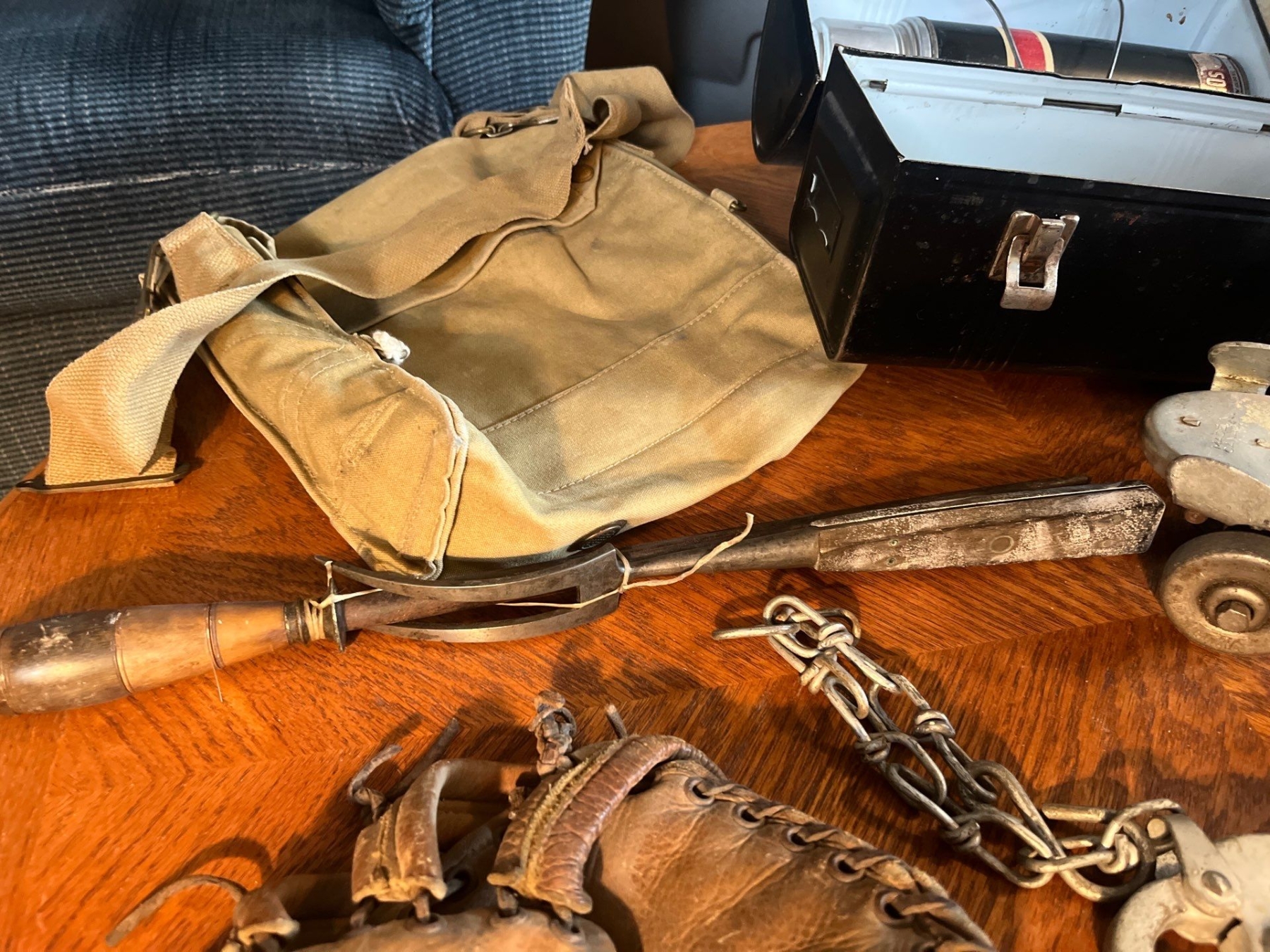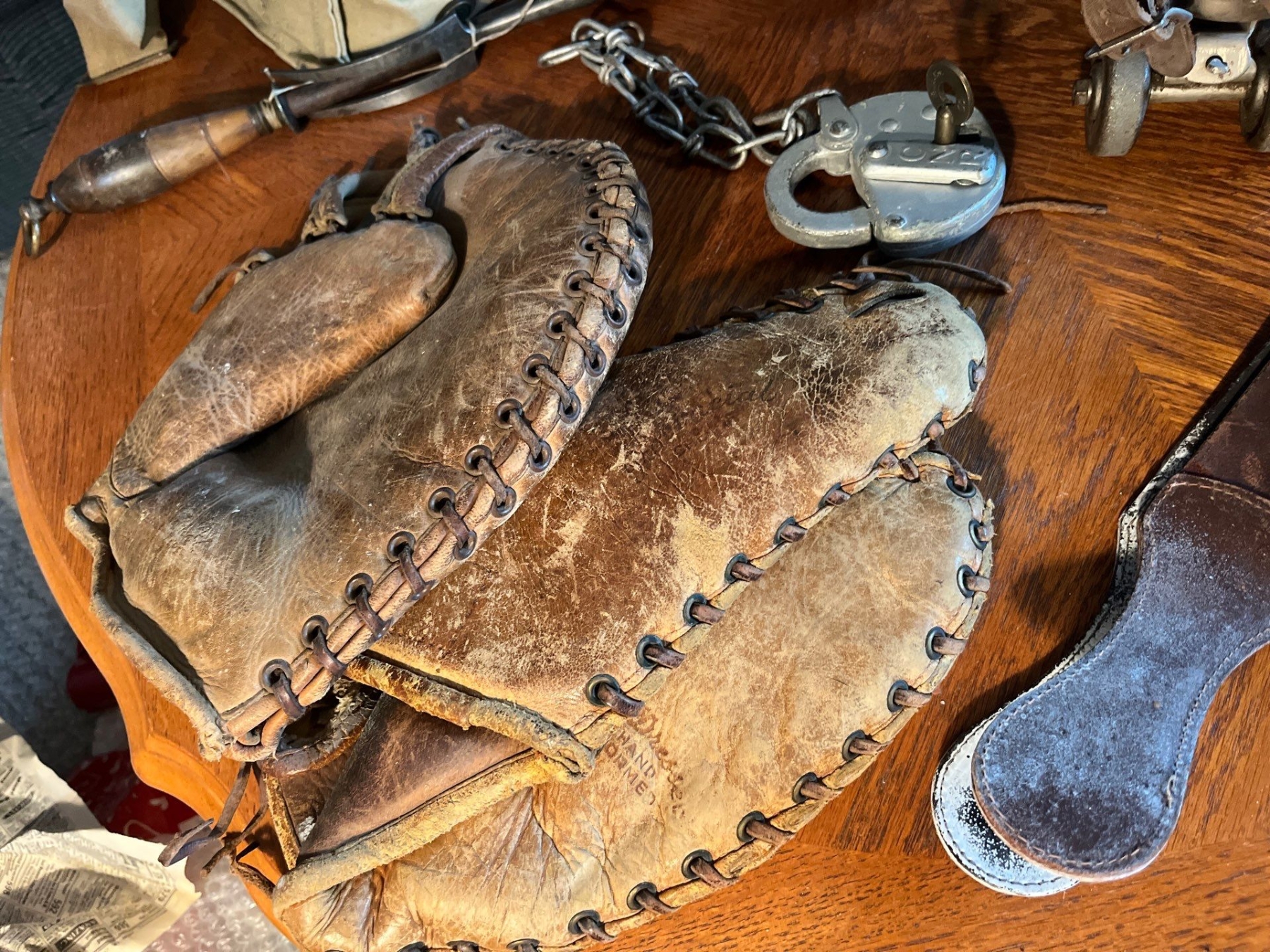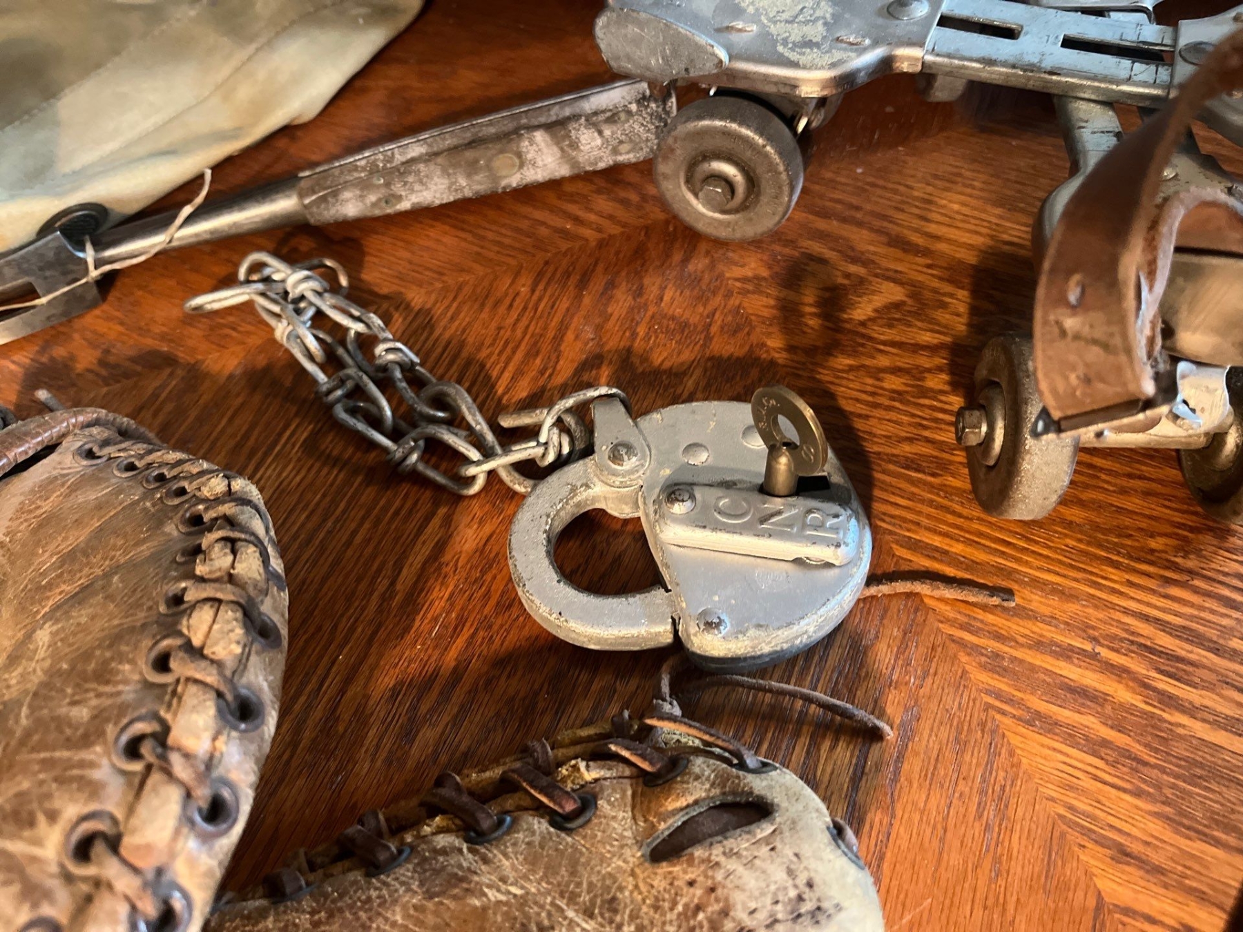 Collection of vintage sports items juggling set rollerskates baseball mitts from the 1950s and two vintage lunch boxes with thermos in one of them