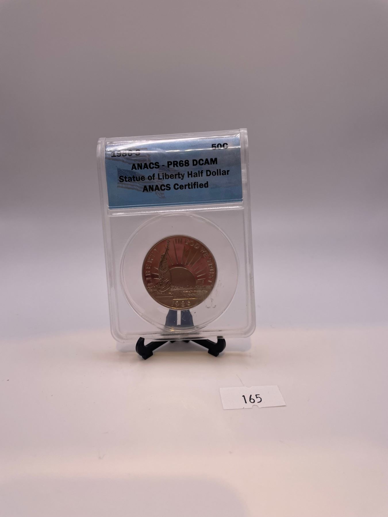 This coin was first struck on October 18, 1985 with production continuing through 1986. The Statue of Liberty Half Dollar coin was authorized in commemoration of the centennial of the Statue of Liberty.The obverse design of the coin features a side view of Liberty and back view of an immigrant ship steaming into New York harbor.