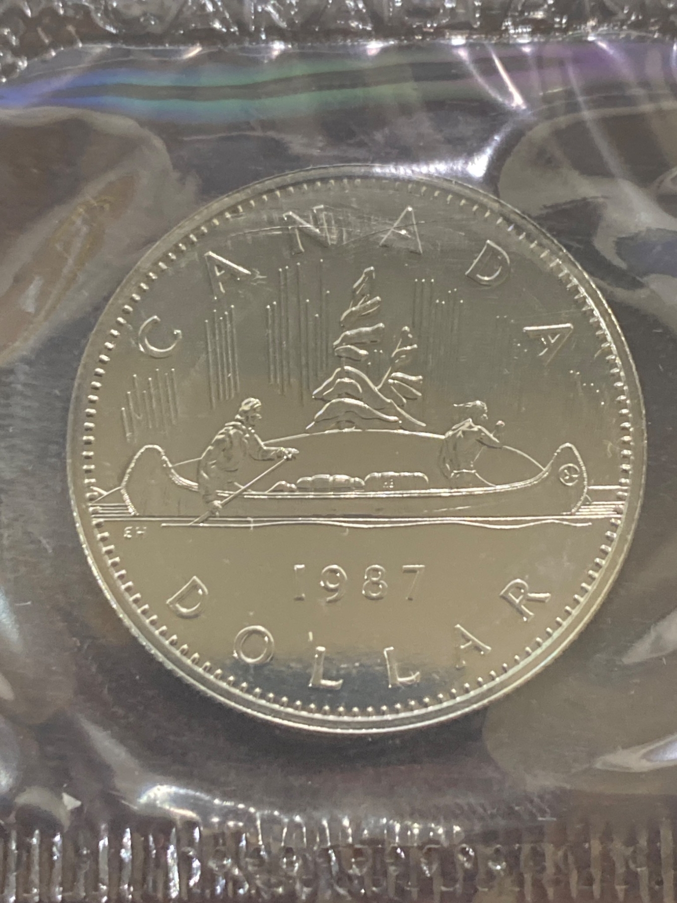 1987 Royal Canadian Mint uncirculated coin set featuring seven coins from the Canadian currency system, including a dollar, 50 cents, 25 cents, 10 cents, 5 cents, and 1 cent. Each coin is sealed in its original mint packaging and accompanied by an informational card. Packaging measures approximately 6.7 x 4 inches. A great collectible or gift for enthusiasts of Canadian numismatics.