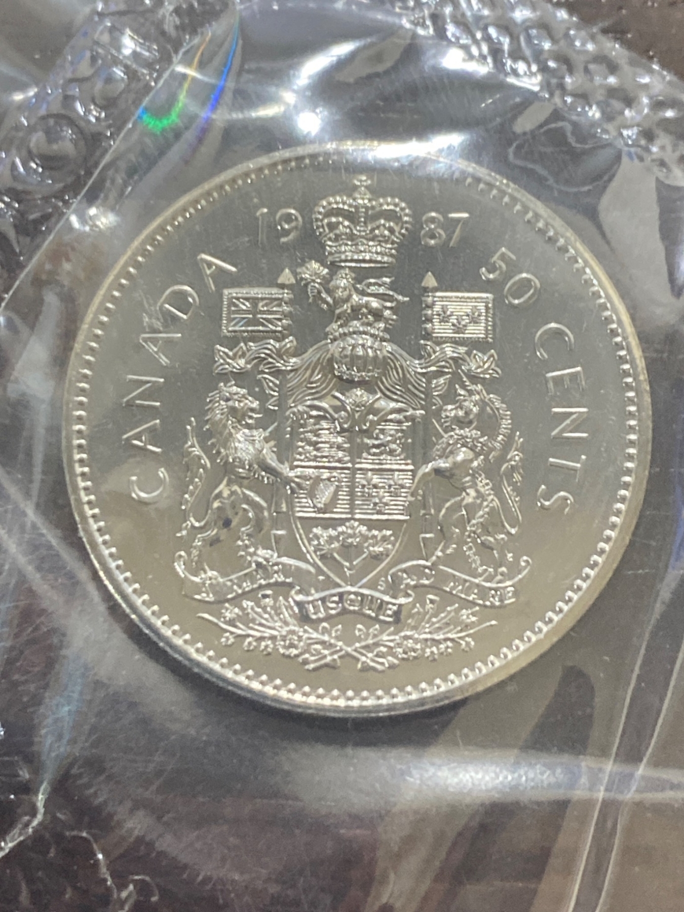 1987 Royal Canadian Mint uncirculated coin set featuring seven coins from the Canadian currency system, including a dollar, 50 cents, 25 cents, 10 cents, 5 cents, and 1 cent. Each coin is sealed in its original mint packaging and accompanied by an informational card. Packaging measures approximately 6.7 x 4 inches. A great collectible or gift for enthusiasts of Canadian numismatics.